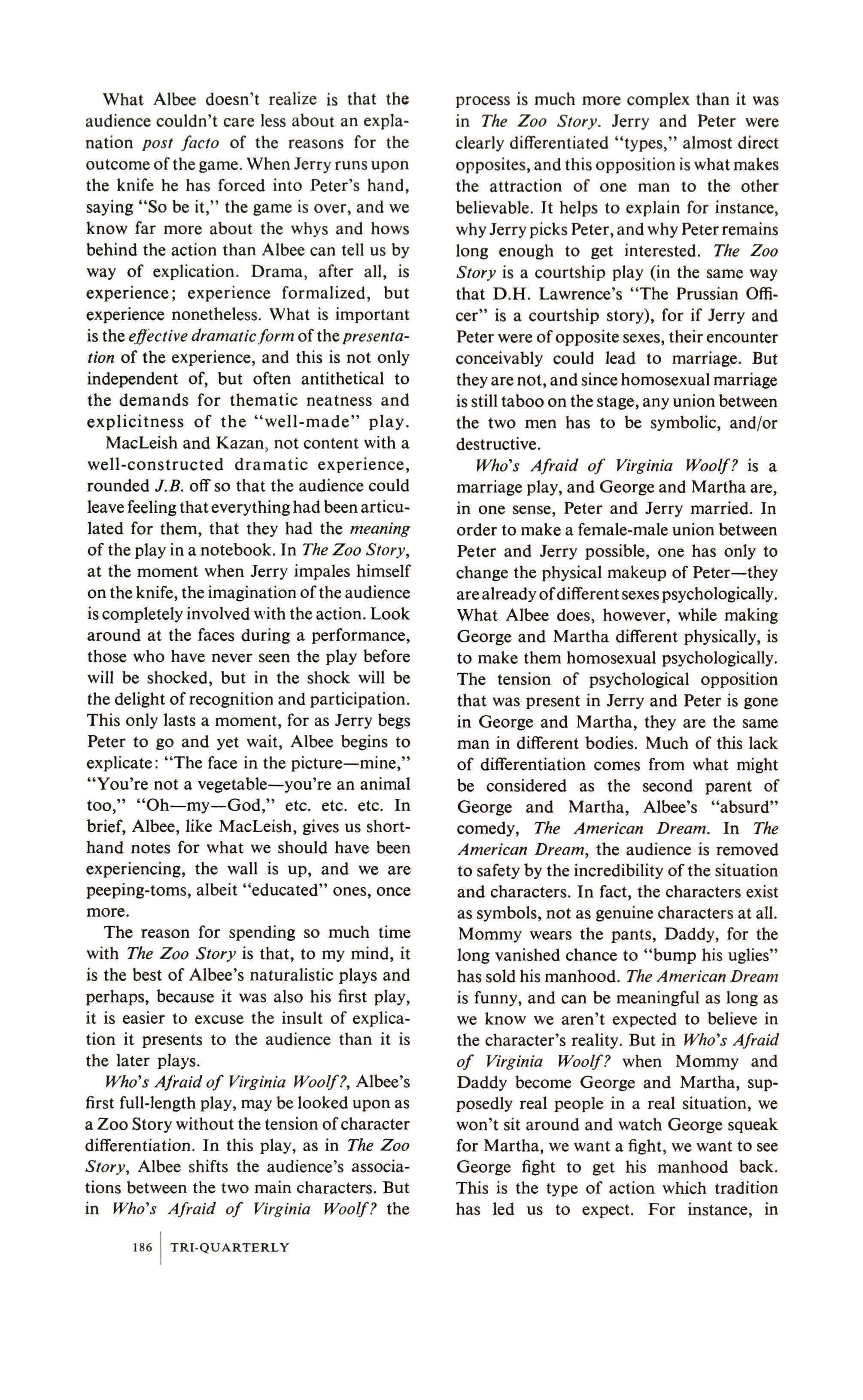 MacLeish and Kazan> not content with a well-constructed dramatic experience, rounded J.B. off so that the audience could leave feeling that everything had been articulated for them, that they had the meaning of the play in a notebook. In The Zoo Story, at the moment when Jerry impales himself on the knife, the imagination of the audience is completely involved with the action. Look around at the faces during a performance, those who have never seen the play before will be shocked, but in the shock will be the delight of recognition and participation. This only lasts a moment, for as Jerry begs Peter to go and yet wait, Albee begins to explicate: "The face in the picture mine," "You're not a vegetable you're an animal too," "Oh my God," etc. etc. etc. In brief, Albee, like MacLeish, gives us shorthand notes for what we should have been experiencing, the wall is up, and we are peeping-toms, albeit "educated" ones, once more.
