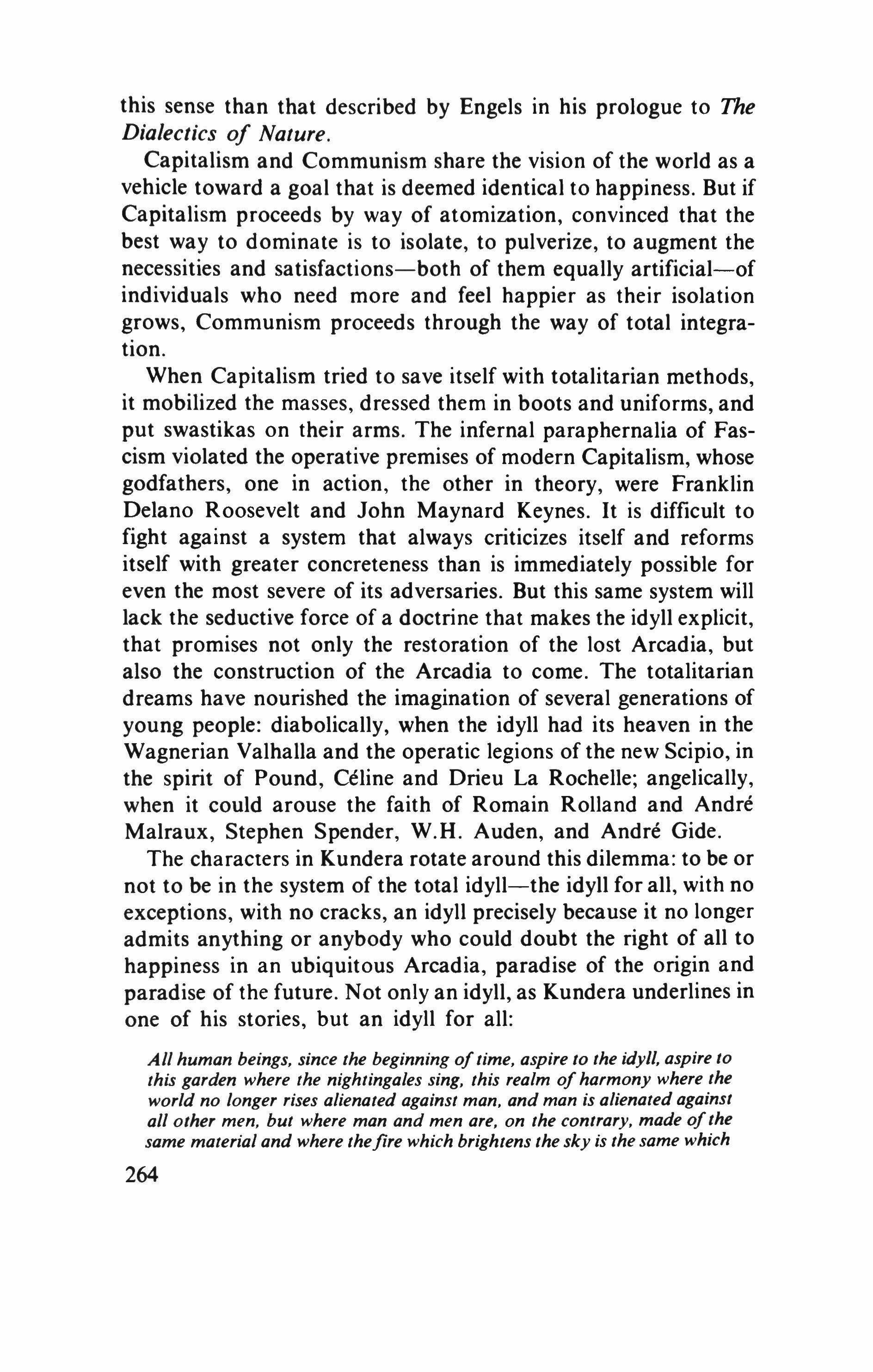 But in the world of the penal laws of Kafka and of the scientific socialism of Kundera, this is no longer possible. The world already has a sense and this sense is given by the law, says Kafka. And Kundera adds, the world of scientific socialism already has a sense and the revolutionary law, which is nothing but objectified history, common and idyllic, gives it to the world. It is useless to search for another meaning. You insist? Then you will be eliminated in the name of the law, the revolution, and history.
