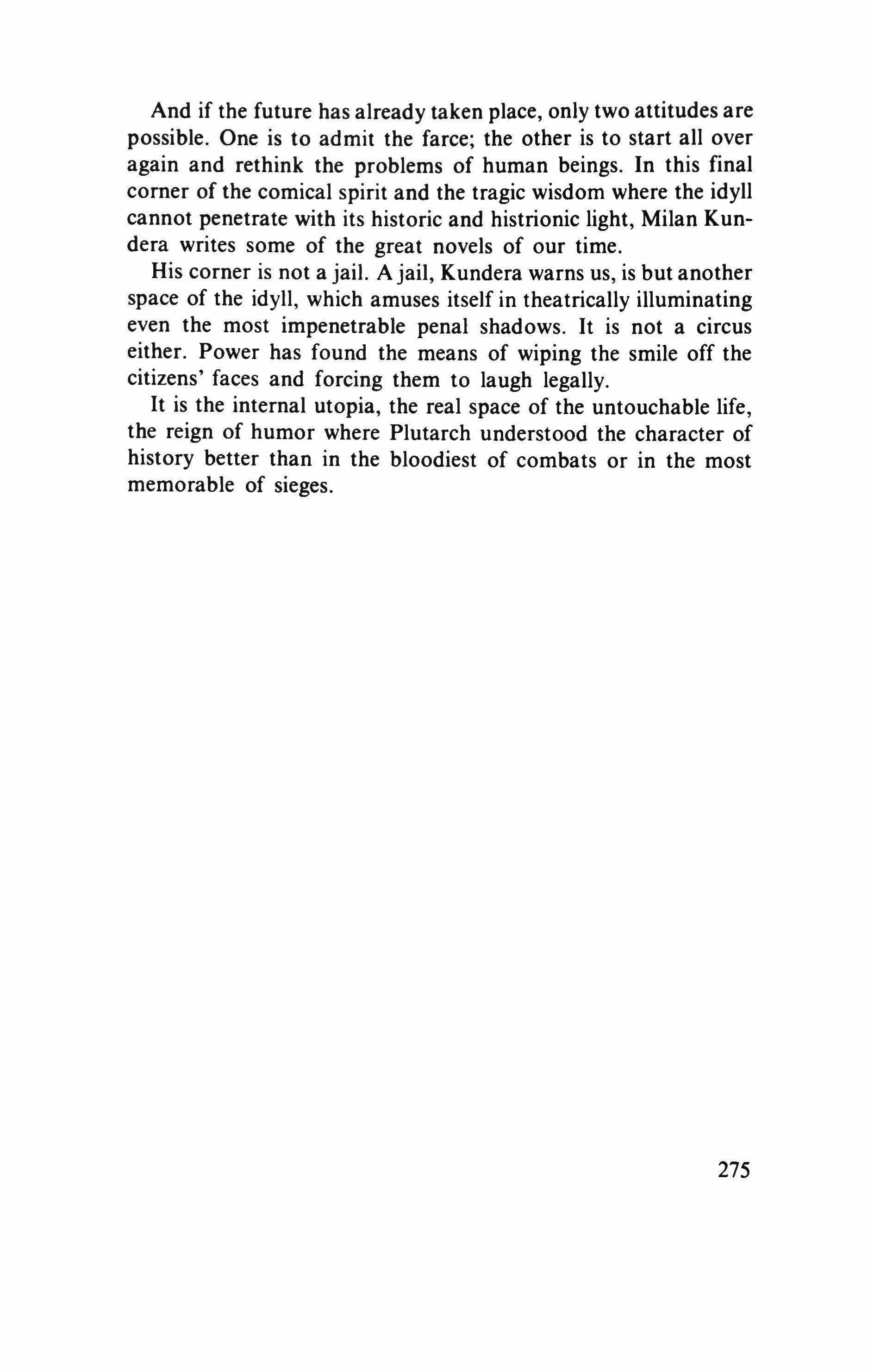 In opposition to the owners of history, Milan Kundera is willing to give it all up for his own destiny and the destiny of his characters outside the "immaculate idyll" that pretends to give all and gives nothing. The illusion of the future has been the idyll of modern history. Kundera dares to say that the future has already taken place, under our noses, and that it stinks.