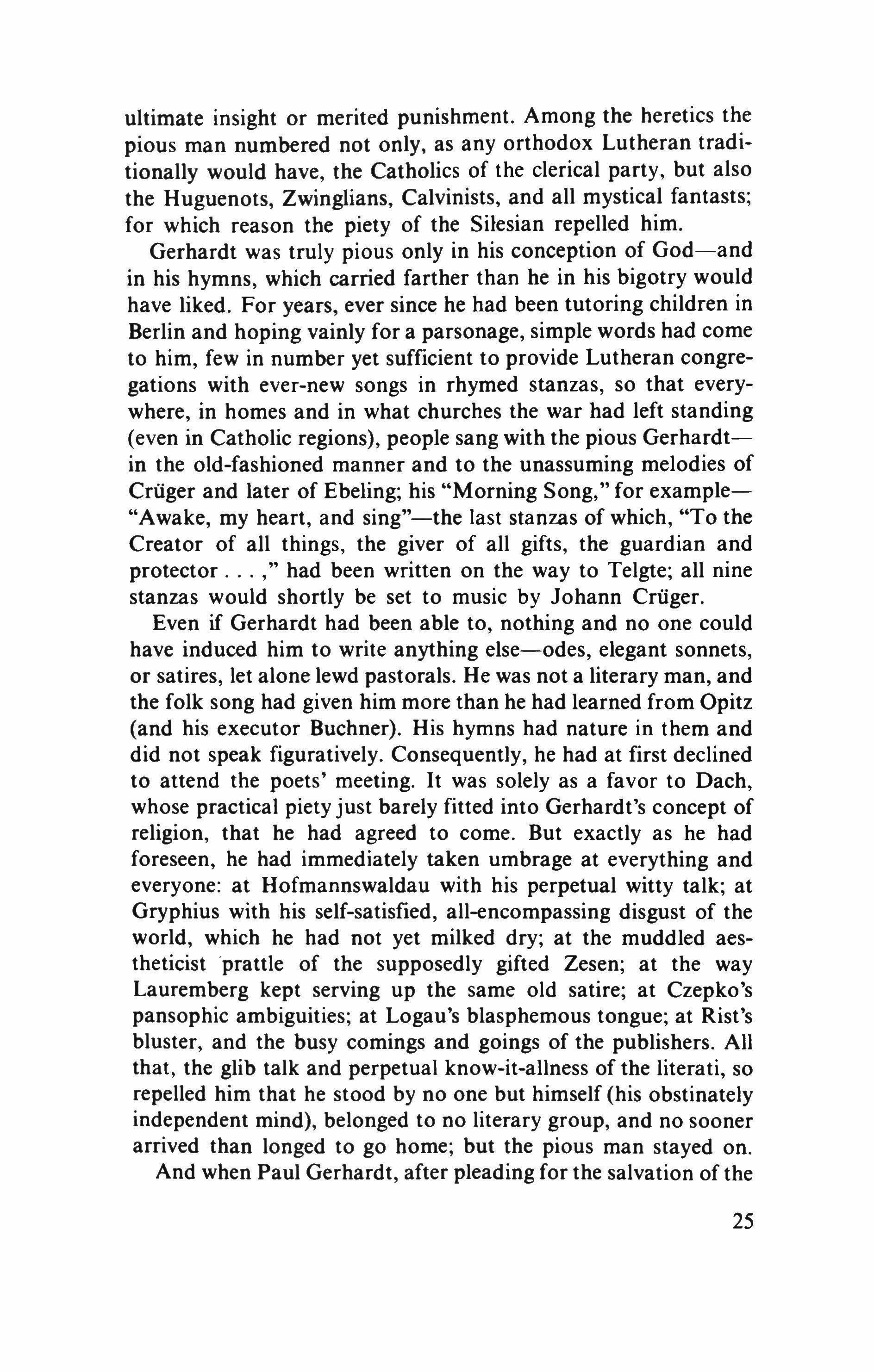 He then withdrew with Libuschka, who apparently recognized that Gelnhausen's horsemen and musketeers required additional sustenance. Left alone for a while, the literary men, some frightened and others indignant at Gelnhausen's impudence, relieved their feelings in disputation. Never fear. They would manage to forget the danger facing their meeting through skillful recourse to the dactylic words for which they were always searching; the world could come to an end, and in the midst of the rumbling and roaring these gentlemen would quarrel over the correct or incorrect use of metric feet. In the last analysis-and Gryphius, with the verbal splendor of his sonnets, was not alone in having said so-all was vanity.