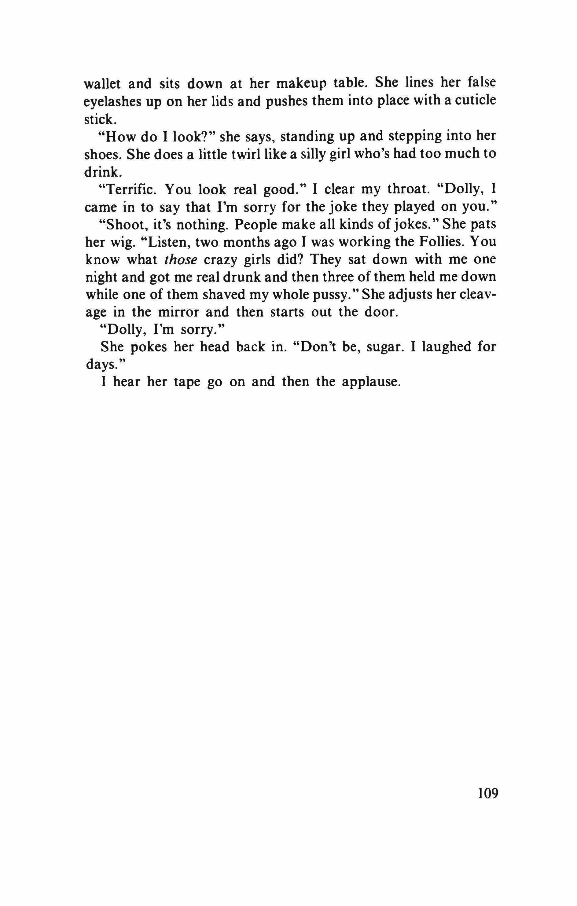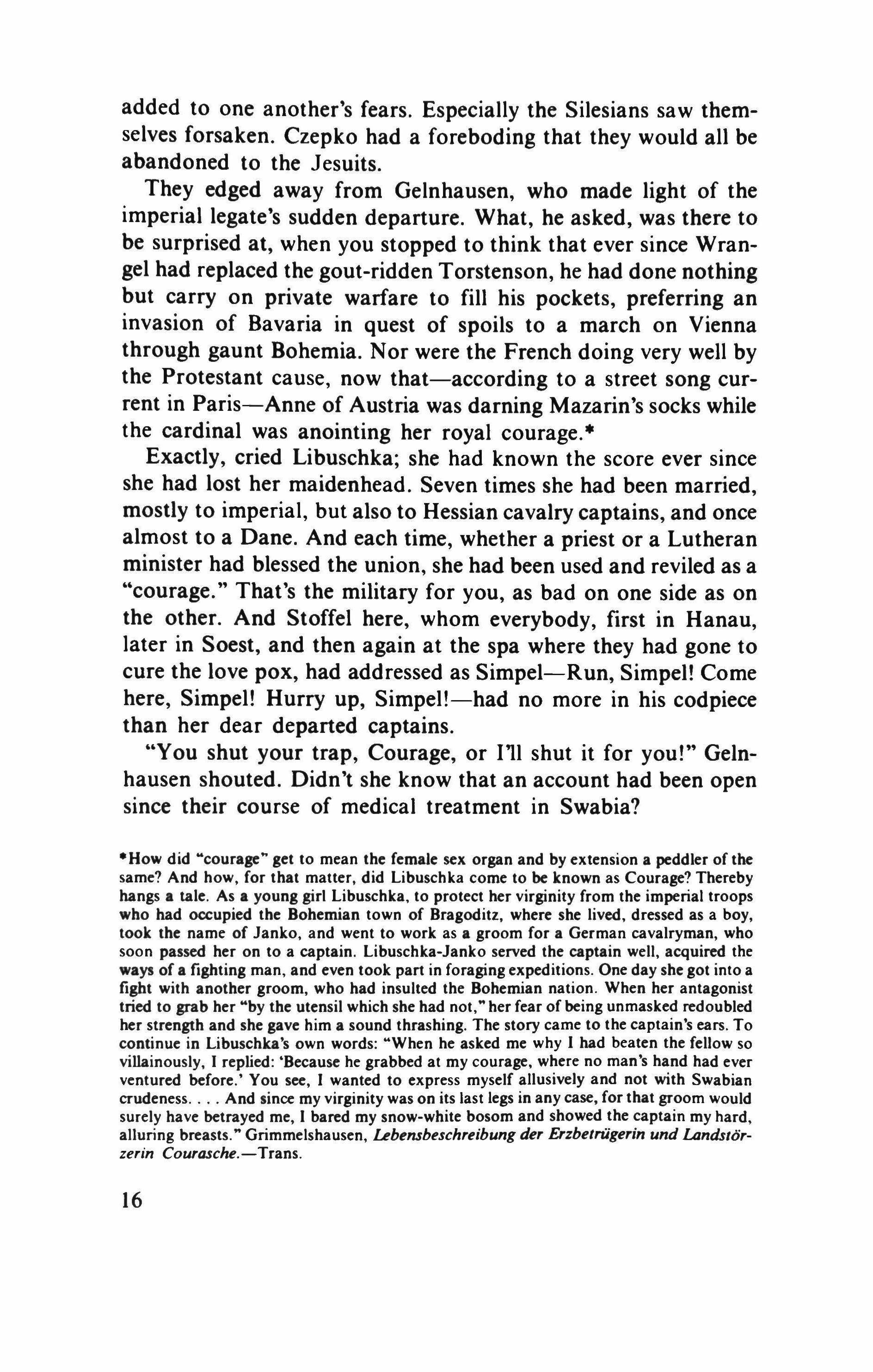 ·How did "courage" get to mean the female sex organ and by extension a peddler of the same? And how, for that matter, did Libuschka come to be known as Courage? Thereby hangs a tale. As a young girl Libuschka, to protect her virginity from the imperial troops who had occupied the Bohemian town of Bragoditz, where she lived, dressed as a boy, took the name of Janko, and went to work as a groom for a German cavalryman, who soon passed her on to a captain. Libuschka-Janko served the captain well, acquired the ways of a fighting man, and even took part in foraging expeditions. One day she got into a fight with another groom, who had insulted the Bohemian nation. When her antagonist tried to grab her "by the utensil which she had not," her fear of being unmasked redoubled her strength and she gave him a sound thrashing. The story came to the captain's ears. To continue in Libuschka's own words: "When he asked me why I had beaten the fellow so villainously, I replied: 'Because he grabbed at my courage, where no man's hand had ever ventured before.' You see, I wanted to express myself allusively and not with Swabian crudeness And since my virginity was on its last legs in any case, for that groom would surely have betrayed me, I bared my snow-white bosom and showed the captain my hard, alluring breasts." Grimmelshausen, Lebensbeschreibung der Erzbetriigerin und Landstorzerin Courasche.-Trans.