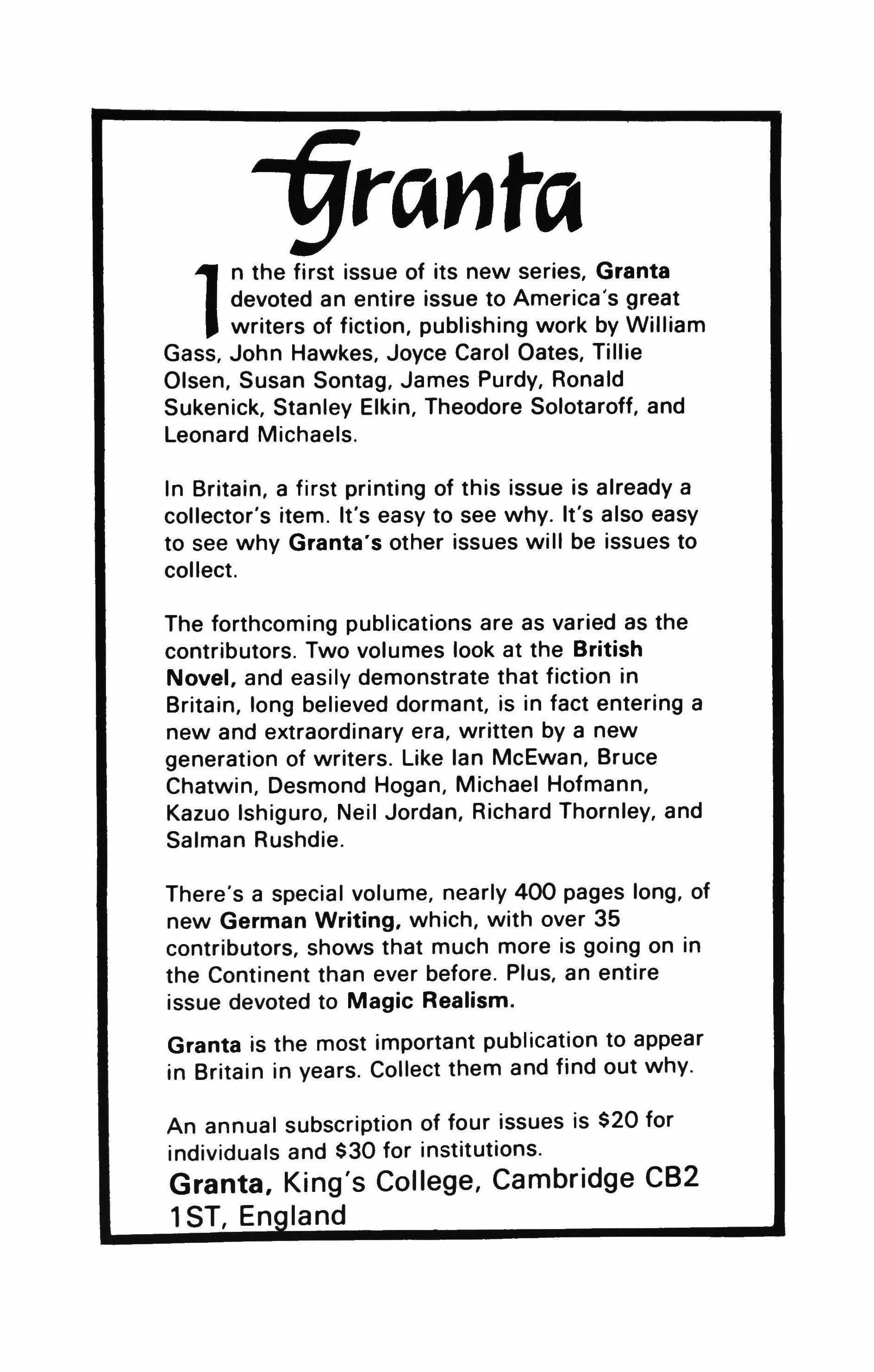 Granta is the most important publication to appear in Britain in years. Collect them and find out why.