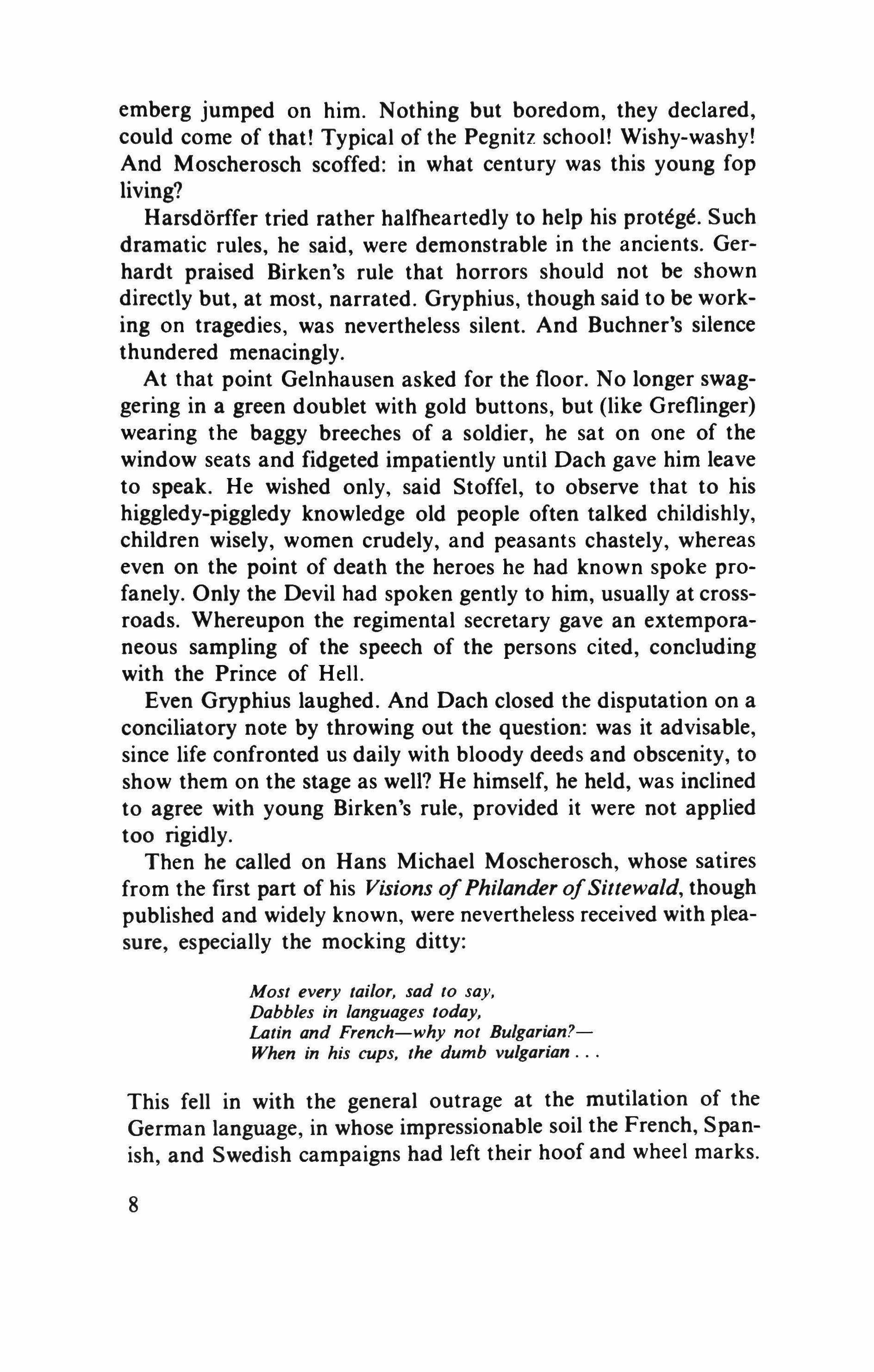 When the landlady Libuschka called in from the doorway to ask whether the signores would care for a boccolino of rouge, the company answered in all the foreign languages then current in Germany. Each of those present, even Gerhardt, proved a master of mumbo-jumbo parody. And Moscherosch, on the one hand a sturdy fellow apt to be the first to laugh at his own jokes, but on the other hand a man inclined to profundity and belonging to the Order of the Palm Tree, in which he bore the epithet of The Dreamer, gave further samples of his satirical prowess. He scoffed at forced rhymes and pastoral circumlocutions. Without naming names he struck blows at the Pegnitz school. Several times he called himself a "good German," even though his name was of Moorish origin, as he pointed out for the benefit of anyone who might be toying with the thought of a rhyme for "stew." (It so happened that the bottom-of-the-barrel wine that the landlady had her maids serve was of Spanish origin.)