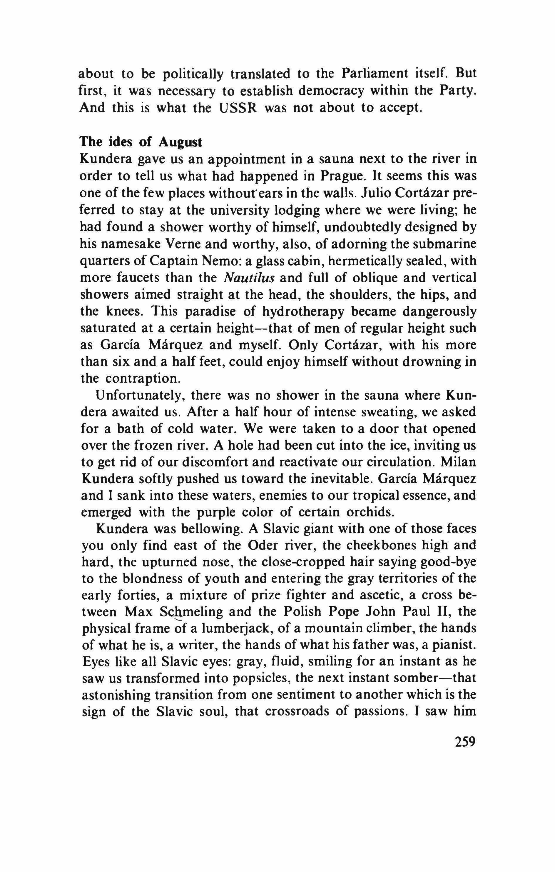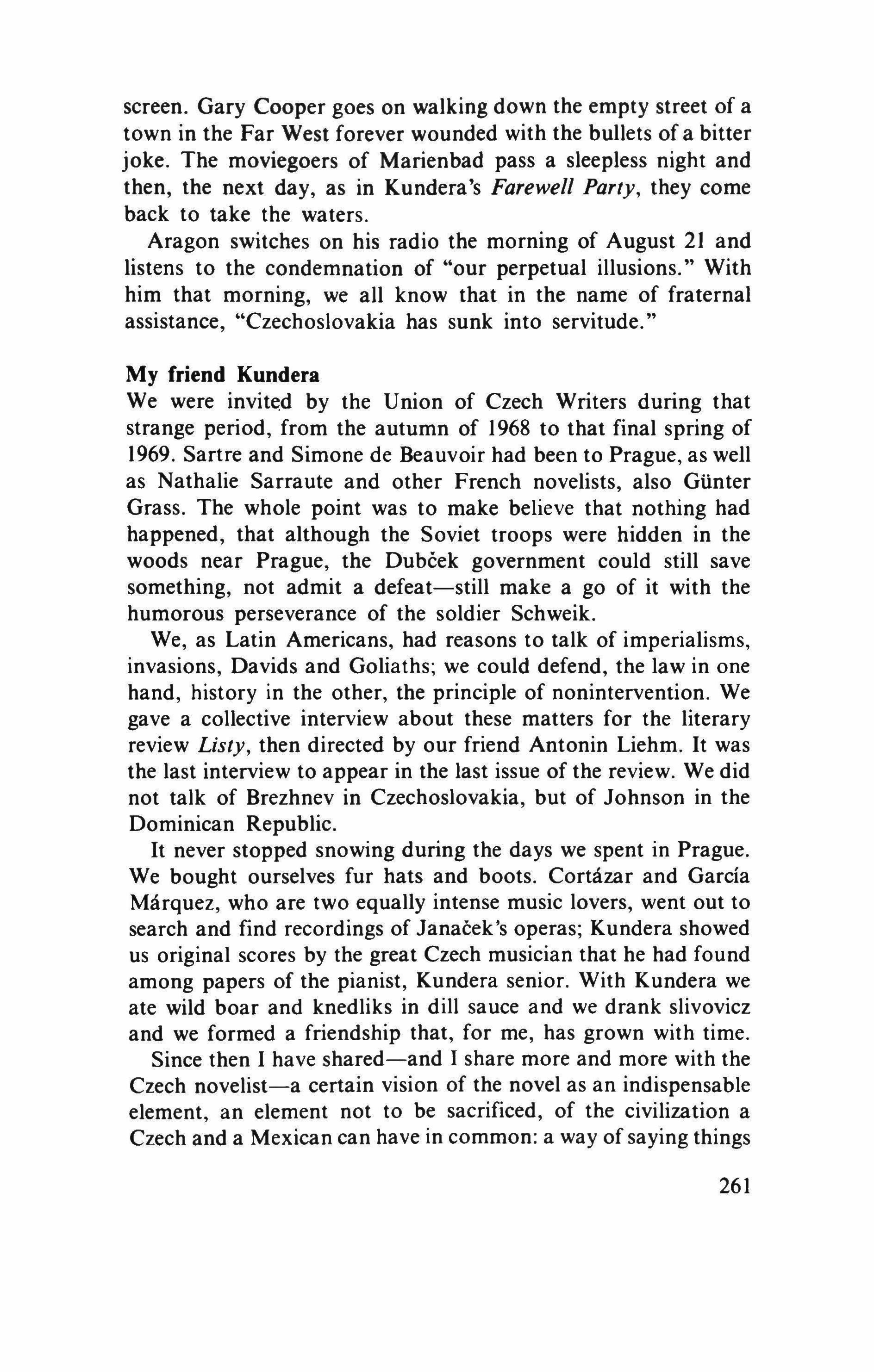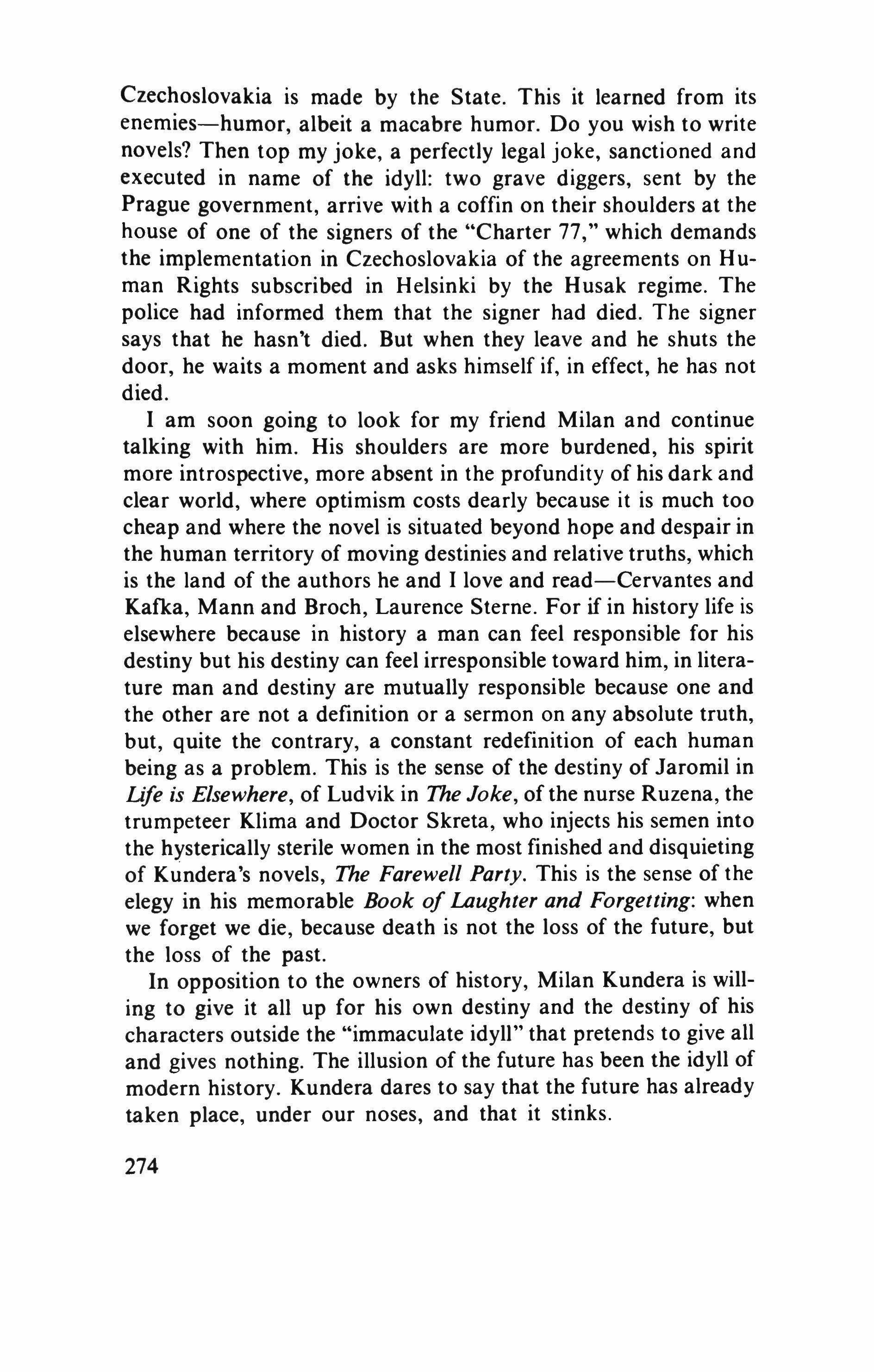 I am soon going to look for my friend Milan and continue talking with him. His shoulders are more burdened, his spirit more introspective, more absent in the profundity of his dark and clear world, where optimism costs dearly because it is much too cheap and where the novel is situated beyond hope and despair in the human territory of moving destinies and relative truths, which is the land of the authors he and I love and read-Cervantes and Kafka, Mann and Broch, Laurence Sterne. For if in history life is elsewhere because in history a man can feel responsible for his destiny but his destiny can feel irresponsible toward him, in literature man and destiny are mutually responsible because one and the other are not a definition or a sermon on any absolute truth, but, quite the contrary, a constant redefinition of each human being as a problem. This is the sense of the destiny of Jaromil in life is Elsewhere, of Ludvik in The Joke, of the nurse Ruzena, the trumpeteer Klima and Doctor Skreta, who injects his semen into the hysterically sterile women in the most finished and disquieting of Kundera's novels, The Farewell Party. This is the sense of the elegy in his memorable Book of Laughter and Forgetting: when we forget we die, because death is not the loss of the future, but the loss of the past.