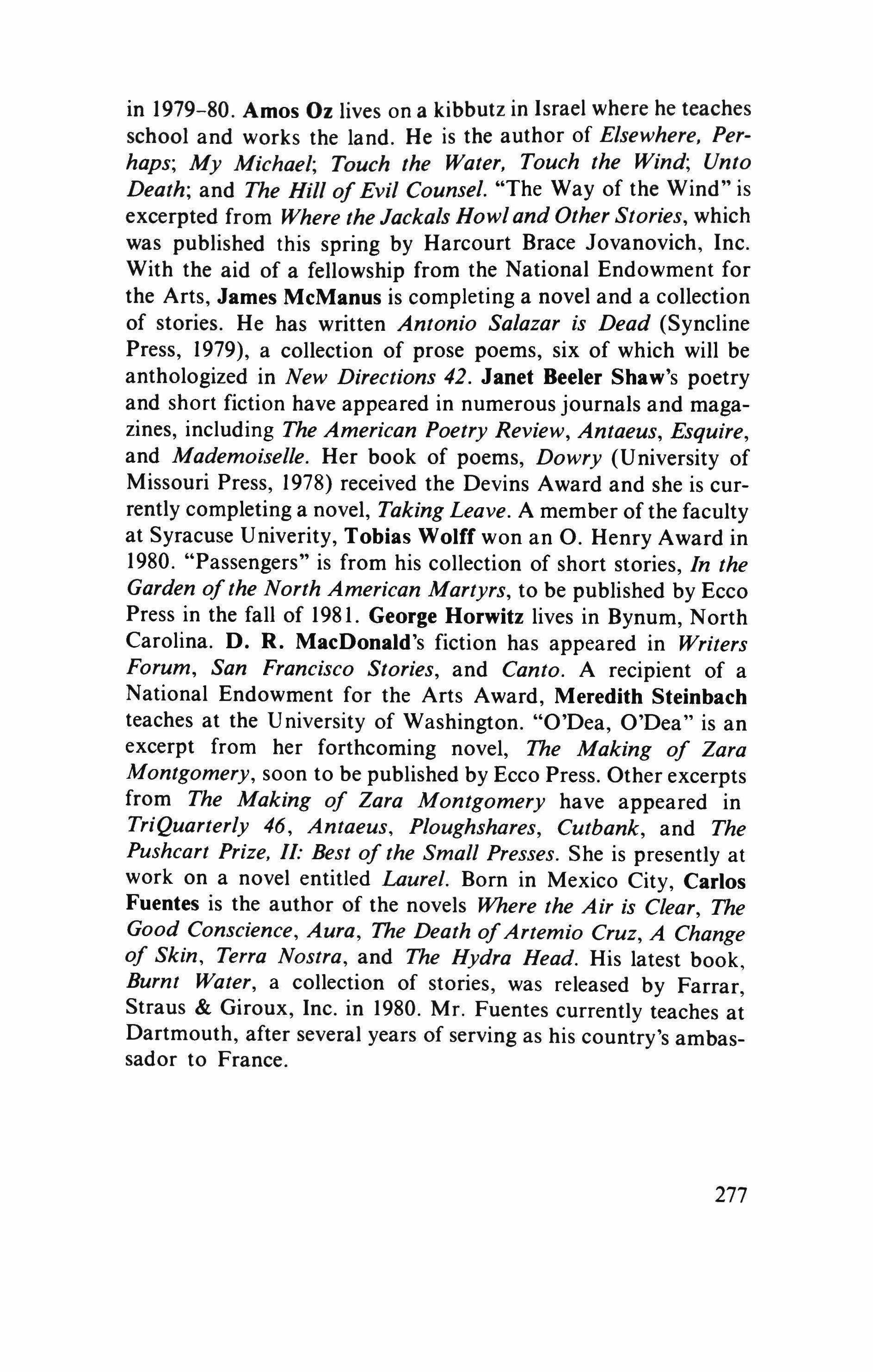 in 1979-80. Amos Oz lives on a kibbutz in Israel where he teaches school and works the land. He is the author of Elsewhere, Perhaps; My Michael; Touch the Water, Touch the Wind; Unto Death; and The Hill of Evil Counsel. "The Way of the Wind" is excerpted from Where the Jackals Howl and Other Stories, which was published this spring by Harcourt Brace Jovanovich, Inc. With the aid of a fellowship from the National Endowment for the Arts, James McManus is completing a novel and a collection of stories. He has written Antonio Salazar is Dead (Syncline Press, 1979), a collection of prose poems, six of which will be anthologized in New Directions 42. Janet Beeler Shaw's poetry and short fiction have appeared in numerous journals and magazines, including The American Poetry Review, Antaeus, Esquire, and Mademoiselle. Her book of poems, Dowry (University of Missouri Press, 1978) received the Devins Award and she is currently completing a novel, Taking Leave. A member of the faculty at Syracuse Univerity, Tobias Wolff won an O. Henry Award in 1980. "Passengers" is from his collection of short stories, In the Garden of the North American Martyrs, to be published by Ecco Press in the fall of 1981. George Horwitz lives in Bynum, North Carolina. D. R. MacDonald's fiction has appeared in Writers Forum, San Francisco Stories, and Canto. A recipient of a National Endowment for the Arts Award, Meredith Steinbach teaches at the University of Washington. "O'Dea, O'Dea" is an excerpt from her forthcoming novel, The Making of Zara Montgomery, soon to be published by Ecco Press. Other excerpts from The Making of Zara Montgomery have appeared in TriQuarterly 46, Antaeus, Ploughshares, Cutbank, and The Pushcart Prize, II: Best of the Small Presses. She is presently at work on a novel entitled Laurel. Born in Mexico City, Carlos Fuentes is the author of the novels Where the Air is Clear, The Good Conscience, Aura, The Death ofArtemio Cruz, A Change of Skin, Terra Nostra, and The Hydra Head. His latest book, Burnt Water, a collection of stories, was released by Farrar, Straus & Giroux, Inc. in 1980. Mr. Fuentes currently teaches at Dartmouth, after several years of serving as his country's ambassador to France.
