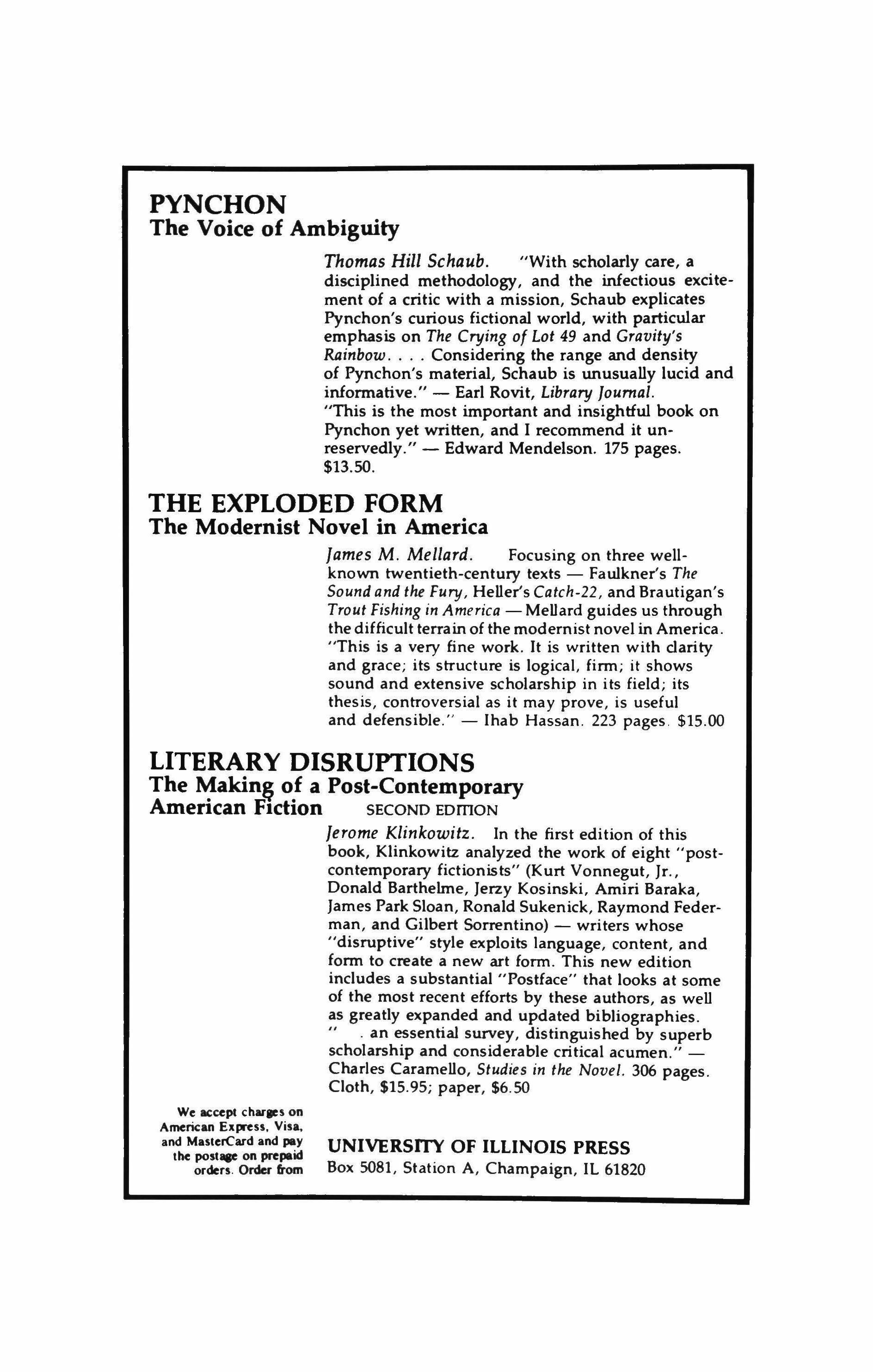 Jerome Klinkowitz. In the first edition of this book, Klinkowitz analyzed the work of eight "postcontemporary fictionists" (Kurt Vonnegut, [r., Donald Barthelme, Jerzy Kosinski. Amiri Baraka, James Park Sloan, Ronald Sukenick, Raymond Federman, and Gilbert Sorrentino) - writers whose "disruptive" style exploits language, content, and form to create a new art form. This new edition includes a substantial "Postface" that looks at some of the most recent efforts by these authors, as well as greatly expanded and updated bibliographies. an essential survey, distinguished by superb scholarship and considerable critical acumen."Charles Caramello, Studies in the Novel. 306 pages. Cloth, $15.95; paper, $6.50