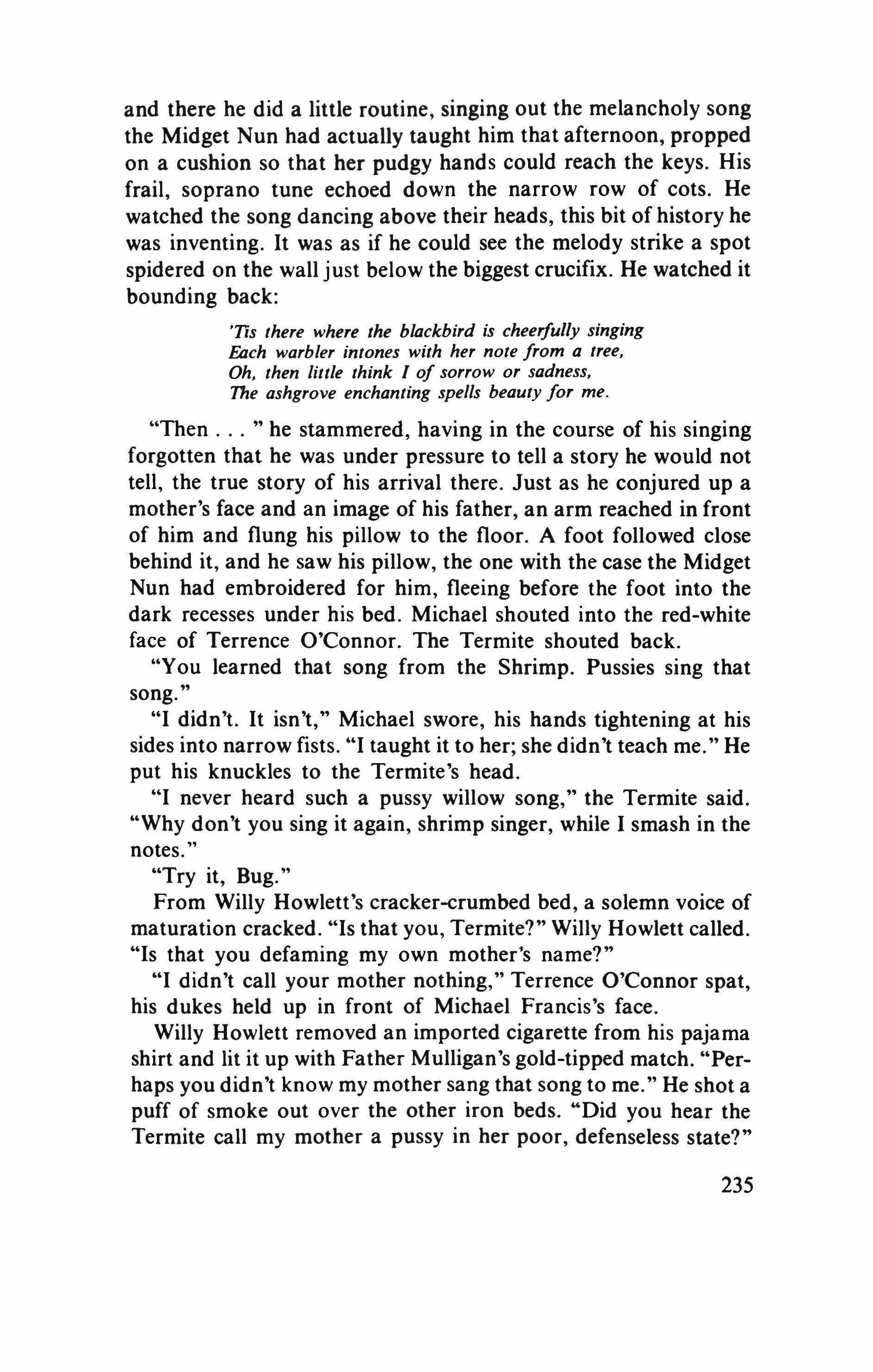 At that point Gelnhausen asked for the floor. No longer swaggering in a green doublet with gold buttons, but (like Greflinger) wearing the baggy breeches of a soldier, he sat on one of the window seats and fidgeted impatiently until Dach gave him leave to speak. He wished only, said Stoffel, to observe that to his higgledy-piggledy knowledge old people often talked childishly, children wisely, women crudely, and peasants chastely, whereas even on the point of death the heroes he had known spoke profanely. Only the Devil had spoken gently to him, usually at crossroads. Whereupon the regimental secretary gave an extemporaneous sampling of the speech of the persons cited, concluding with the Prince of Hell.