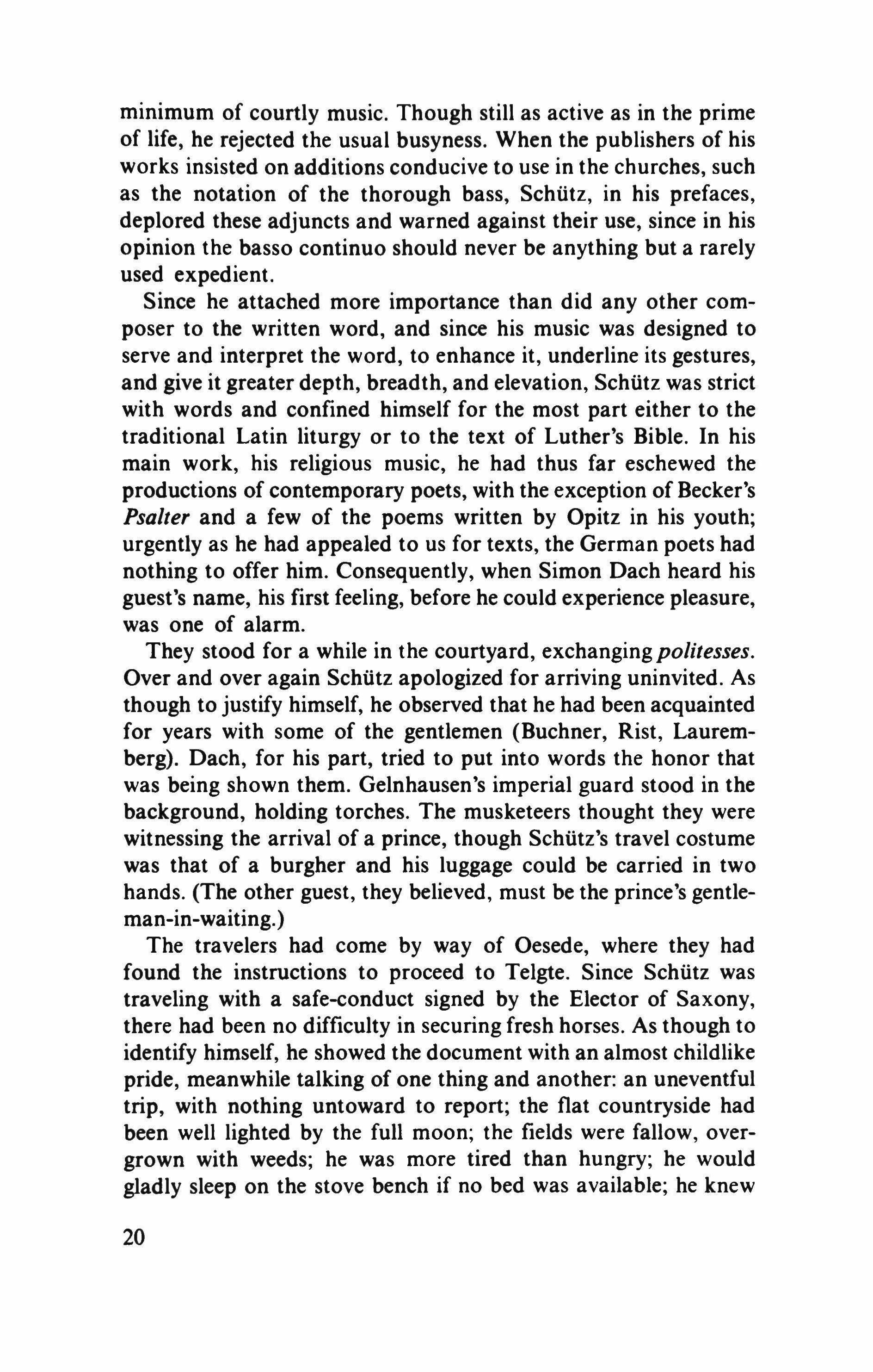 When Simon Dach gave the signal, the company moved with astonishing discipline from the taproom to the great hall; to him the poets subordinated their often childish willfulness. They accepted his authority. Rist and Zesen forsook (for a while) their deep-rooted contentiousness. Greflinger had always longed for such a father. It genuinely amused the aristocrat Hofmannswaldau to sacrifice his habits to the commoner Dach. The princes of learning=-Harsdorffer with residence in Nuremberg, Buchner of Wittenberg-would gladly (under the warming influence of wine) have chosen Dach as their regent. And because for some years Weckherlin, who had grown bilious at court, had no longer been serving the King of England but had become a secretary of state
