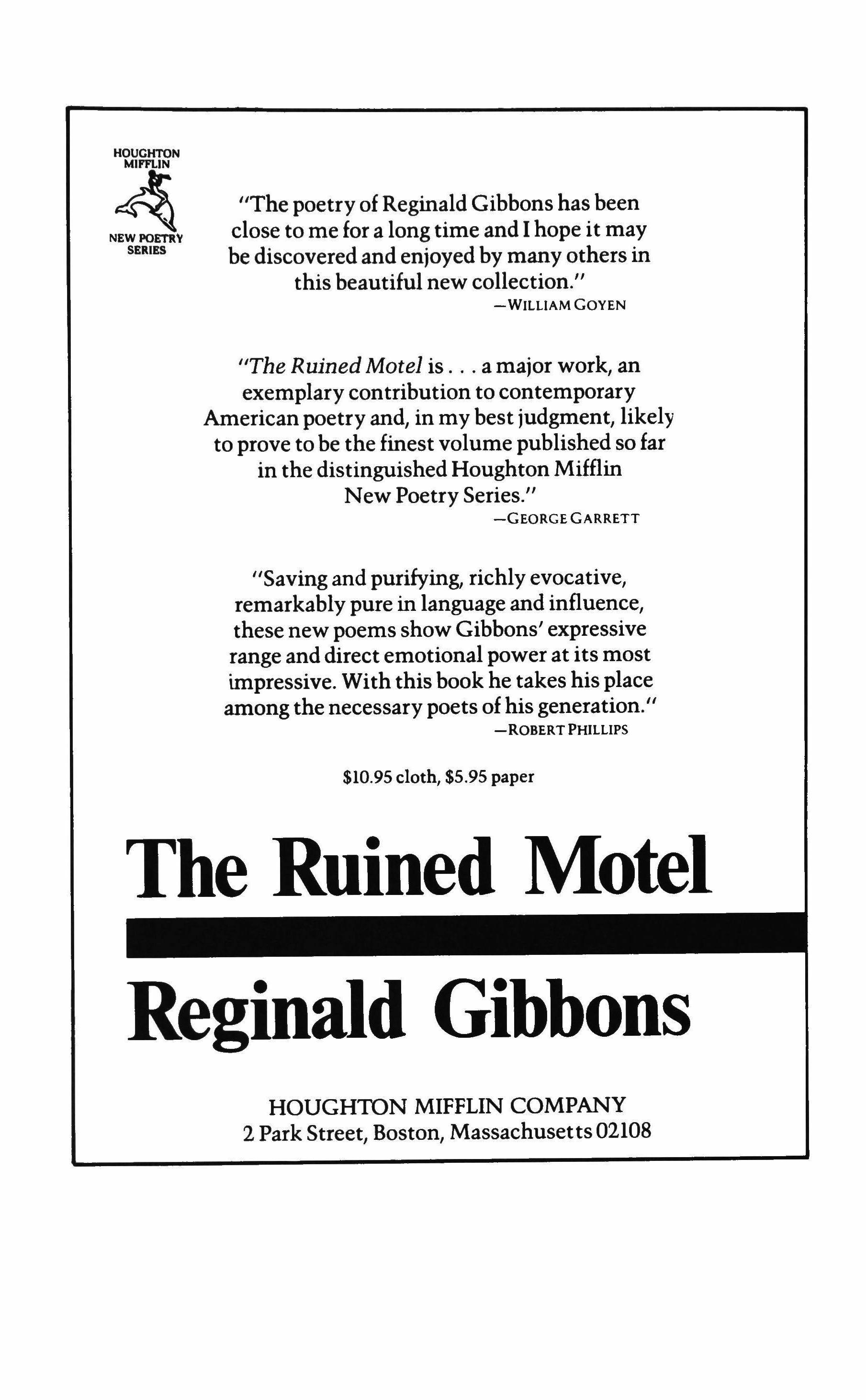 - WILLIAM GOYEN"The Ruined Motel is a major work, an exemplary contribution to contemporary American poetry and, in my best judgment, likely to prove to be the finest volume published so far in the distinguished Houghton Mifflin New Poetry Series."