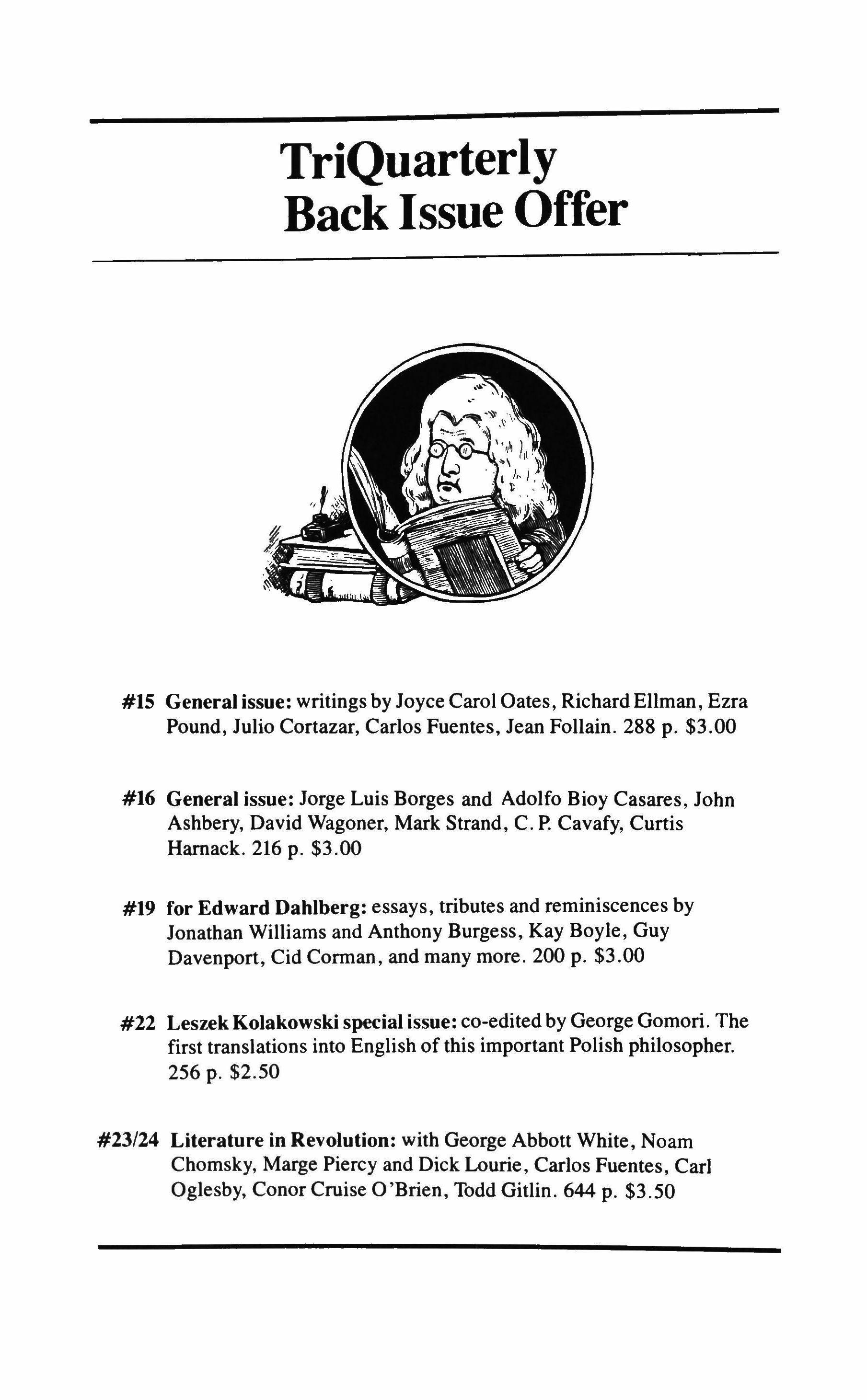 Reprints of back issues of TriQuarterly are now available in full format from Kraus Reprint Company, Route 100, Millwood, New York 10546, and in microfilm from UMI, a Xerox company. Ann Arbor. Michigan 48106.