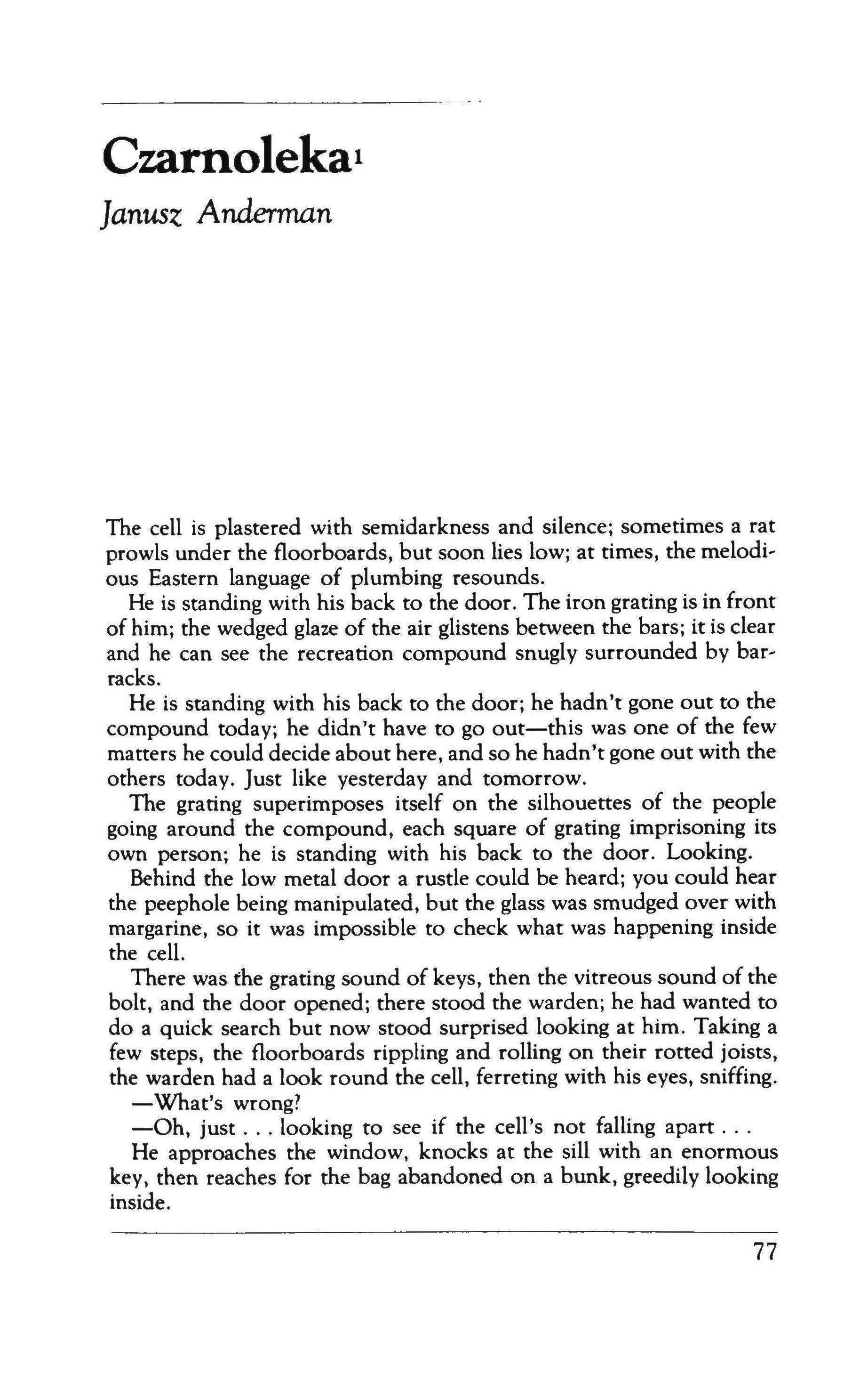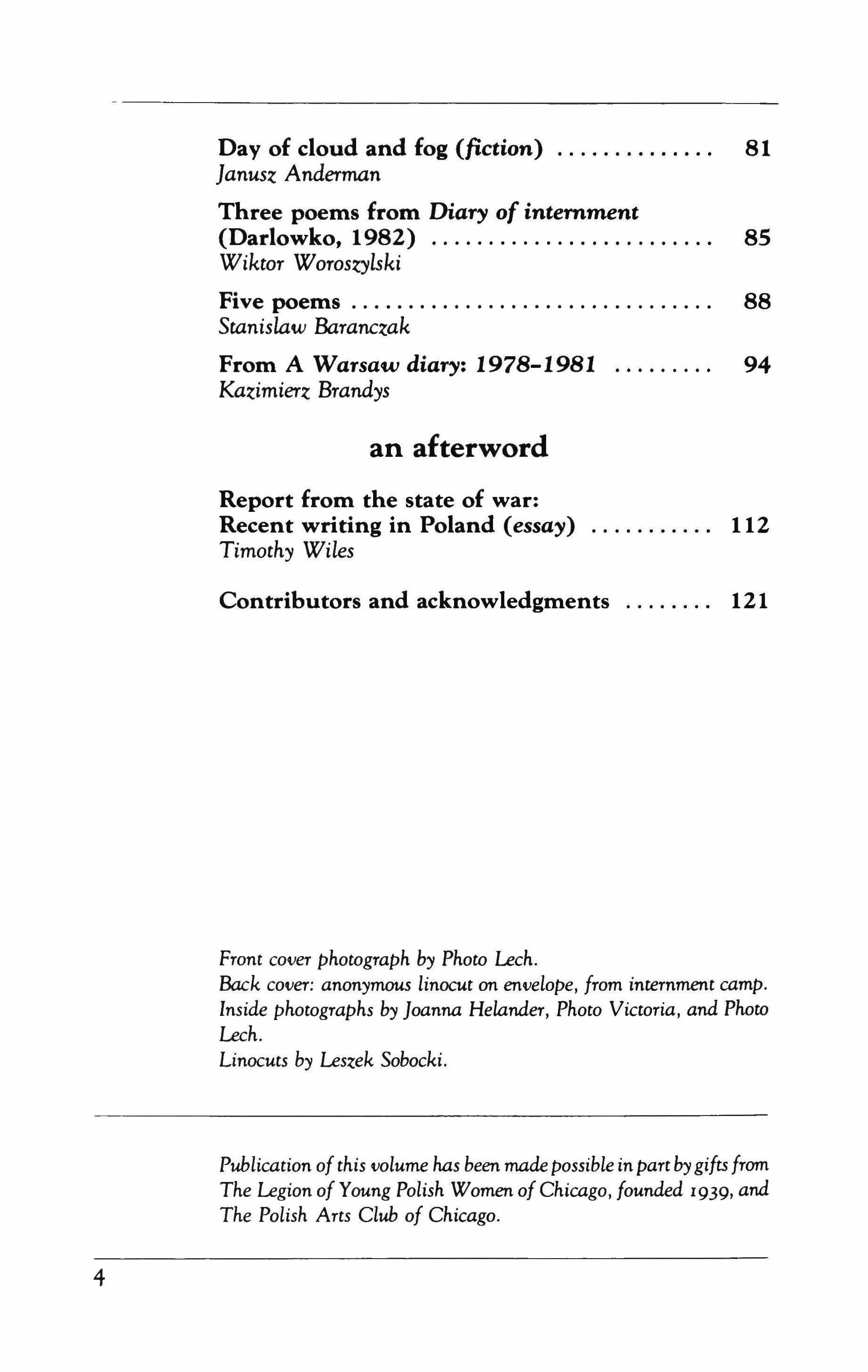 Recognized in recent years as an influential fiction writer, Janusz Anderman has also written screenplays and published translations. The stories in this issue were written in prison during Anderman's internment from December 1981 till July 1982. Kazimierz Brandvs was born in 1916 in Lodz. His first novel, The Wooden Horse, was published in 1946. Another novel, Samson, was made into a film of the same title by Andrzej Wajda. A Warsaw Diary is his latest work.* Brandys was abroad when martial law was declared; shortly thereafter, several of his books were outlawed. Under the present circumstances he cannot and does not wish to return. He is currently Writer in Residence at Columbia.