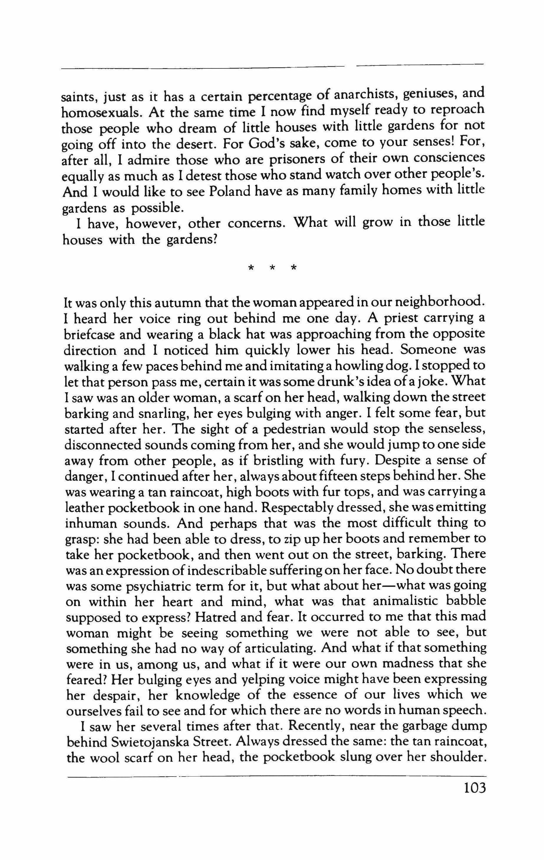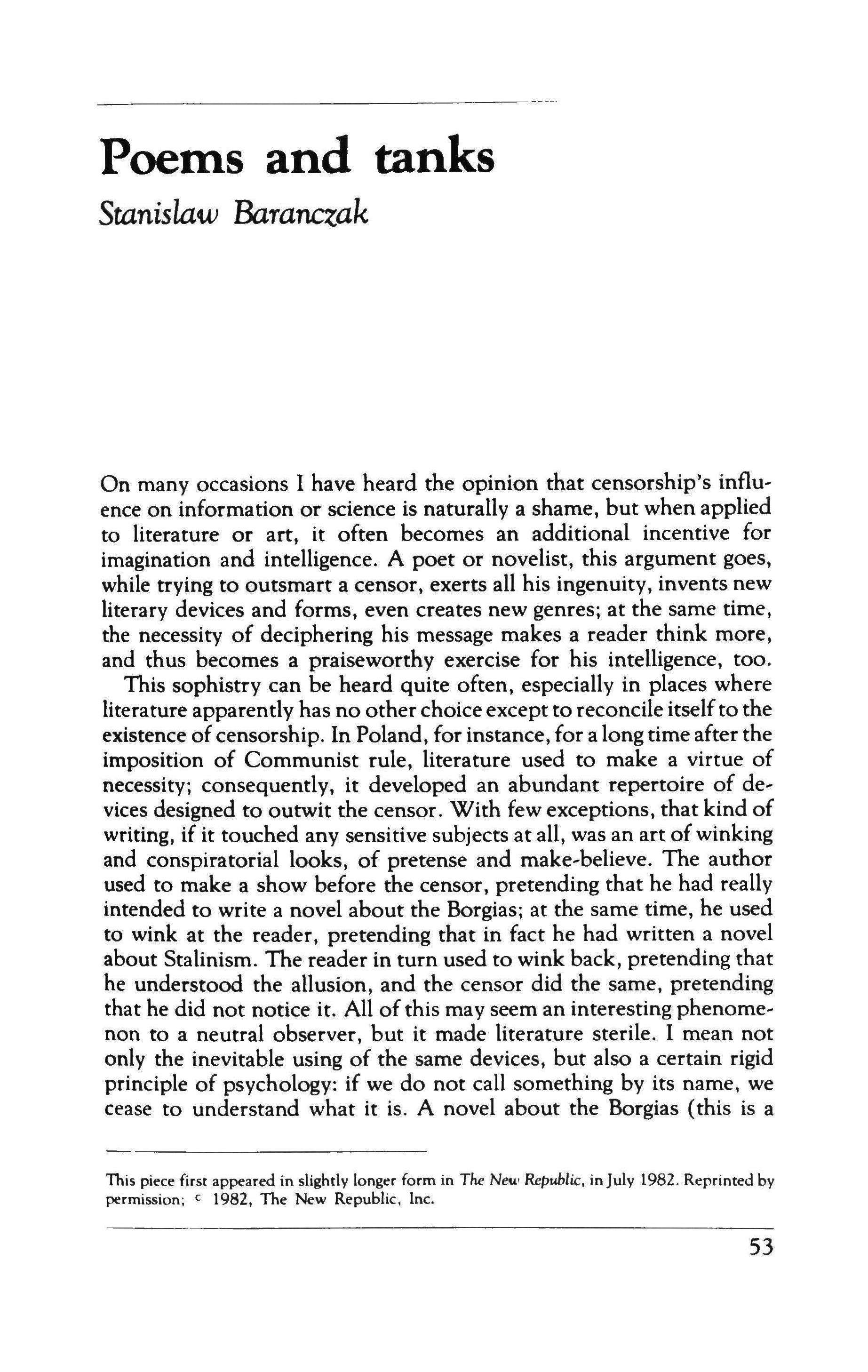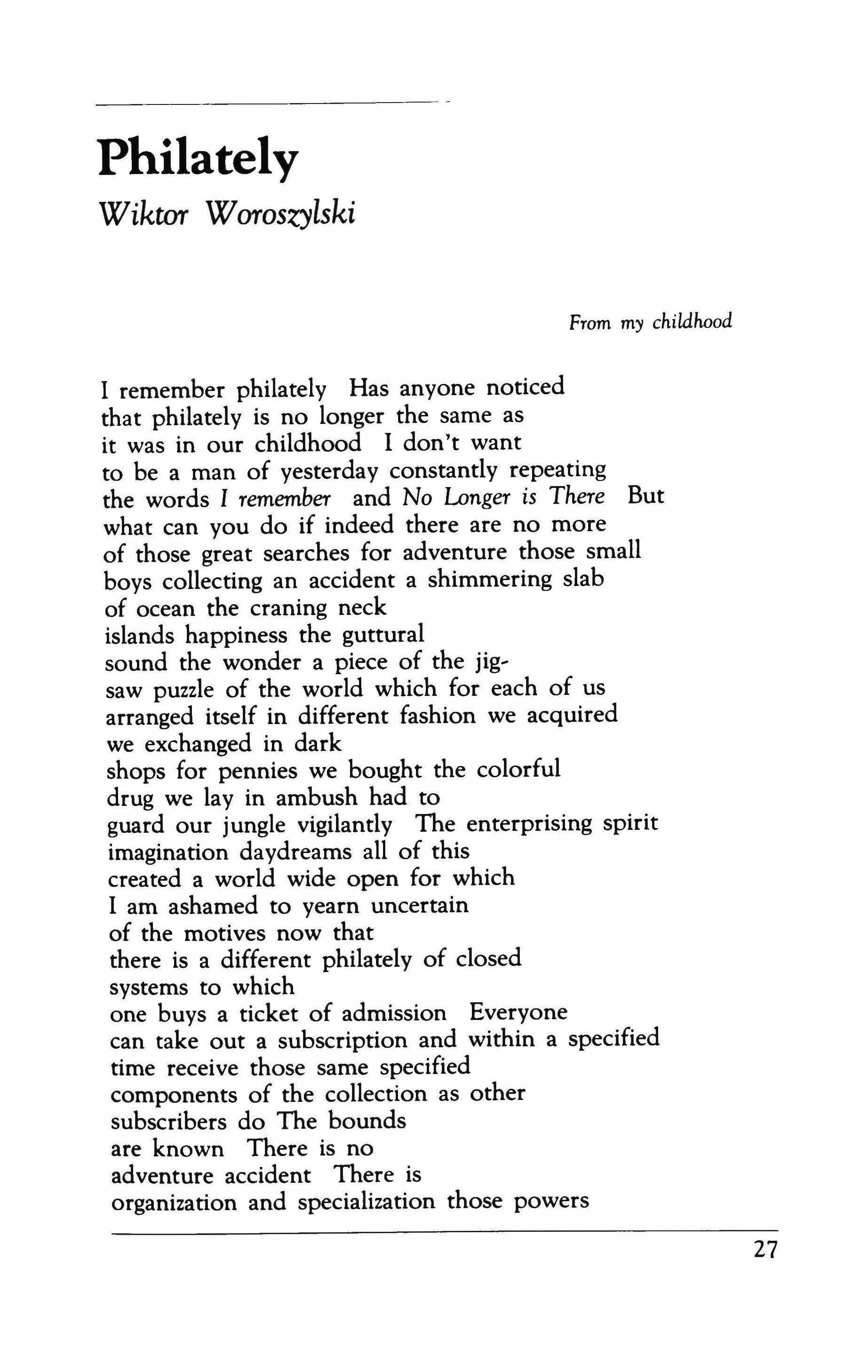 The effect was to make everything, no matter how literary, seem documentary, and to make everything that was simply documentary seem very literary. The ways in which one reads and judges literary works are always influenced mightily by the moment, the context, both experiential and literary; but this simple truth had not been demonstrated to me so forcefully before I began to compile this issue of TQ. It was difficult to make some of the decisions to exclude works. Some pieces were too historically or culturally bound to Poland to be very intelligible to American readers without lots of footnotes; some were too fragmentary. However, I still sense those excluded works, as if they were here by implication, and I wish it were