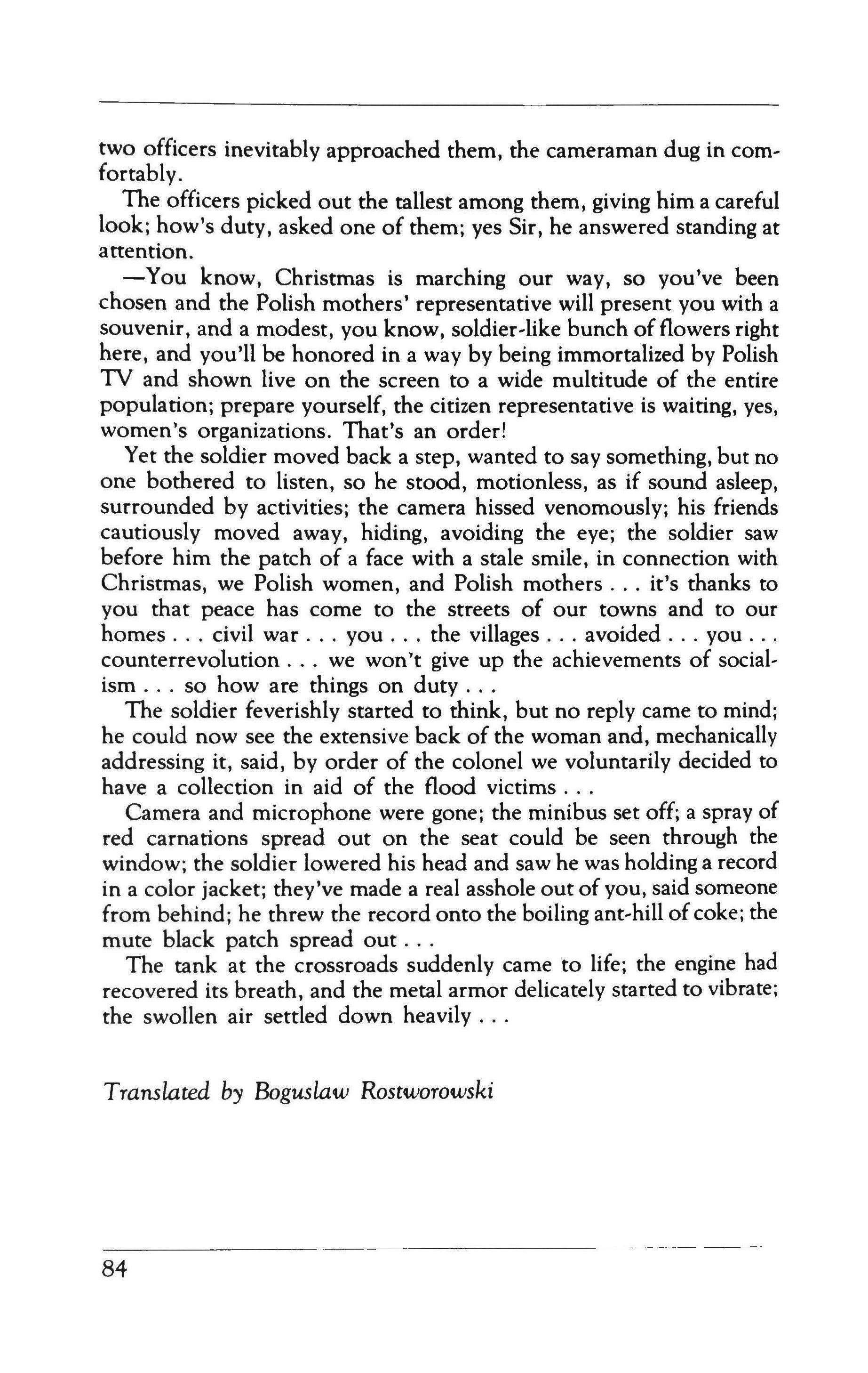 1982 includes some local references which may puzzle some foreign readers for a moment, although all of them are grounded in widelyreported situations and voiced such that their general significance is clear. With their history so immediate and broadly shared in Poland, writers didn't need to add appositives or explanatory passages, and we translators have mostly avoided supplying them. Poles would be expected to remember, and part of the point of this writing has been to help people remember, especially since the martial law conditions changed quite rapidly, so that a prohibition of January might seem unimaginable in May, and an automatic reaction of winter resistance might have given way to a mood of sullen resignation by summer, but ought not to be forgotten; and who else was recording it? And of course writers were reminding citizens of their recent flourishing in the year past, of the new and bold institutions and actions which would have seemed unimaginable in the 1970s and had been abolished as if they never existed by the beginning of 1982. Most foreign readers probably know about official verification or loyalty tests extracted from whole branches of professional occupations and from many workers engaged either in critical trades or dissident activities, and they may know that military commissars were assigned to most institutions, even hospitals and schools. Readers need to recall both communist societies and German wartime occupation to appreciate the rancor citizens reserve here for people whom they consider to be collaborators, and the cruelty they justify in their treatment of anyone who gives even a tangential public support to the government. It became a badge of honor not to publish in the official press norespecially-to appear on television. Poles judged such collaborators in degrees of scorn bitterly measured on a scale of the speed by which a public figure agreed to speak on any matter through the media, the conditions under which he appeared (forced, impartial forum, government-sanctioned gripe-session talk show, open endorsement), and his reputation under past regimes (real, rumored, imagined). The anonymous phone call and faked denunciation cut all ways and recall ambiguous memories under various foreign occupations, and the writers do not always rise to impartial analysis of the way a meanspirited resistance deforms the rebel, even while they depict thug mentality acutely. As for more specific local situations, readers should know that news documentary fabricators actually did distribute Christmas presents of phonograph records to street-corner soldiers and televised it on December 25, 1982 (Anderman), and that when vigil-keepers at the floral cross in Warsaw's Victory Square insisted on standing watch by the six-yard-long monument (commemorating