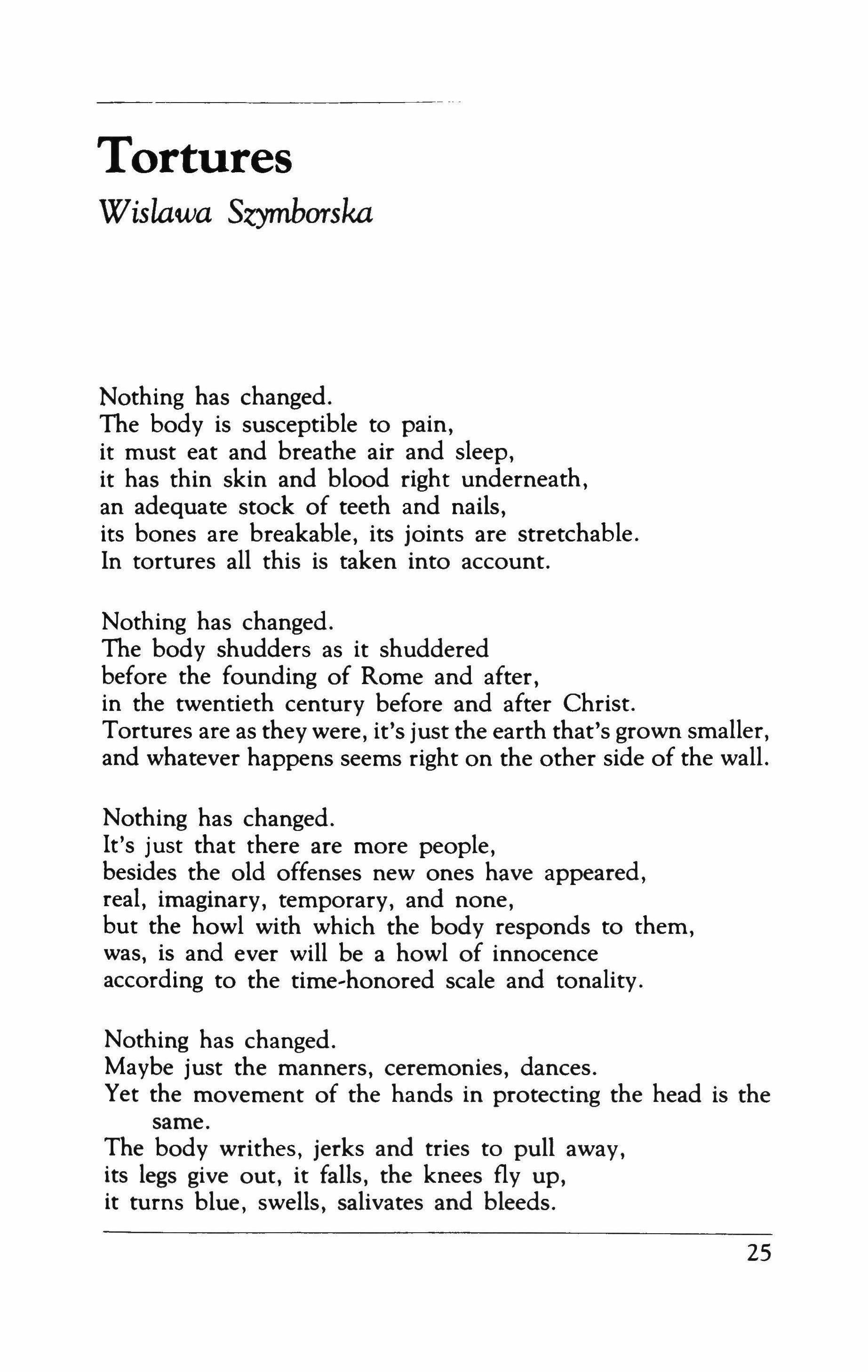 Richard Lourie has translated Czeslaw Milosz's Visions from San Francisco Bay and Konwicki's The Polish Complex. He is also the author of a novel, Sagittarius in Warsaw, and of a study of the Russian writer Andrei Sinyavski entitled Letters to the Future. He lives in Boston. One of the great postwar poets in Poland, Wislawa Szymborska has also been very popular in East and West Germany, where translations of her work have appeared. English translations of her poetry have been published in The Polish Review (No.3, 1979) and in two collections: Sounds, Feelings, Thoughts: Seventy Poems by Wislawa Szymborska (Princeton, 1981), and "Selected Poems" in Quarterly Review of Literature, Poetry Series, IV (1982). "Tortures" will be included this year by Ardis Publishers in An Anthology of East European Poetry (edited by Emory George).