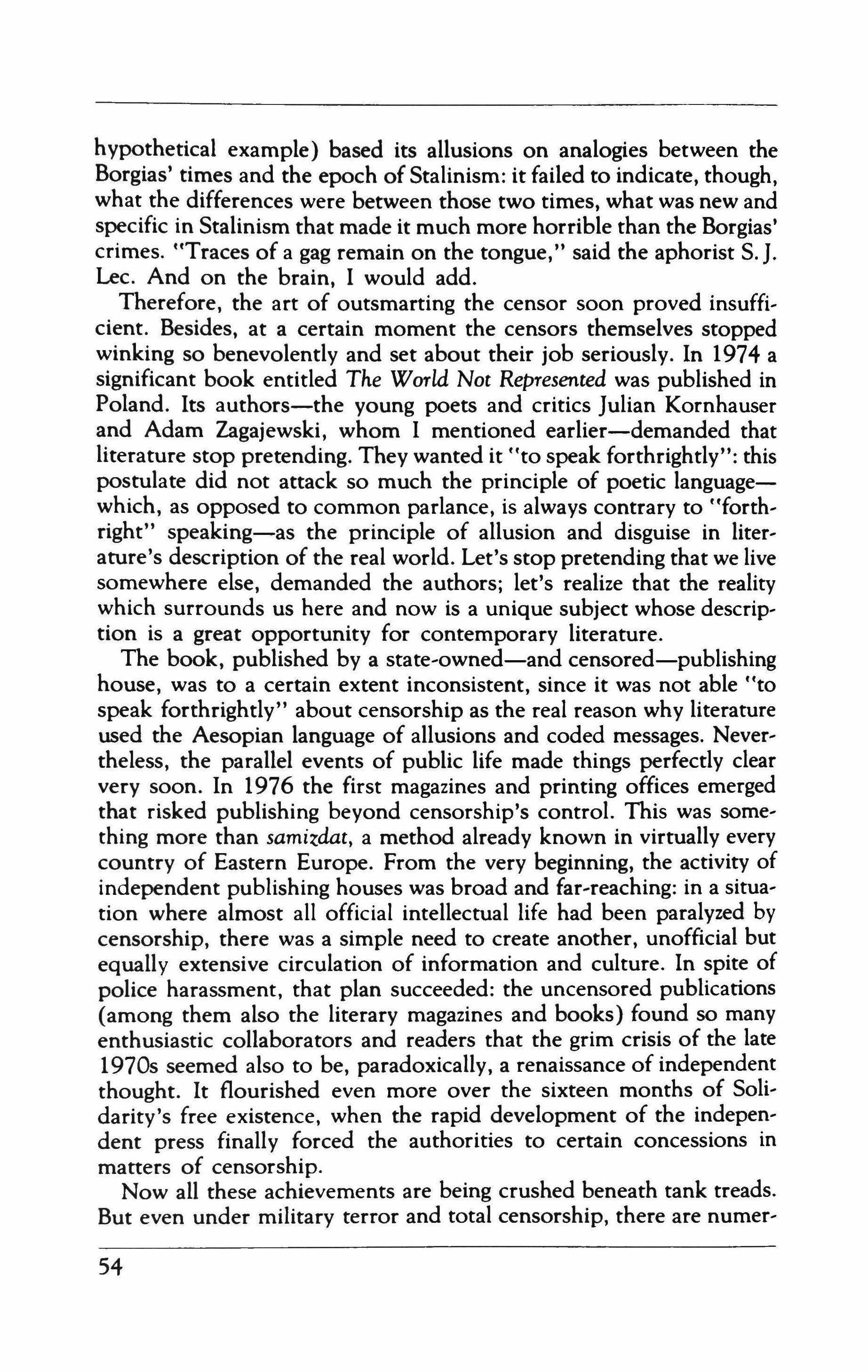 In the main, local details don't animate this writing, but the ex, perience of local reality does. In the most recent months here, litera, ture has needed to inform, to record events, and to record them quickly, partly for speedy distribution as part of the struggle, partly because some writers feared that they might be quickly silenced, or at least be detained by internment or arrest, as Jastrun and Anderman have been (each was released after a few months). The writing shows this haste, and sometimes a story or poem turns on too neat a point, the easy irony of an anecdote's expected conclusion. Still, writers in and out of jail turned that experience to advantage, partly through their defiance by creating something even from within prison, and in Janusz Anderman's case, especially when he depicts the strain and despair of a prisoner's fears, to debunk the popular local myth which held that every Solidarity internee flourished in prison (on his own psychological terms) and saw it as a duty and morale-building regimen. This literature burns with more hope than does much East European literature today, partly because its writers and readers still share memories of a recent open time, partly because the act of writing and reading it contributes to a local struggle and the will to alter by themselves the conditions which they can control. But a dark mood lies under the struggle, a fear that leaden times have set in, that a condition of stasis or even regression will prevail in material terms and in terms of rights and options. They write so that at least the spirit will not be paralyzed. Herbert concludes his "Report from a Town Under Siege" with a lament that "only our dreams have not been humiliated.