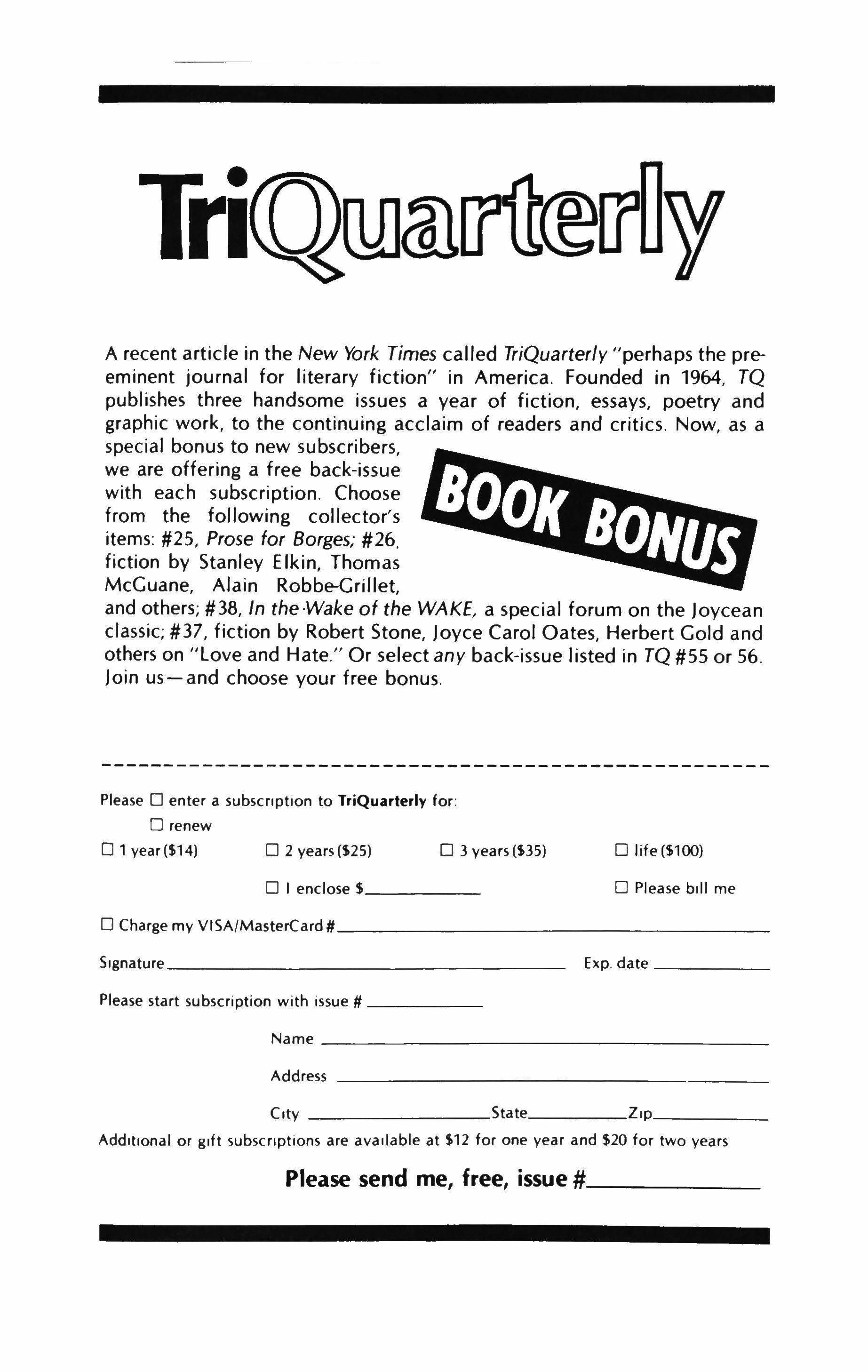 A recent article in the New York Times called TriQuarterly "perhaps the preeminent journal for literary fiction" in America. Founded in 1964, TO publishes three handsome issues a year of fiction, essays, poetry and graphic work, to the continuing acclaim of readers and critics. Now, as a special bonus to new subscribers, we are offering a free back-issue with each subscription. Choose from the following collector's items: #25, Prose for Borges; #26. fiction by Stanley Elkin, Thomas McGuane, Alain Robbe-Grillet, and others; #38, In the Wake of the WAKE, a special forum on the lovcean classic; #37, fiction by Robert Stone, Joyce Carol Oates, Herbert Gold and others on "Love and Hate." Or select any back-issue listed in TO #55 or 56. Join us-and choose your free bonus.