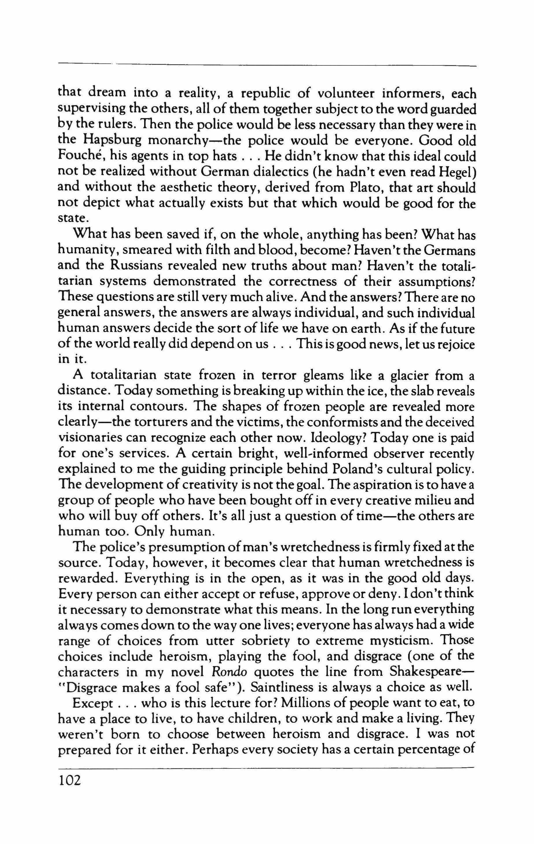 The Poles, then, are hopeful. They still imply that they can do something to improve the country and social system, that there is still something worth resisting for. This gives their writing a tone that sounds more optimistic, even naively hopeful, when compared to the damning irony found in Kundera's work, or the more pathetic sense of loss-registered by some Russian emigre writers-of an existence beyond recovery. It may account for the more local interest of Polish literature and its almost dogged devotion to facts and the journalistic style: the local institutions and relationships are still of value when you believe that you want to go on living within them, even within their boundaries, and will still keep pressing to expand them; and a factual account of local circumstances is valuable too, with all their imbalances registered, if you still plan to analyze them, urge their reform, take them seriously and "for real" as only nonfiction and reporting take the world for a real place. If a writer has given up on a culture or a society, then he can write the more international sort of literature, which is more cynical, and plays faster and looser with