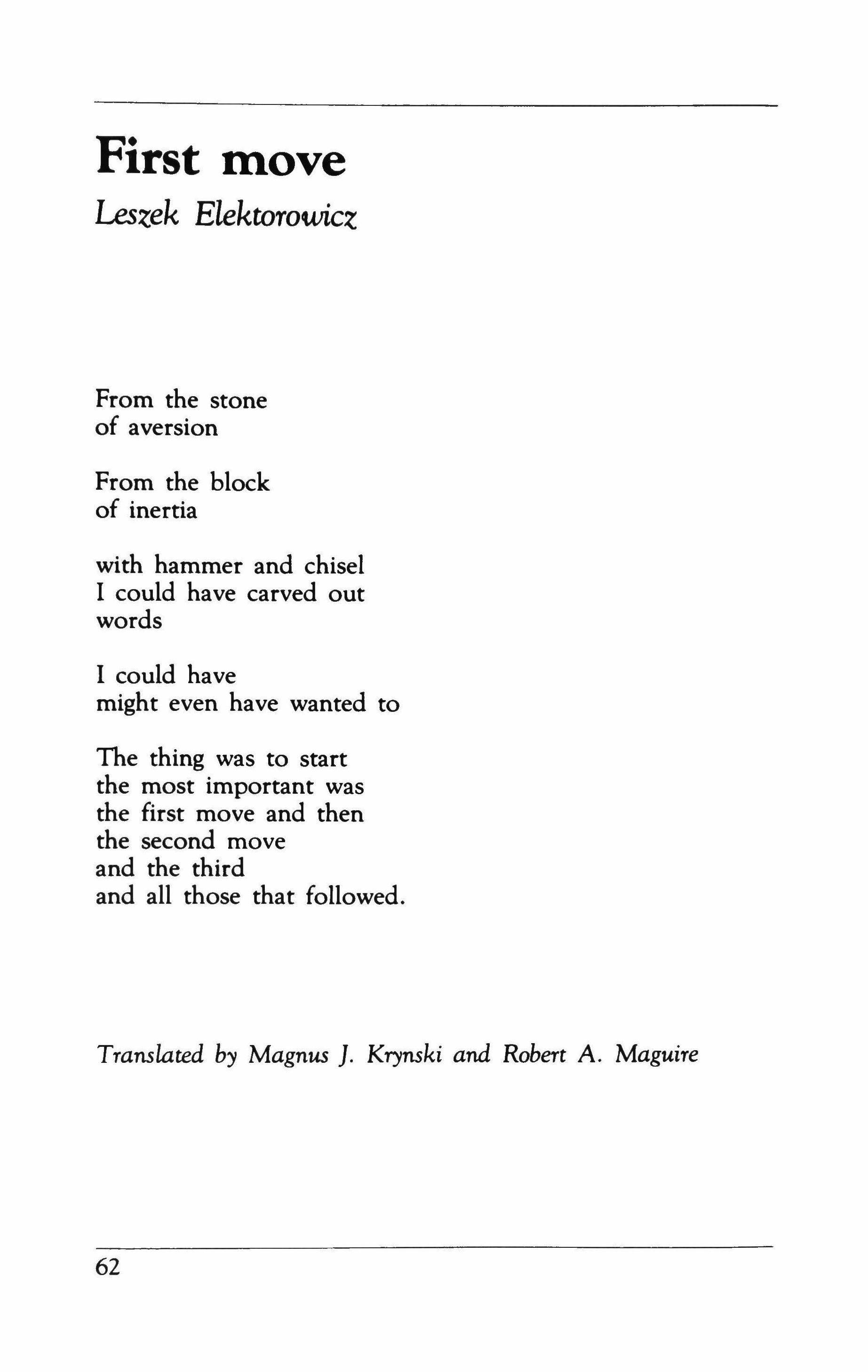 Magnus J. Krynski has written extensively on the Polish literary and political scene. With Robert Maguire he has translated volumes of poetry by Tadeusz Rozewicz, Anna Swirszczynska, and Wislawa Szvmborska. He is Chairman of the Department of Slavic Languages and Literatures at Duke University. Robert Maguire has translated numerous works into English from Polish and Russian, and he has published two books: Red Virgin Soil; Soviet Literature in the 1920S (Princeton, 1968) and Gogol from the Twentieth Century (Princeton, 1974). He is Professor of Russian Literature and Chairman of the Department of Slavic Languages at Columbia.