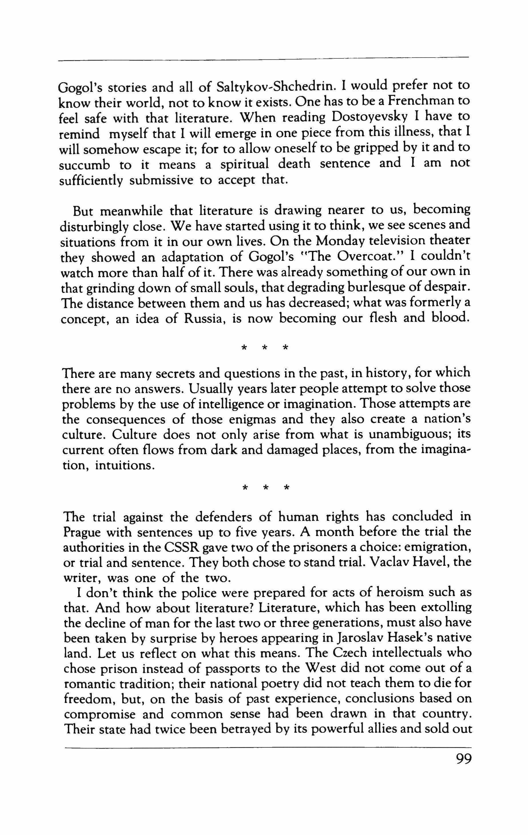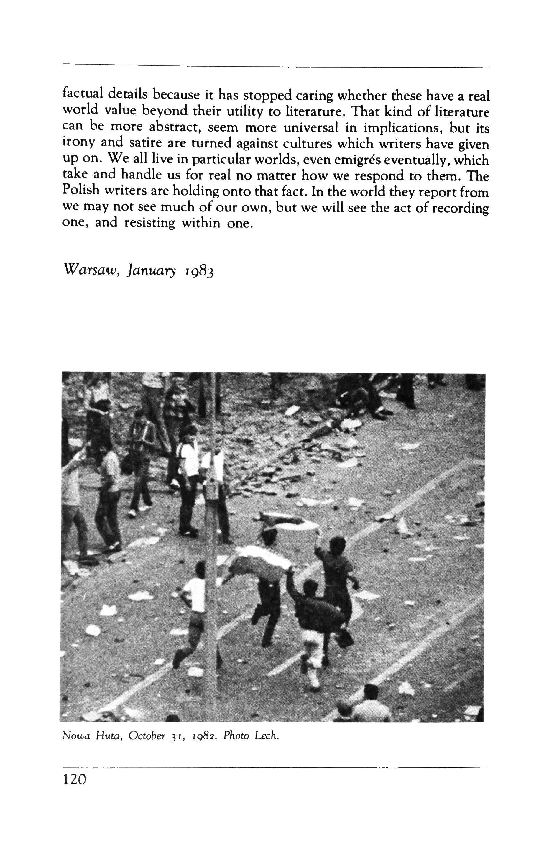 factual details because it has stopped caring whether these have a real world value beyond their utility to literature. That kind of literature can be more abstract, seem more universal in implications, but its irony and satire are turned against cultures which writers have given up on. We all live in particular worlds, even emigres eventually, which take and handle us for real no matter how we respond to them. The Polish writers are holding onto that fact. In the world they report from we may not see much of our own, but we will see the act of recording one, and resisting within one.