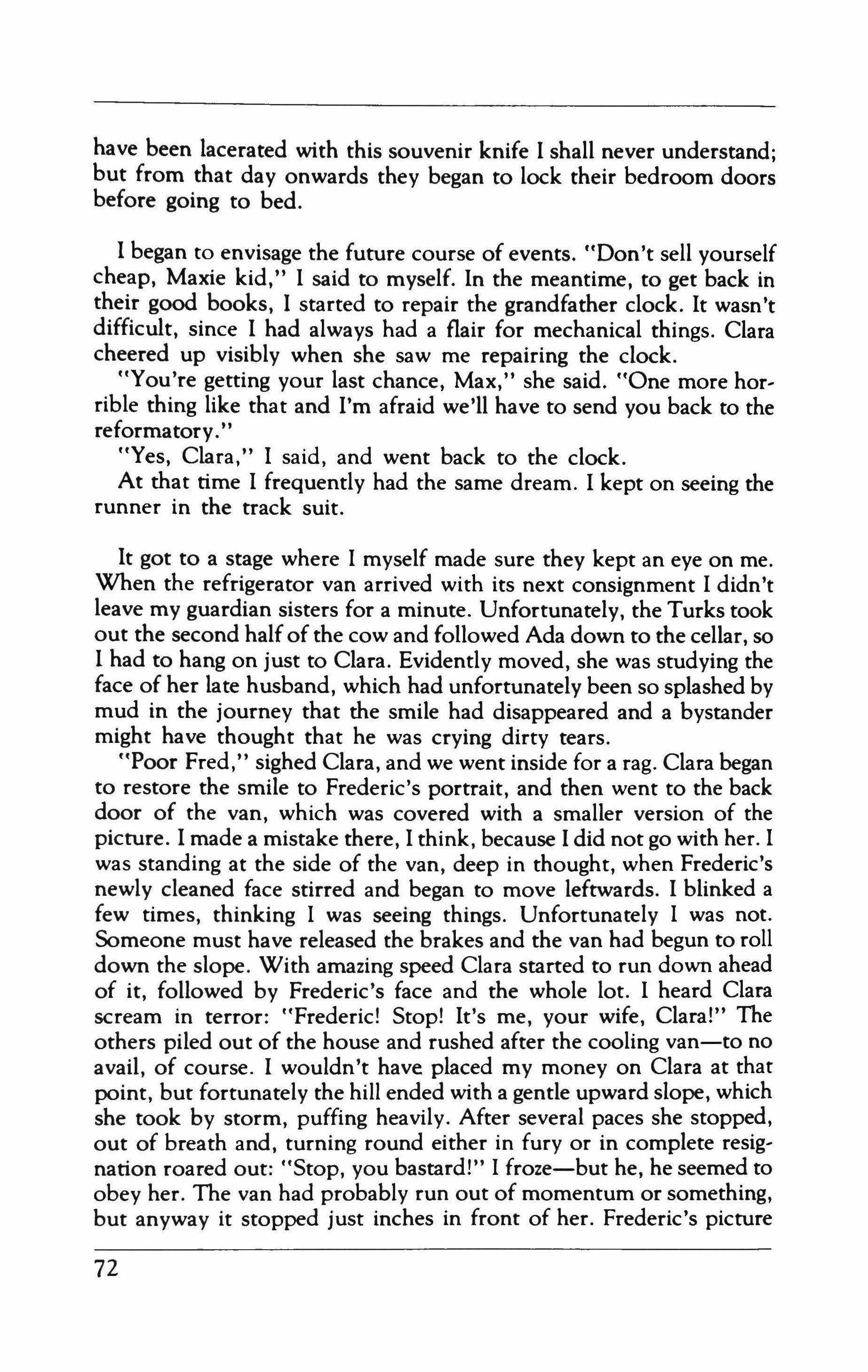 The windows rattled painfully. Hysterical police sirens leapt from some side street. I glanced at the watch my friend Stanislaw D. had once brought me back from a trip to the Soviet Union. It was going on eight. I knew what that meant. Each day at that hour, an armored refrigerator truck carrying food supplies for the ministers and the Party Secretaries raced through the city escorted by police vans. The cavalcade of vehicles flashed past my building splashing the puddles of milk on the street. The archaic milk deliverers, let out of some old-age home for the day, ground out their butts on the muddy sidewalk, exchanging furtive goodbyes.
