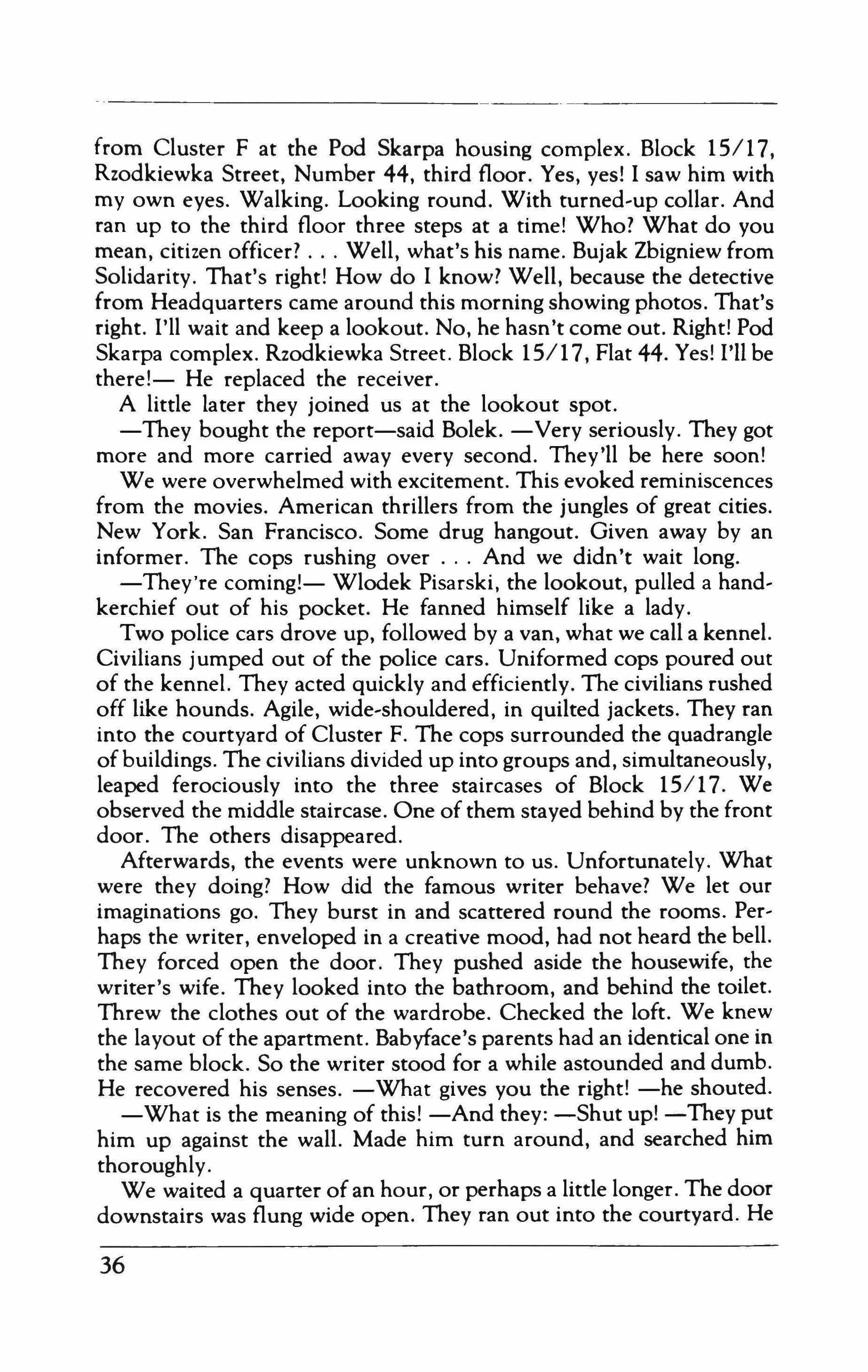 Suddenly the gong by my door rang. I froze by the window, not believing my ears, certain that device had not been working for years. But the elegant, xylophone-like sound was repeated, and more insistently this time. Pulling on an old robe, a present from my brother-in-law, Jan L., I moved guardedly toward the door. I opened the door. Hubert and Rvsio, both wearing their Sunday best, suits which reminded me of the carefree middle seventies, were standing at the top of the stairs.