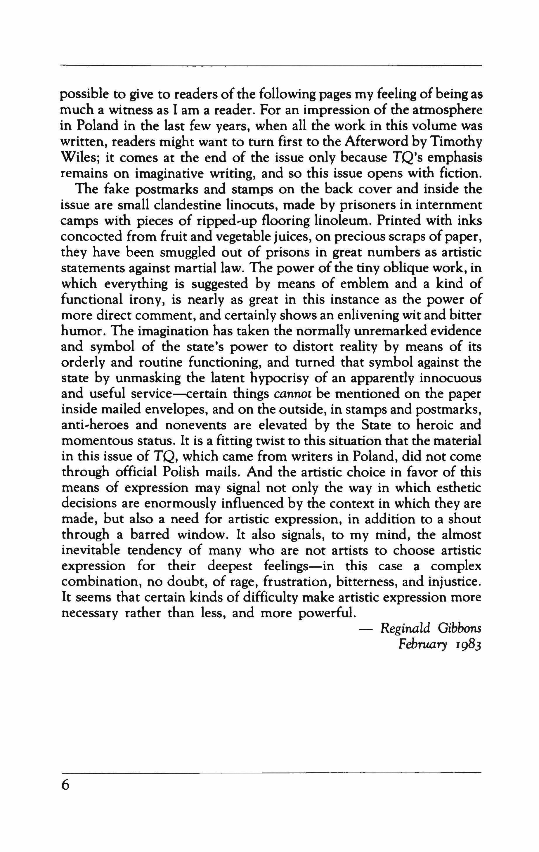 possible to give to readers ofthe following pages my feeling ofbeing as much a witness as I am a reader. For an impression of the atmosphere in Poland in the last few years, when all the work in this volume was written, readers might want to turn first to the Afterword by Timothy Wiles; it comes at the end of the issue only because TQ's emphasis remains on imaginative writing, and so this issue opens with fiction. The fake postmarks and stamps on the back cover and inside the issue are small clandestine linocuts, made by prisoners in internment camps with pieces of ripped-up flooring linoleum. Printed with inks concocted from fruit and vegetable juices, on precious scraps of paper, they have been smuggled out of prisons in great numbers as artistic statements against martial law. The power of the tiny oblique work, in which everything is suggested by means of emblem and a kind of functional irony, is nearly as great in this instance as the power of more direct comment, and certainly shows an enlivening wit and bitter humor. The imagination has taken the normally unremarked evidence and symbol of the state's power to distort reality by means of its orderly and routine functioning, and turned that symbol against the state by unmasking the latent hypocrisy of an apparently innocuous and useful service-certain things cannot be mentioned on the paper inside mailed envelopes, and on the outside, in stamps and postmarks, anti-heroes and nonevents are elevated by the State to heroic and momentous status. It is a fitting twist to this situation that the material in this issue of TQ, which came from writers in Poland, did not come through official Polish mails. And the artistic choice in favor of this means of expression may signal not only the way in which esthetic decisions are enormously influenced by the context in which they are made, but also a need for artistic expression, in addition to a shout through a barred window. It also signals, to my mind, the almost inevitable tendency of many who are not artists to choose artistic expression for their deepest feelings-in this case a complex combination, no doubt, of rage, frustration, bitterness, and injustice. It seems that certain kinds of difficulty make artistic expression more necessary rather than less, and more powerful.
