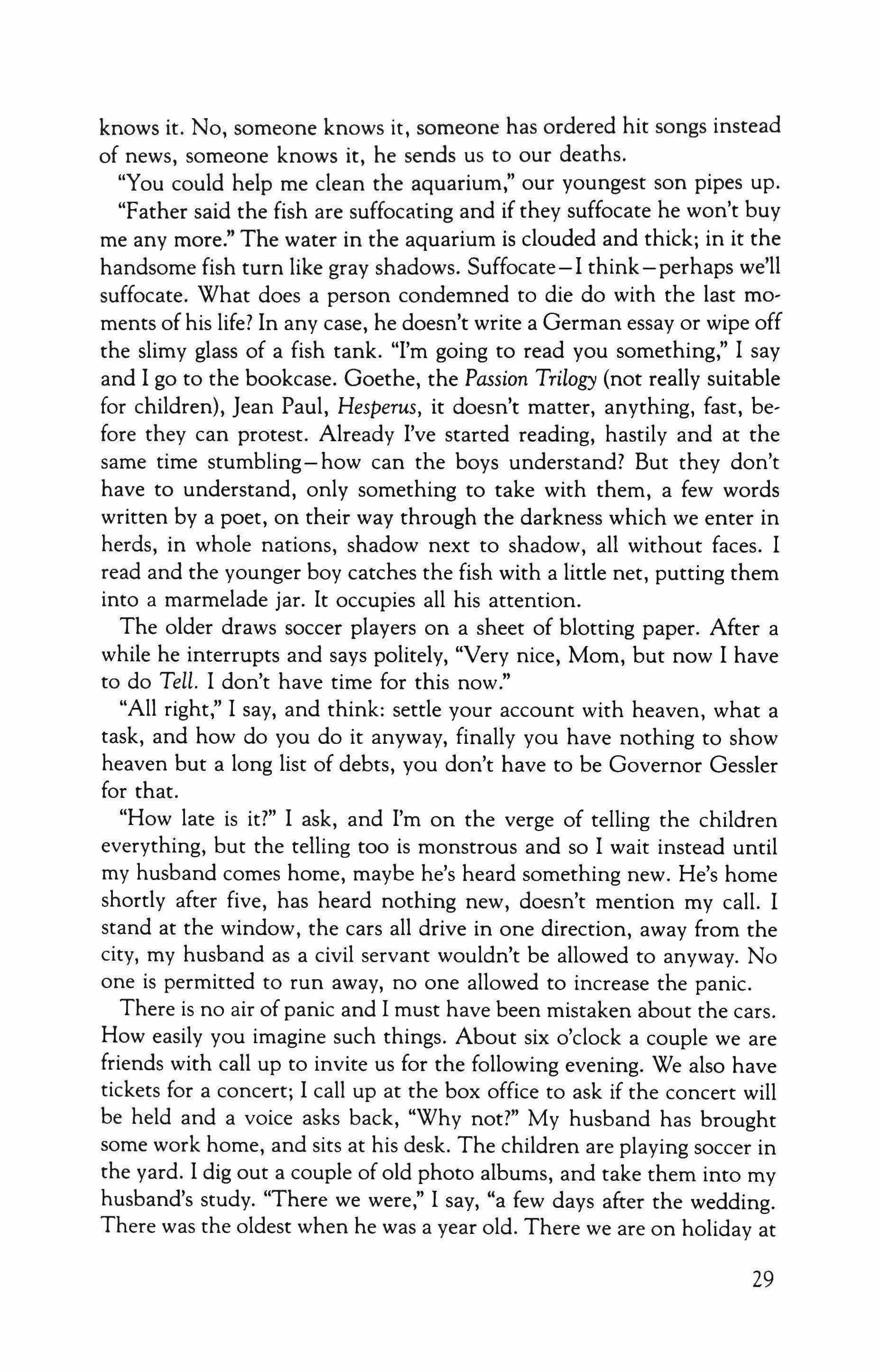But it's true. Do you know the poem Ich weiss niche was soil es bedeuten das ich so ttaurig bin -I don't know what has come over me that makes me so melancholy? When I was in high school we used to recite it to each other. The vision of the siren combing her golden hair, drawing men toward her. Even when I was with Carla-and she had golden hair, like yours, lighter, with a little red in it, yours has some too-even then I felt that melancholy. Perhaps it was because she possessed something she would not surrender. Would it be different today, with young people able to release themselves to each other without inhibition or taboo? But what was taboo between Carla and him except duplicity?