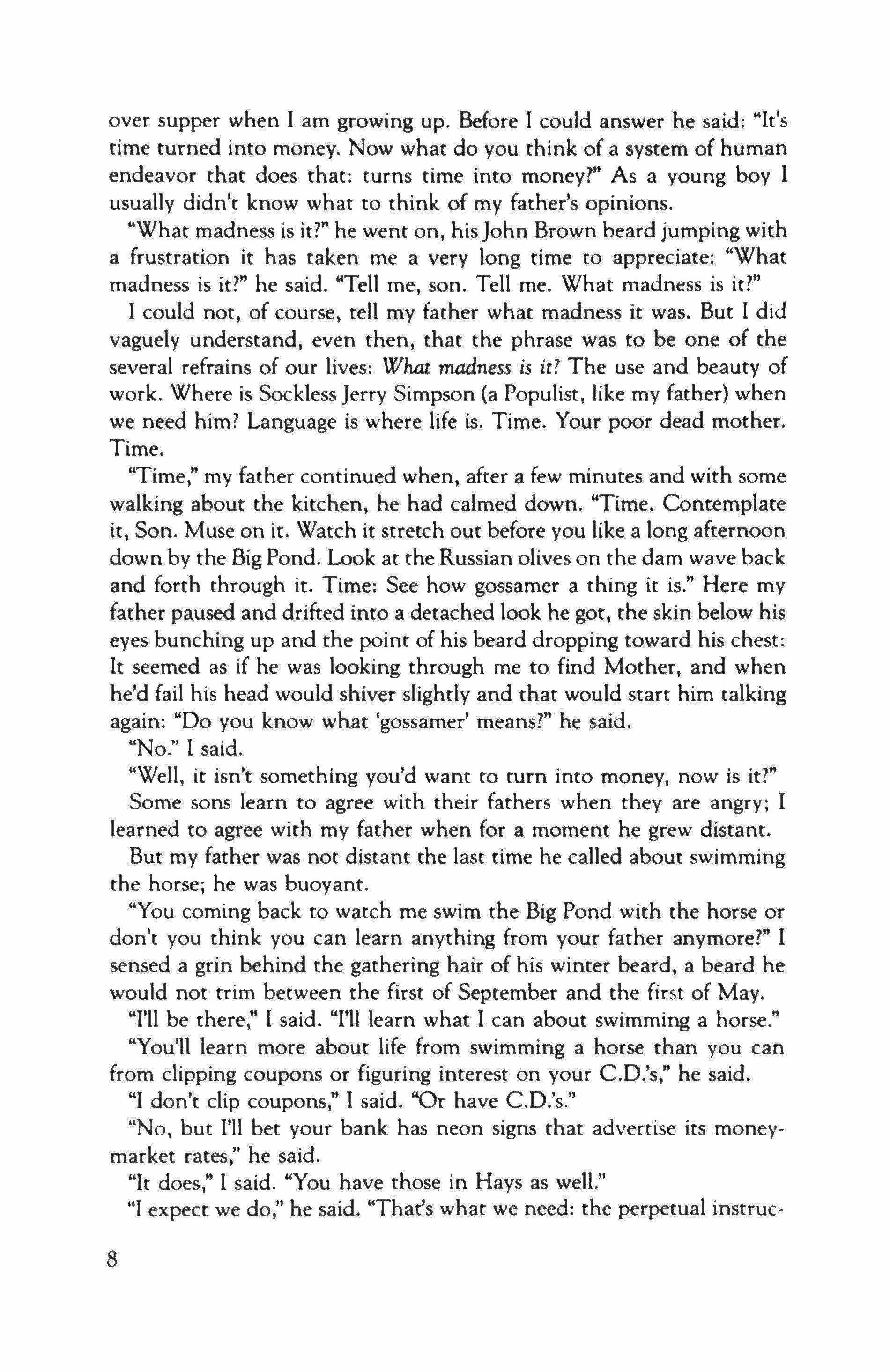 "Time," my father continued when, after a few minutes and with some walking about the kitchen, he had calmed down. "Time. Contemplate it, Son. Muse on it. Watch it stretch out before you like a long afternoon down by the Big Pond. Look at the Russian olives on the dam wave back and forth through it. Time: See how gossamer a thing it is." Here my father paused and drifted into a detached look he got, the skin below his eyes bunching up and the point of his beard dropping toward his chest: It seemed as if he was looking through me to find Mother, and when he'd fail his head would shiver slightly and that would start him talking again: "Do you know what 'gossamer' means?" he said.