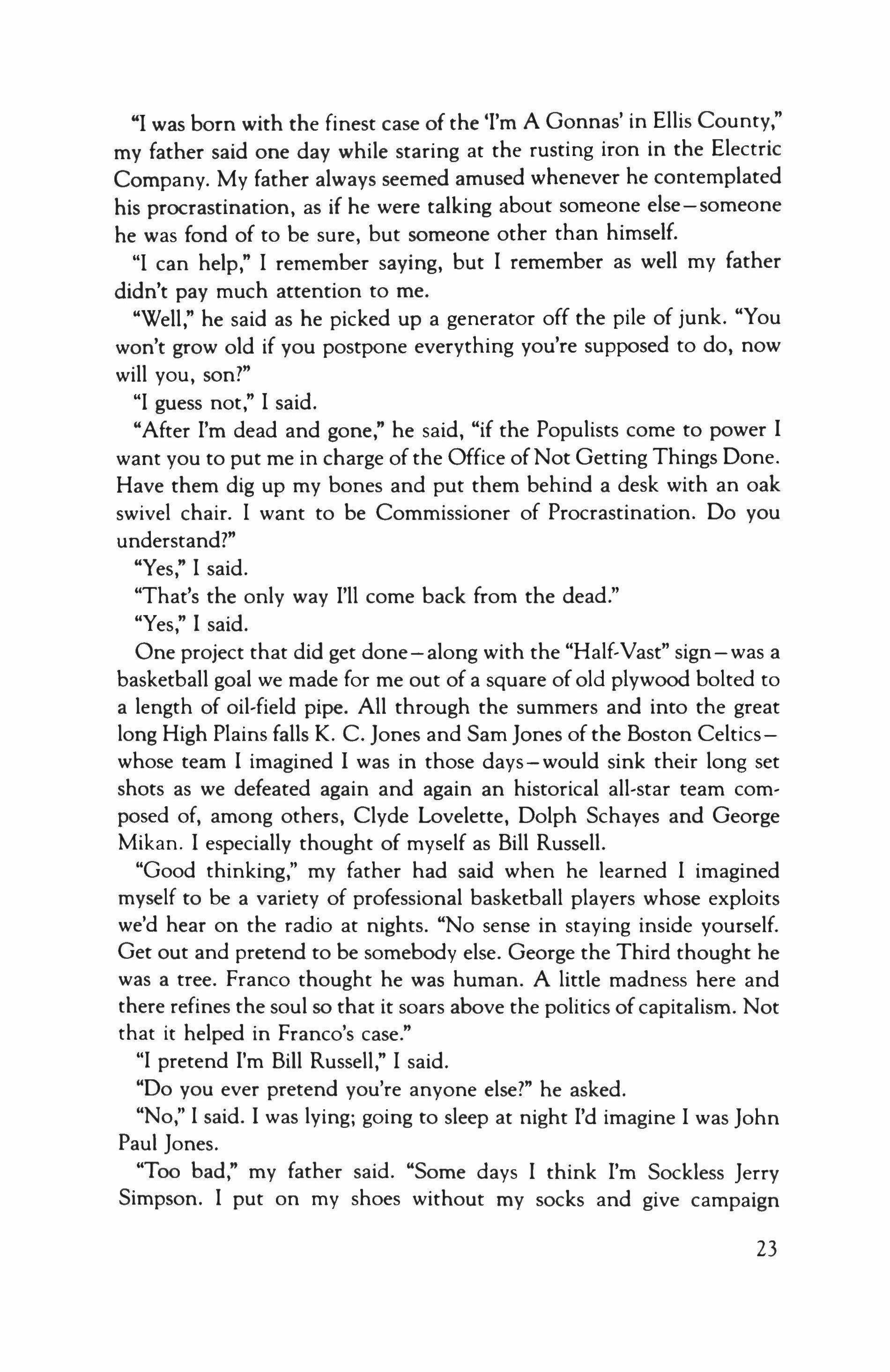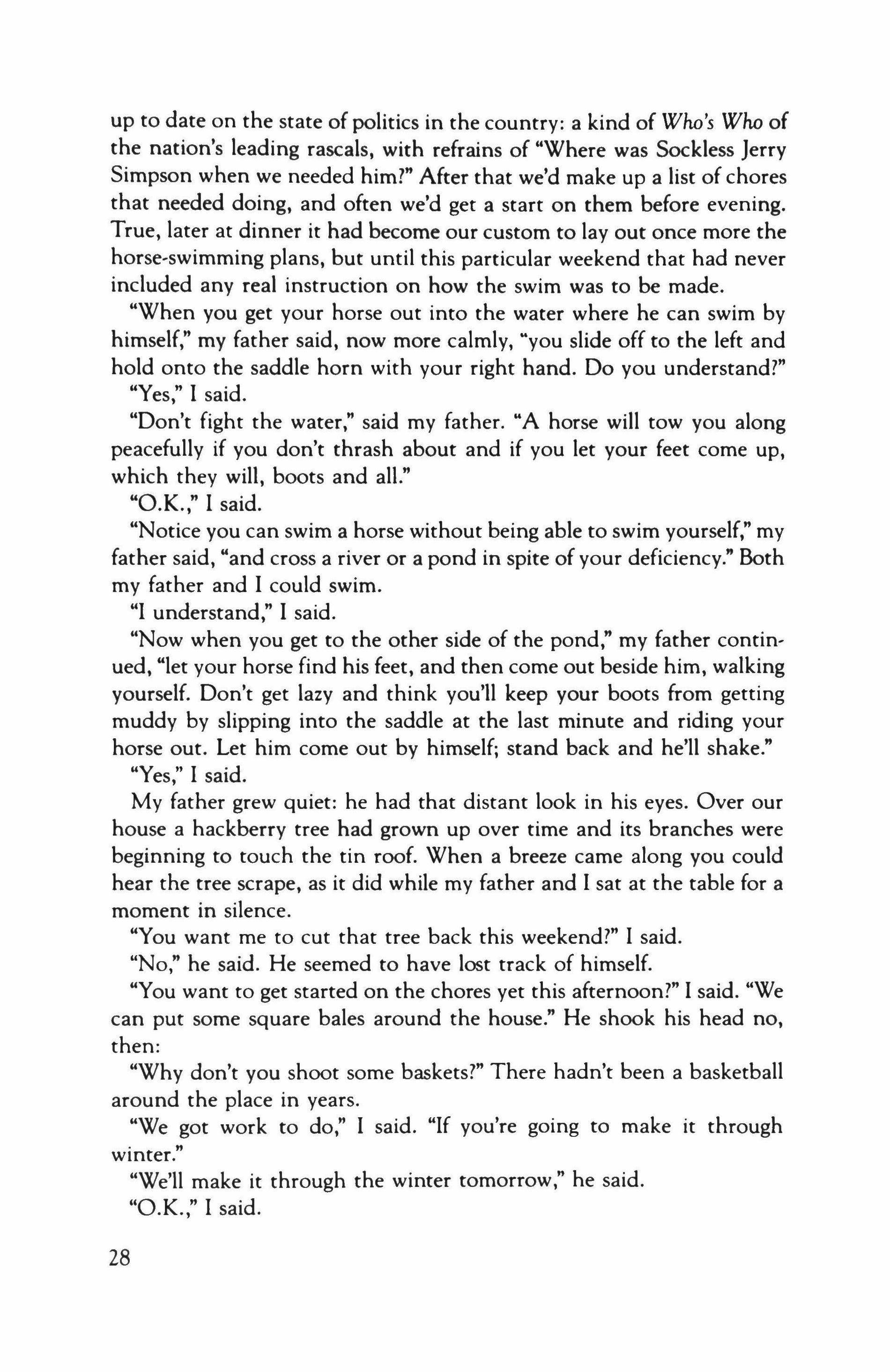 "I'm going to swim the horse this year," my father would say in his annual early-autumn phone calls to me. "You come back and I'll teach you a few things about swimming horses you might need to know-even if you are a vice president of some business that makes its money off the raw red backs of the workingman." My father was a dusty and battered High Plains Populist, probably one or two beyond the last of a dead breed, and his concern for the raw red backs of the workingman permeated his life - as did his hostility toward business vice presidents.