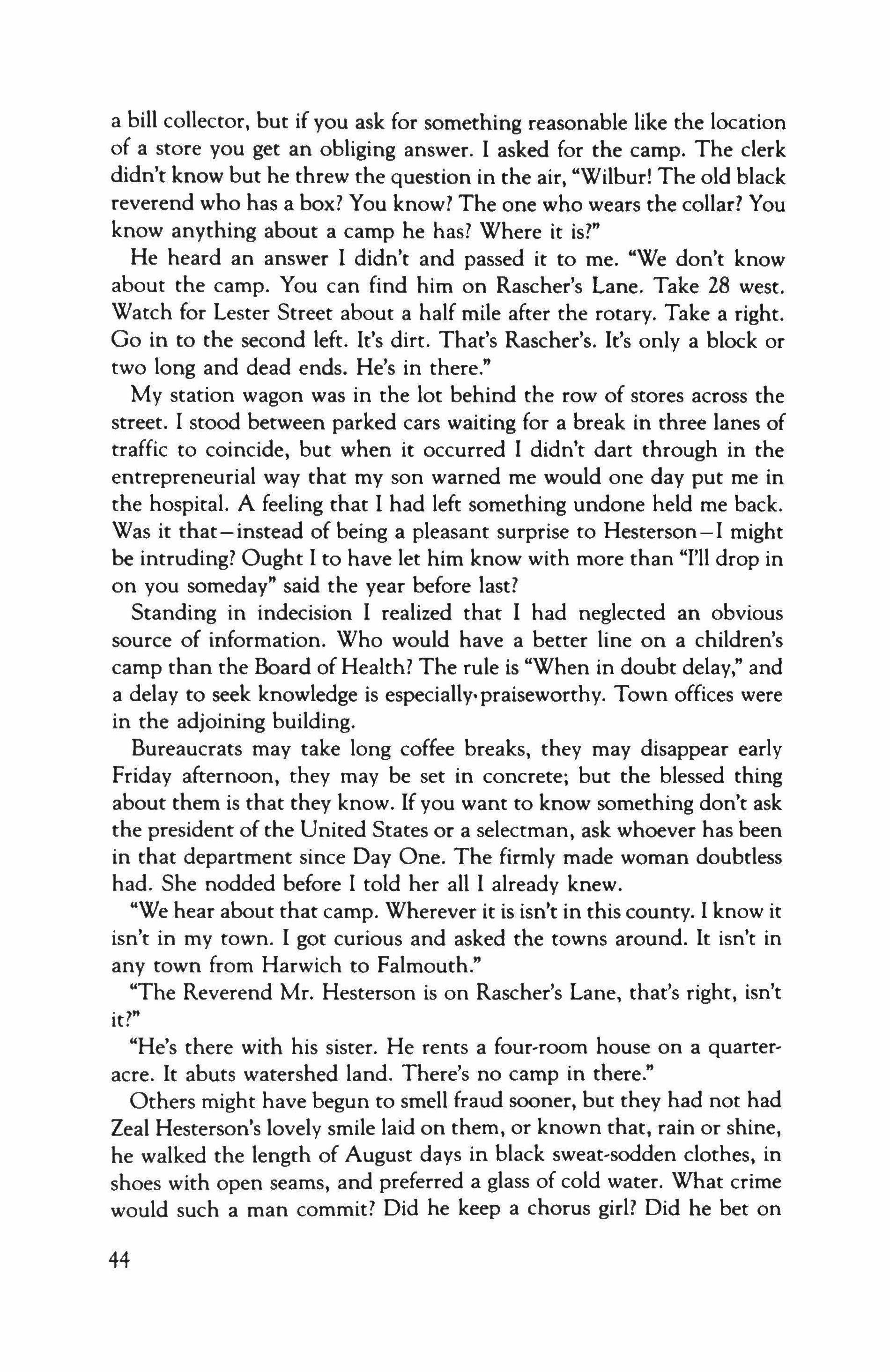 "No you don't," said my father. "Wear out your shoes and grow a garden. It will be good for you. Shoot rabbits in the fall. Tell the vice president to eat soup and save soap slivers. We do. Take a bath twice a week; bathe every day in hot water and your skin will peel off your bones. A little frugality would be healthy for the establishment fat. In the meantime you can keep your horse feed until the price comes down." As I recall that was one of the first times we didn't get around to swimming the pond with Verbena.