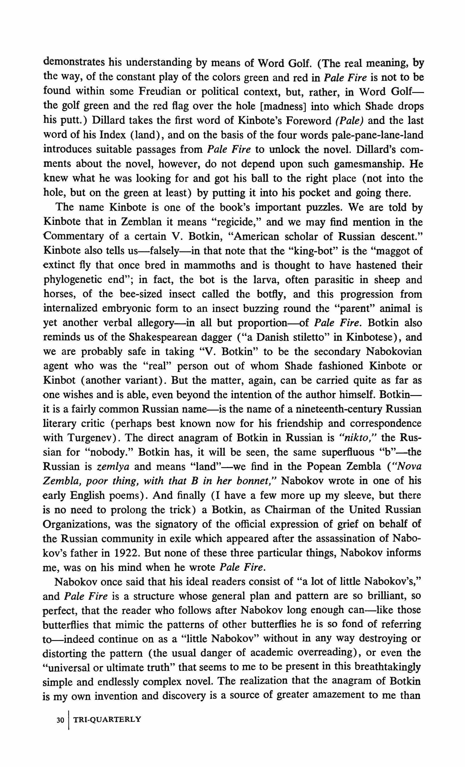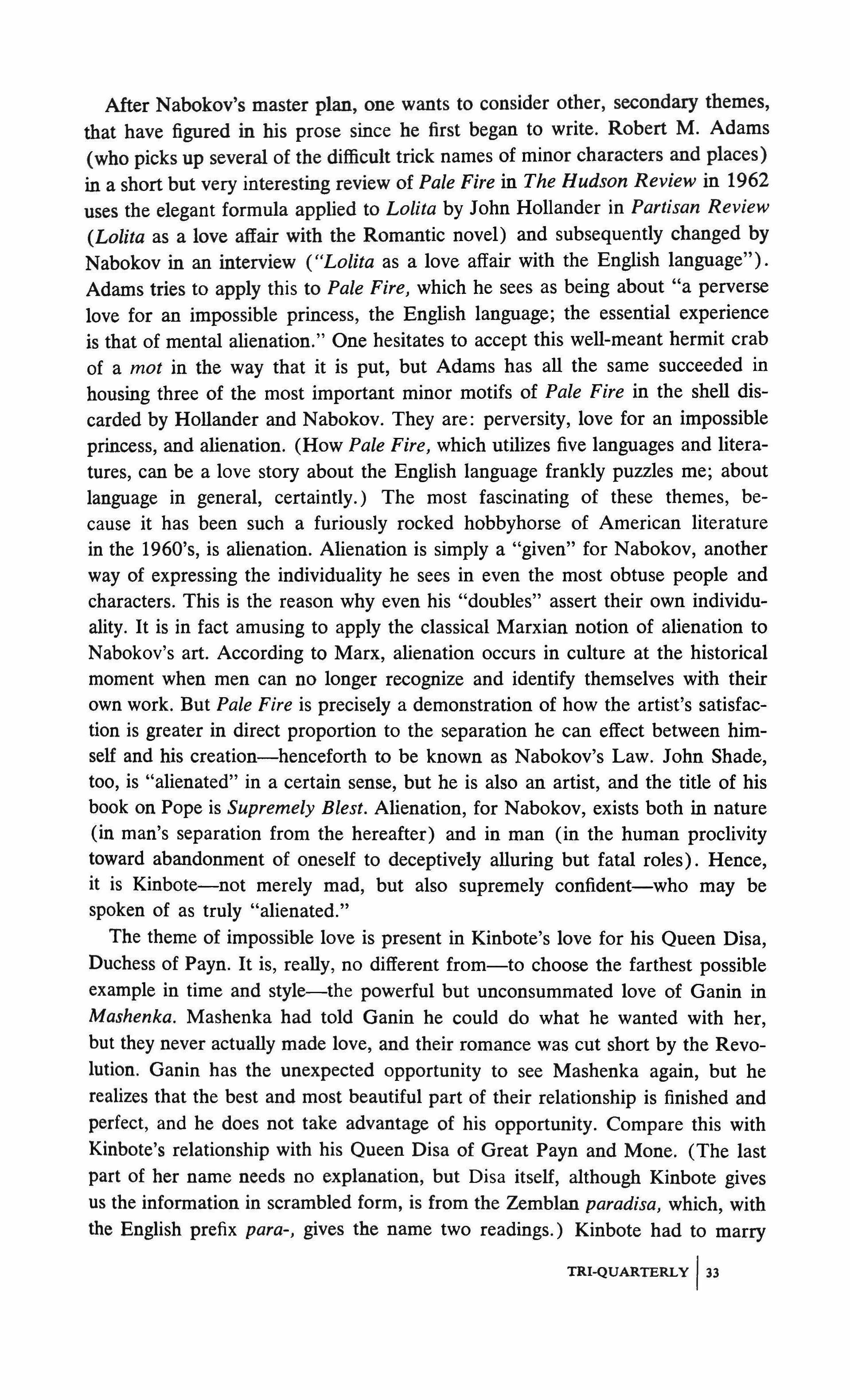 figured plan by certain court figures to draw him into the circle of the revolutionary Humm and, without his knowledge of what is happening, establish him as king in Adulf's place. One part of the elaborate plot is the staging of a mock "mirror-like" trial in which an innocent and pure scholar, Dr. Onze, willingly lets himself be condemned for immoral acts which precisely duplicate those of Adulf, who cannot, of course, himself be brought to trial. The Prince seems not to notice the political parody, in spite of the fact that it is executed with the greatest precision, or, if he does, he gives no sign of it-his only reaction being vexation at not having been invited to take part in Dr. Onze's orgies: "Que de plaisirs perdus!" Onze is convicted, with the general approval of the press and the public at large, but old King Gafon, the nominal ruler, who understands what the trial is about and is as disturbed at his son's behavior as he is powerless to do anything about it, unexpectedly pardons the old scholar. The truly extraordinary and unexpected aspect of the whole trial is the attitude of the public toward Prince Adulf. Quite unexpectedly for the conspirators, the trial not only fails to bring Adulf into public disfavor, but even serves greatly to heighten his popularity, since the trial is erroneously seen by the masses as a delightful public spectacle proceeding with the gracious tacit consent of the good young prince. One should be careful then: as doubtful as his story is in other respects, Kinbote's sobriquet "Charles the Beloved" may not be fantasy. Whatever speculations the story of Adulf gives rise to, however, evidence from Salus Rex can have no clearcut probative value in regard to Pale Fire. Charles Kinbote is the reader's sole source of information abount Zembla, and we are ultimately left in the same position in which we found ourselves with Hermann Karlovich in Despair, unsure which, if any, of the many stories taking place represents the "true" version. The palace intrigue of which Kinbote tells in his Commentary ("A palace intrigue is a spectral spider that entangles you more nastily at every desperate jerk you try") is an attempt to make him renounce the delights of sodomy. His pederasty is the most outstanding characteristic he holds in common with Prince Adulf. This new information culled from Salus Rex ought not to be used to "unlock" Pale Fire, for what is not found between the covers of a novel does not exist as far as that novel is concerned. But the probability of "another Zembla" hidden behind Kinbote's arabesque account seems most helpful in reading the Commentary, even though that "real Zembla" can never be substantiated. The title that Kinbote wanted John Shade to use for his poem is Salus Rex!