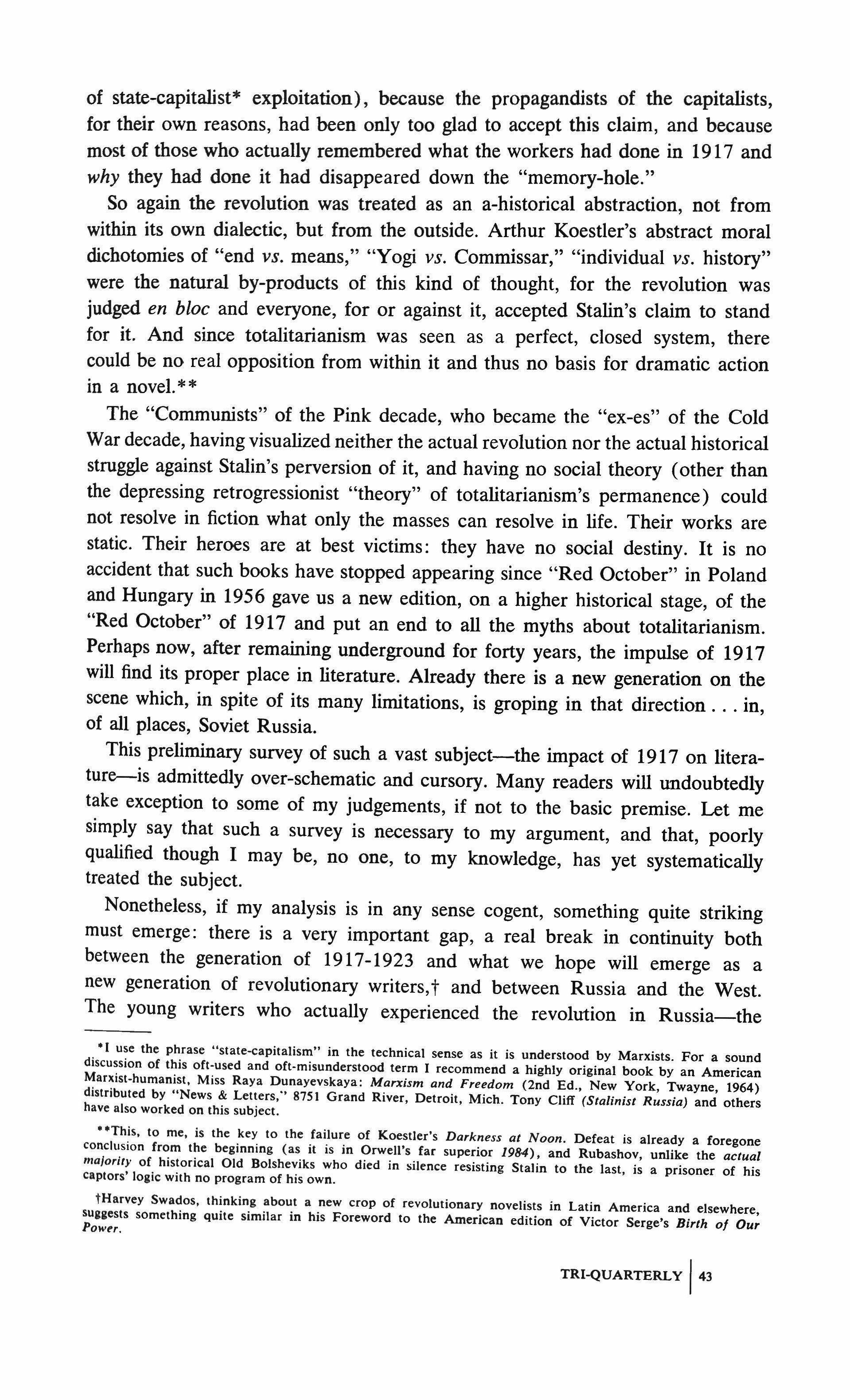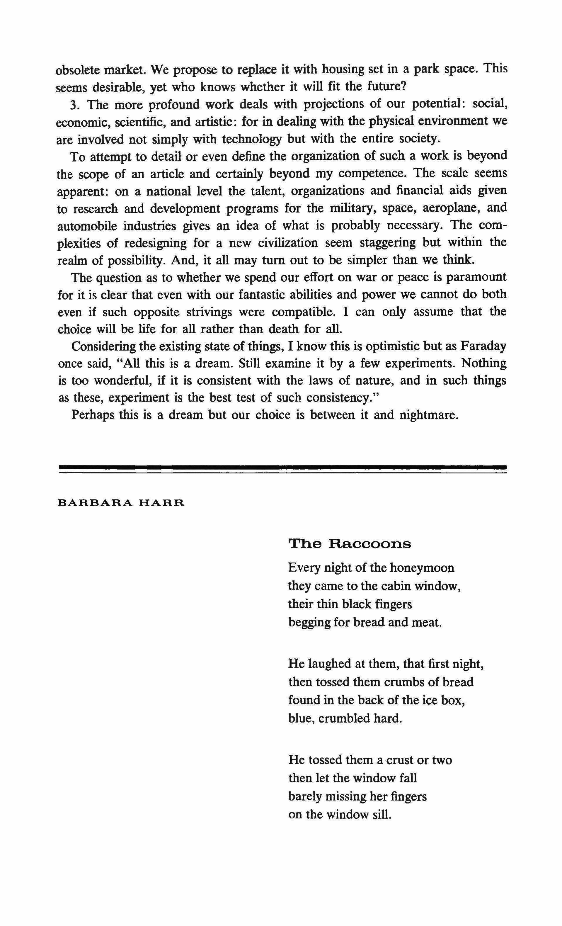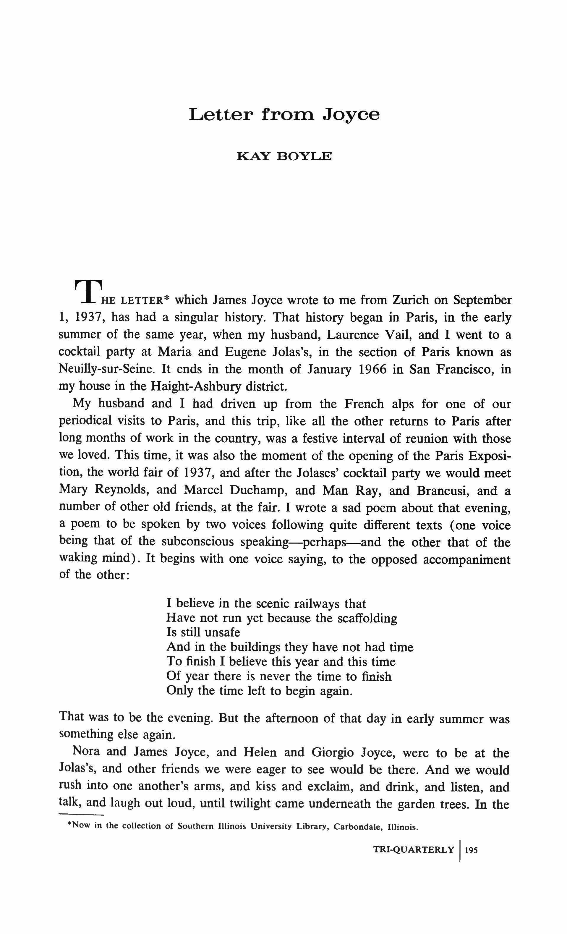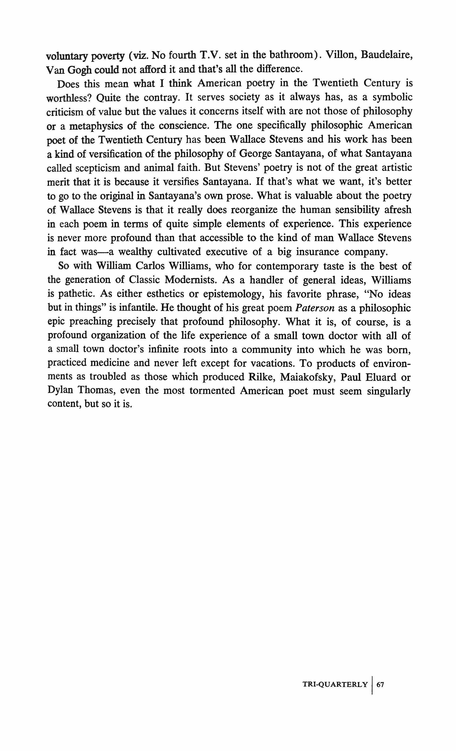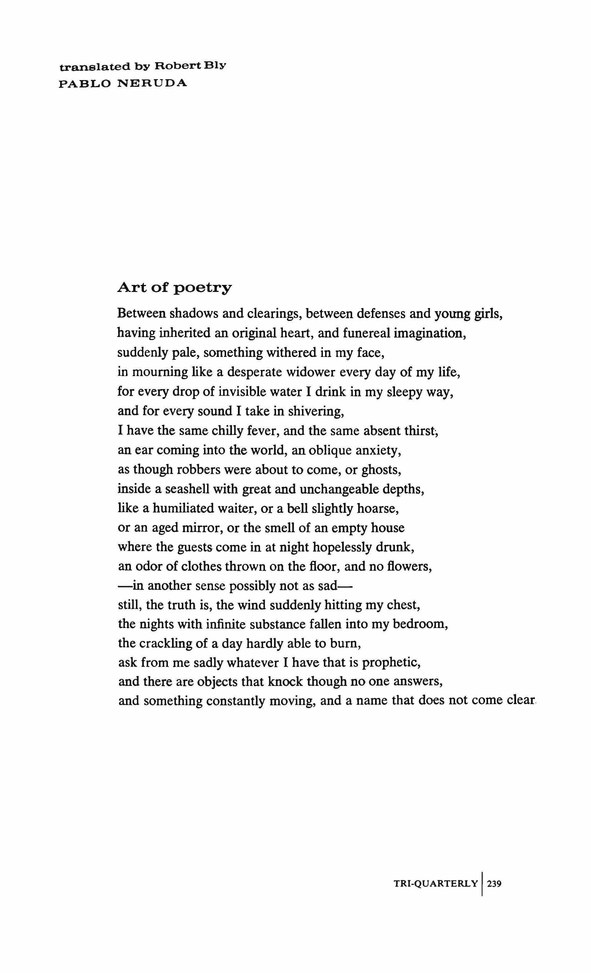 ANDREW FIELD's book length study, Nabokov: His Life in Art, will be published in April by Little, Brown in the United States and by Hodder & Stoughton in England. He is currently at work on a novel, Fractions, as well as other critical work. Doubleday will publish RICHARD GREEMAN's translations of Birth of Our Power, Men in Prison, and Conquered City, by Victor Serge. Mr. Greeman is on the editoral board of News & Letters, and teaches French at Columbia College where he is completing his dissertation on Serge. KENNETH REXROTH's An Autobiographical Novel was published in 1965 by Doubleday. EDWARD HUNGERFORD teaches Shakespeare and Creative Writing at Northwestern University. MICHAEL POLANYI is a member of The National Society of Science, Letters and Arts, the Max Planck Society, a fellow of the Royal Society and a foreign honorary member of the American Academy of Arts and Sciences. He is currently associated with The Center for Advanced Studies at Wesleyan University. BERNARD SOLOMON is Associate Professor at Queens College, New York City, where he teaches Chinese language, literature, and civilization. WALLACE DOUGLAS is Professor of English at Northwestern University, and chairman of The Curriculum Center in English. PERCIVAL GOODMAN is Professor of Urban Design at Columbia's School of Architecture. Co-editor of the planning text, Communitas, with his brother, Paul Goodman, he is also a painter, sculptor, and book illustrator. WILLIAM EARLE is Professor of Philosophy at Northwestern University, and is the author of Objectivity (Noonday Press, 1962) and a translation of Karl Jaspers' Reason and Exlstenz. He has made some dozen short films. RICHARD ELLMANN's latest book, The Letters of James Joyce, was published by Viking Press in the fall of 1966. KAY BOYLE has authored more than two dozen books including novels, short-story collections, poems, histories, and children's books. VIVIAN MERCIER is author of The Irish Comic Tradition (Oxford, 1962), and is presently at work on a Reader's Guide to the French New Novel. He teaches English at the University of Colorado, Boulder. FRANK BUDGEN, author of James Joyce and the Making of Ulysses, now lives in London where he is at work on his autobiography. WALTER ARNDT, whose English translation of Pushkin's verse novel, Eugene Onegin, won a Bollingen Prize, has begun work on a complete translation of Faust. He teaches at Dartmouth College. I. A. SALOMON has received a grant from the National Endowment for the Arts, toward the completion of his work in progress, Dino Campana: Orphic Songs, to be published by October House. He is the the author of Unit & Universe and Carlo Betocchi: Poems. BEN BELITT received a National Institute of Arts and Letters award in 1965 for his most recent collection of poems, The Enemy Joy, which was also a nominee for the National Book Award. He is at work on Further Poems of Pablo Neruda while on sabbatical leave from Bennington College. ROBERT BLY's translation of "Art of Poetry" will be published in Twenty Poems of Pablo Neruda by The Sixties Press. His June, 1966 interview with Neruda was published in the August 14 issue of Bookweek. Chilean poet PABLO NERUDA's most recent work, Memorial de Isle Negra was published in Argentina in 1964 in five volumes on the occasion of his 60th birthday. MICHAEL LEBECK's translation of twenty poems from Gottfried Benn has just appeared in Germany. IRWIN WElL has been a United States Exchange Professor at Moscow University, and is presently Associate Professor of Russian Literature at Northwestern University. His book on Gorky was published by Random House in 1966. BROCK BROWER is the author of The Tender Edge and A Little to the Left. He is presently at work on a novel. RICHARD KOSTELANETZ is the editor of On Contemporary Literature (Avon), The New American Arts (Horizon), and Twelve of the Sixties (Deli). He is presently at work on The Theatre of Mixed Means to be published in the fall by Dial Press. B. H. HAGGIN's most recent book is Music Ob�erved. This essay is from notes for The Toscanini Musicians Knew, to be published by Horizon Press in April. HOWARD NEMEROV's latest book is Poets on Poetry (Basic Books, 1966).