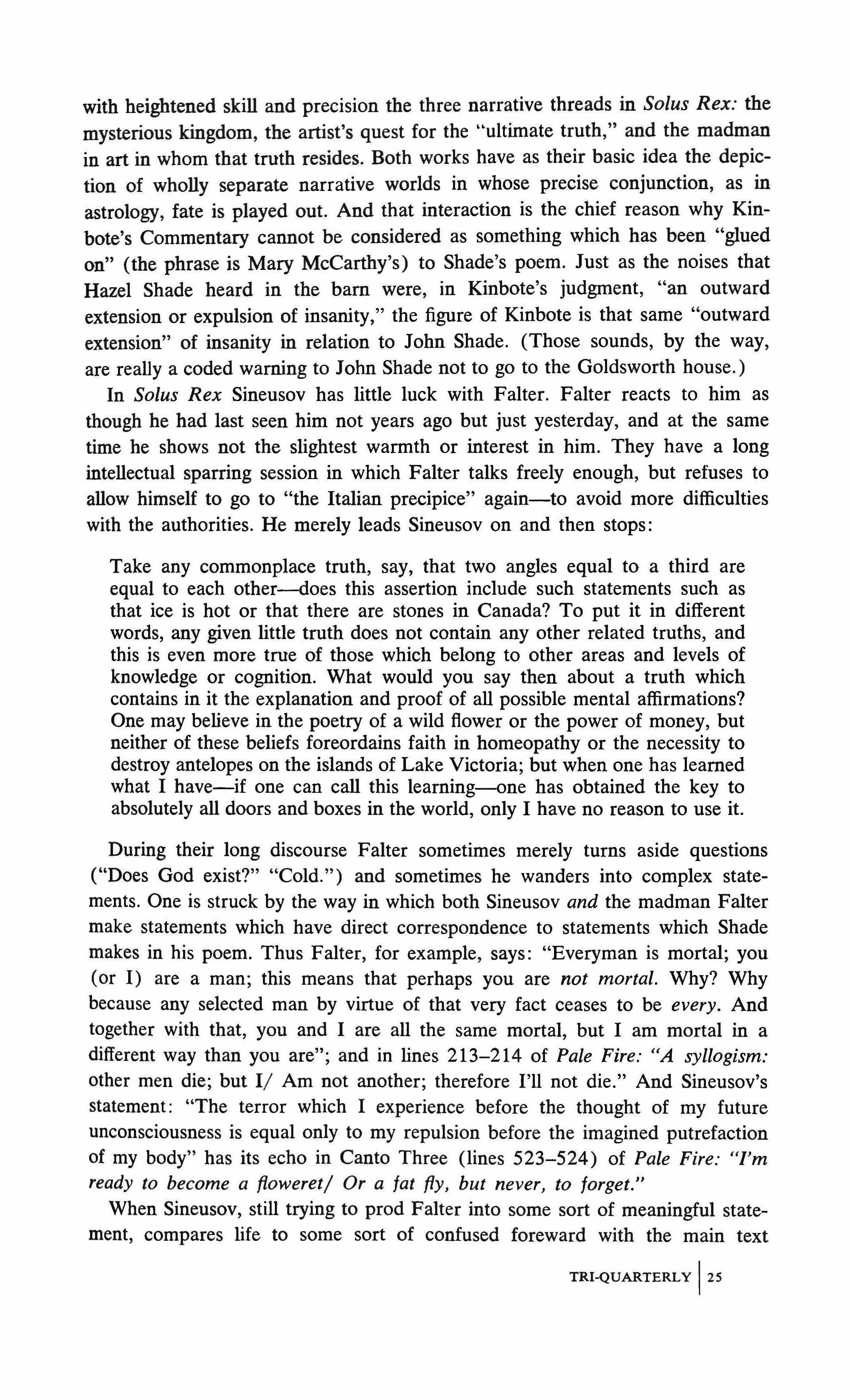 Though Solus Rex cannot be profitably discussed in and of itself, it does provide a most instructive "commentary" of its own when placed in juxtaposition to Pale Fire. (Most strikingly, the connection between the two parts of Solus Rex is as tenuous as that between John Shade's poem and Kinbote's Commentary in Pale Fire.) Solus Rex and Pale Fire-and this cannot be stressed too strongly ---do not coincide in specific characters or narrative structure; but the more subtle coincidences of theme and aesthetic logistics are so striking that one cannot help but see the strong link or, as Nabokov put it, "family relationship" between the two works. Indeed, there are sufficient grounds to suppose, on the basis of the two extant portions, that had it been completed, Solus Rex would have taken a form almost as unorthodox as Pale Fire's. Solus Rex provides the happy service, even in its fragmentary state (72 printed pages in all), of openly treating certain themes that are central to both Solus Rex and Pale Fire, but are partially hidden and refracted in the completed novel.