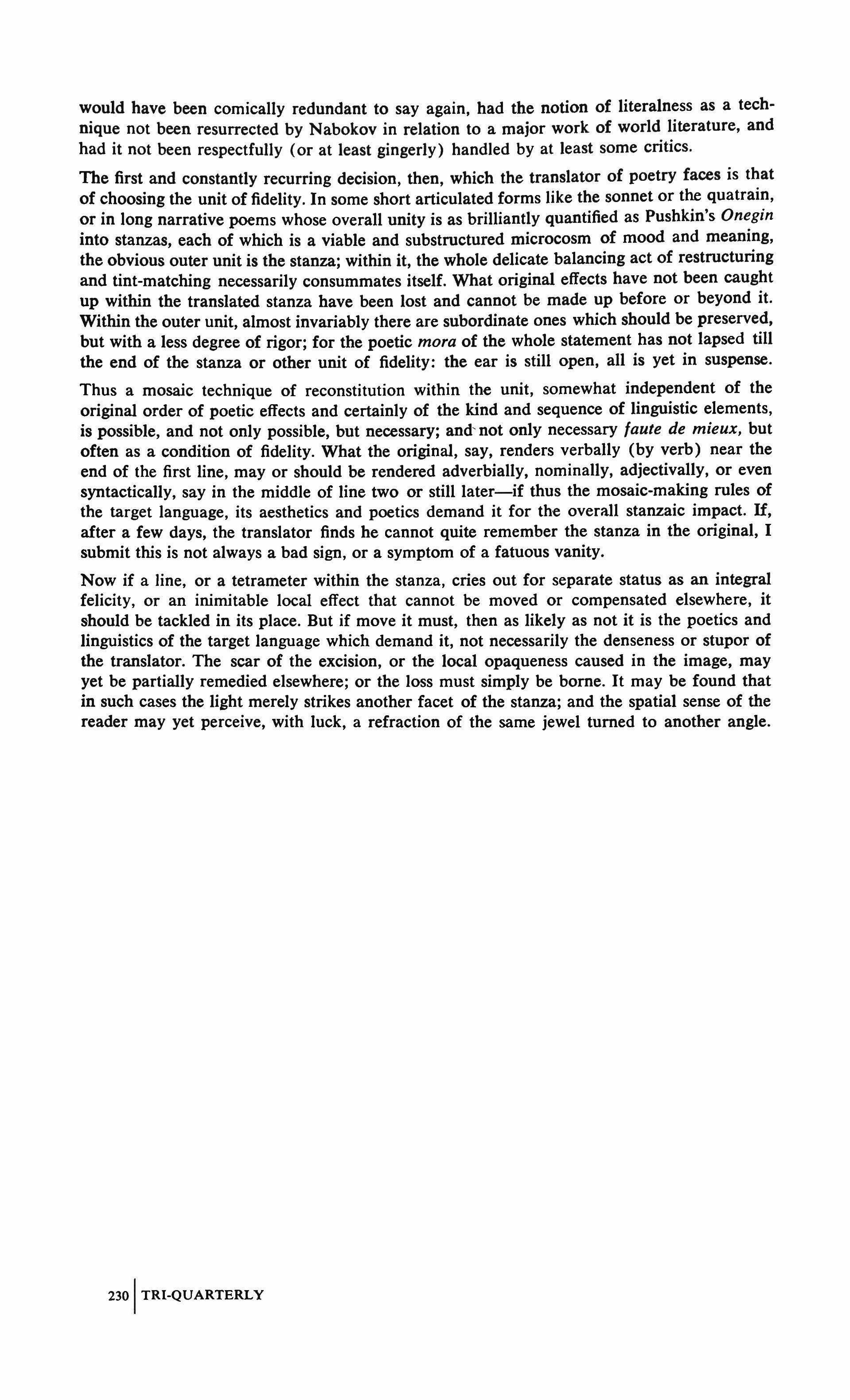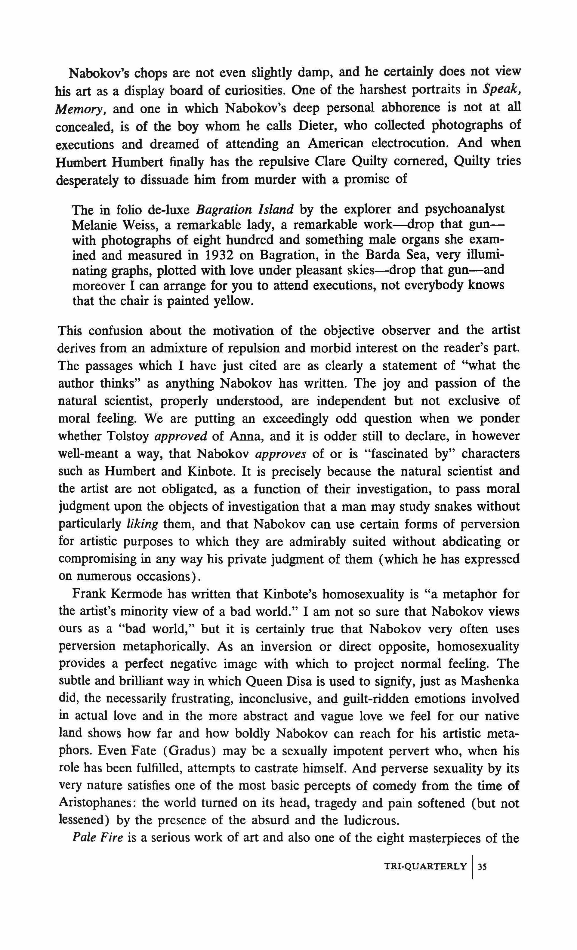 The above article forms chapter ten of Andrew Field's book, Nabokov: His Lile in Art, Copyright @ 1967 by Andrew Field and printed by permission of Little, Brown, and Co. Because Nabokov: His Lite in Art is a "critical narrative," the author has requested that the editors of Tri-Quarterly emphasize the fact that this single chapter does not contain the whole of the book's discussion of Pale Fire.