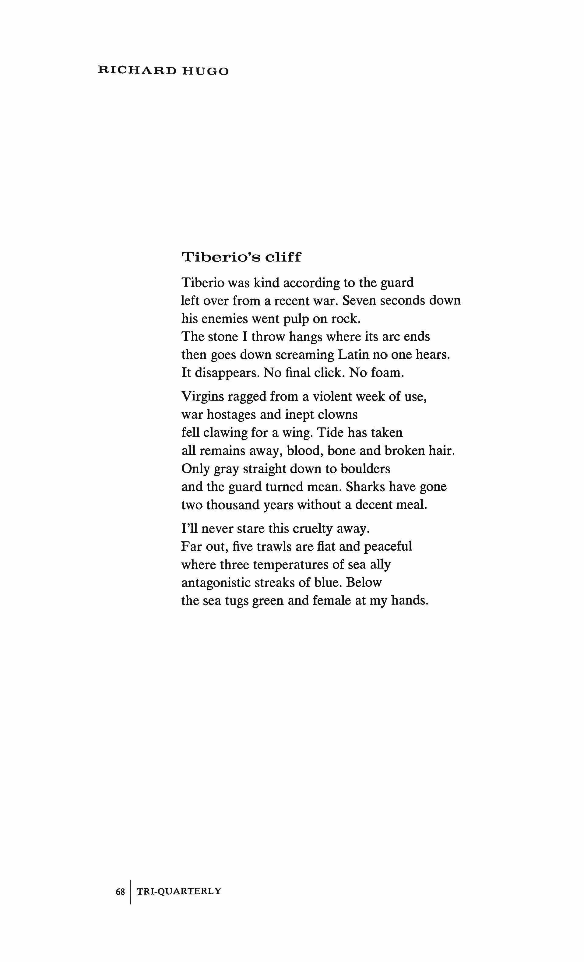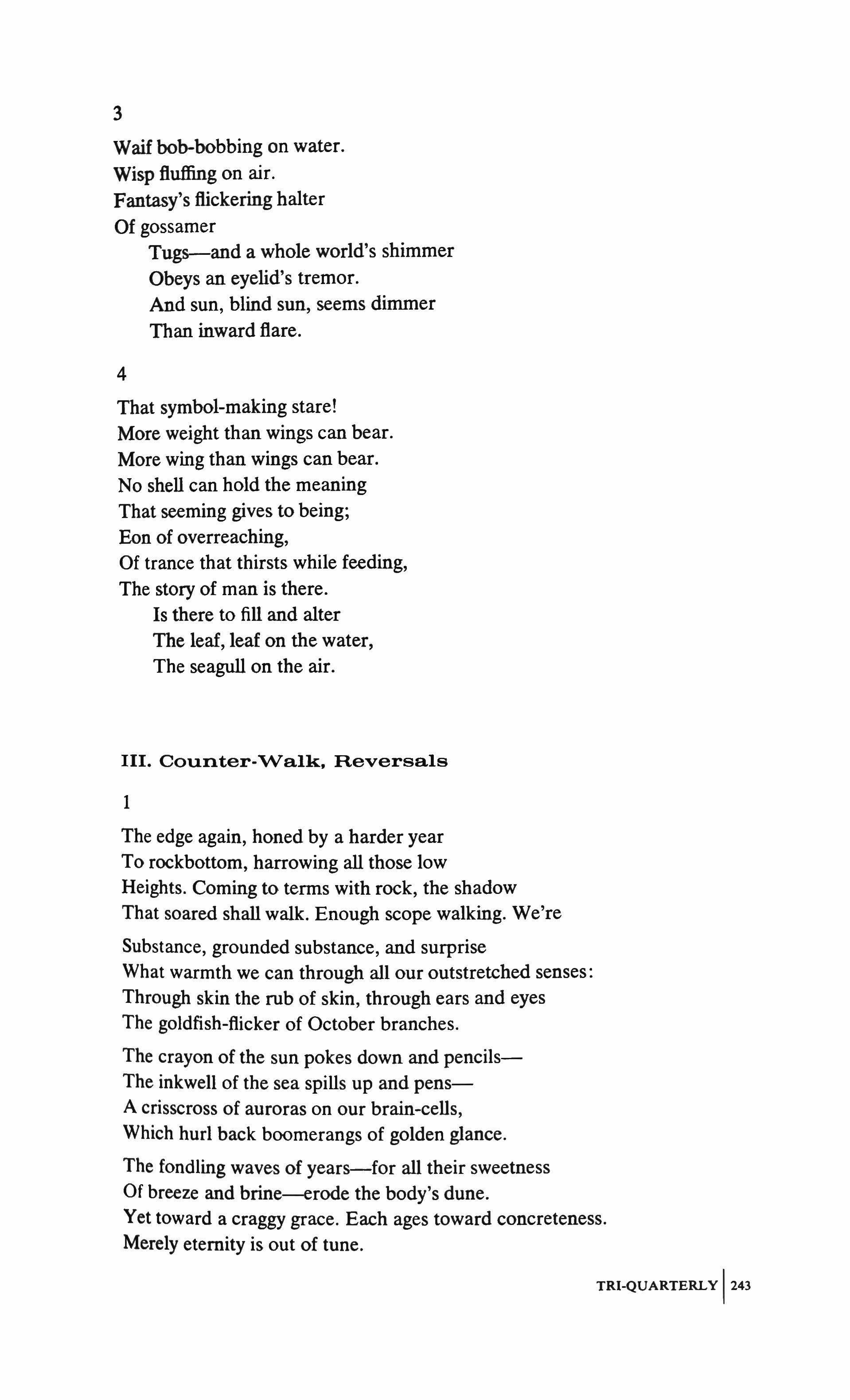 CARL BODE is Professor of English at the University of Maryland. His latest book of poems is The Man Behind You. PETER VIERECK's New & Selected Poems will appear from Bobbs-Merrill in the spring. Just returned from his fourth trip to Russia, he is at work on a book on the Soviet rebel poets. X. J. KENNEDY is author of Nude Descending a Staircase (Doubleday, 1961). He is currently visiting lecturer in poetry at the University of California, Irvine. RICHARD HUGO has published two books of poems, A Run of lacks and Death of the Kapowsin Tavern. He teaches poetry at the University of Montana. WILLIAM BROWN is undertaking an anthology of contemporary Vietnamese poetry. He is looking for manuscript and a publisher. RON LOEWINSOHN is author of Watermelons (Totem Press, 1959), The World of the Lie (Change Press, 1963), and Against the Silences to Come (Four Seasons, 1965). He is represented in several contemporary anthologies. LEWIS TURCO teaches at State University College, Oswego, New York. His poems have appeared in numerous journals and anthologies. BARBARA HARR teaches at The University of Montana. ROBERT BLOOM lives in New York, and has published poetry in many periodicals. AARON SISKIND (covers) has made several documentary film studies, as well as specialty studies in architecture. He teaches photography at The Illinois Institute of Technology. Mr. Siskind, who is founder and co-editor of Press, and co-editor of Choice, has exhibited internationally in one-man showings, including five in New York City. His book, A aran Siskind/Photographs, was published by Horizon Press in 1959. His most recent one-man appearance was a retrospective show at The University of Rochester, in 1966. Of his work the art critic Tom B. Hess has said, "He has brought his medium, for the first time in its history, to that mysterious field where illusion and reality meet in perpetual conflict: the picture plane Siskind has transferred the antagonism between what is (paper, emulsion, a simulacrum of nature) and what seems (an abstract shape, a texture, a gesture) to his own medium." E. M. CIORAN, a Rumanian-born philosopher and essayist now living in Paris, contributed his very controversial essay "On the Jews" to Tri-Quarterly #4. These essays will be published in The Temptation to Exist forthcoming from Quadrangle Books, Chicago, his first book to appear in English.
