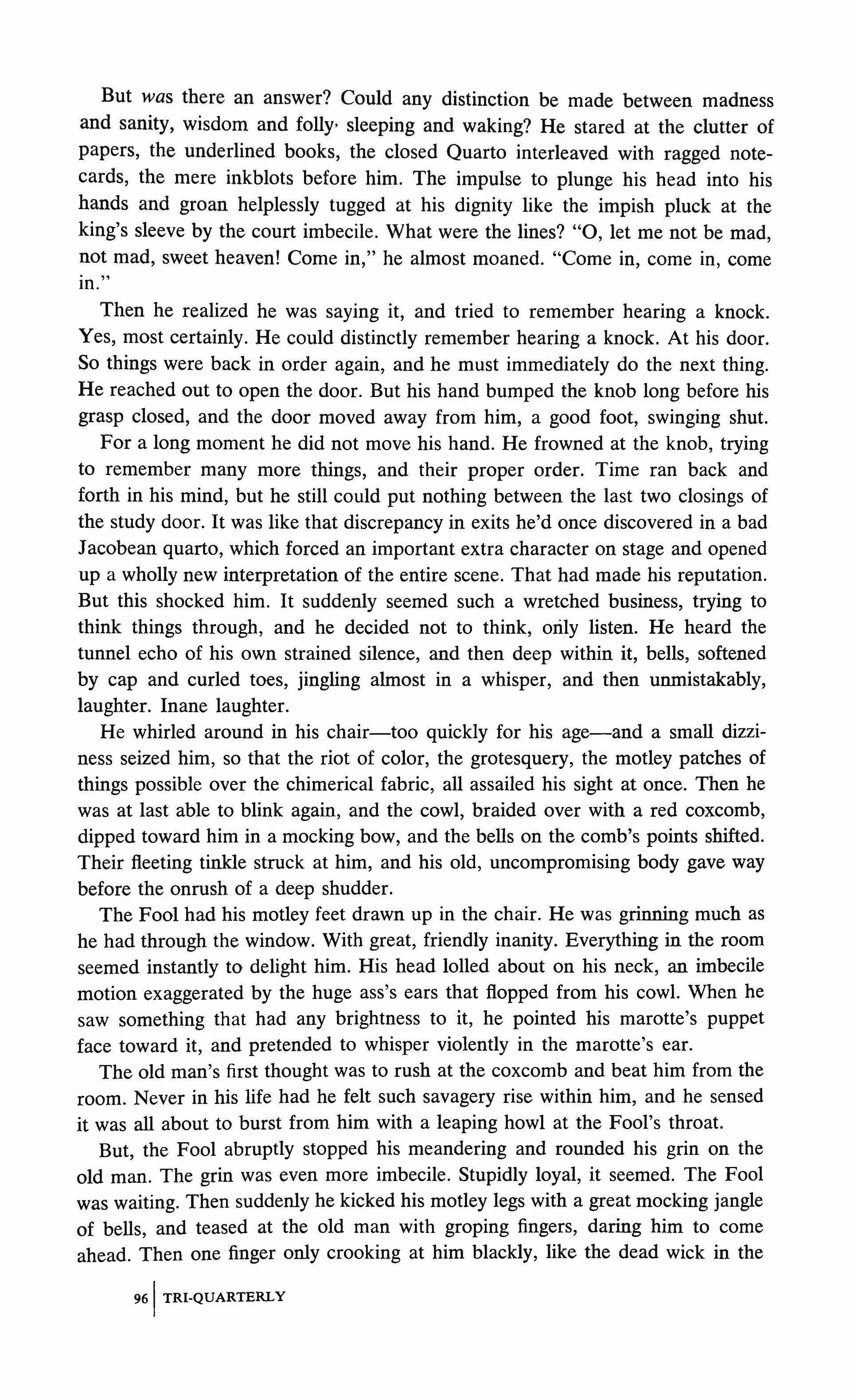 There are three kings in Solus Rex, and one, named Kr, rules as the result of a long court intrigue to do away with the depraved Prince Adolf, whose father, the previous ruler King Gafon, suffered from "quiet madness." There is no indication as to what happened to King Gafon, nor as to whether Adolf (or, in the first portion, Adulf) actually ascended the throne; we know only, from a reference to "poor Adolf" in the second portion, that the prince was not murdered, but escaped into exile instead. The king who is most fully described in Solus Rex is Kr, but it is obviously Prince (or King) Adulf who corresponds most closely to Charles the Beloved, "the self-banished king" of Zembla. And this similarity between Adulf and Charles leads to consideration of a most interesting and likely possibility about King Charles the Beloved's accounts of Zembla and Zemblan history.
