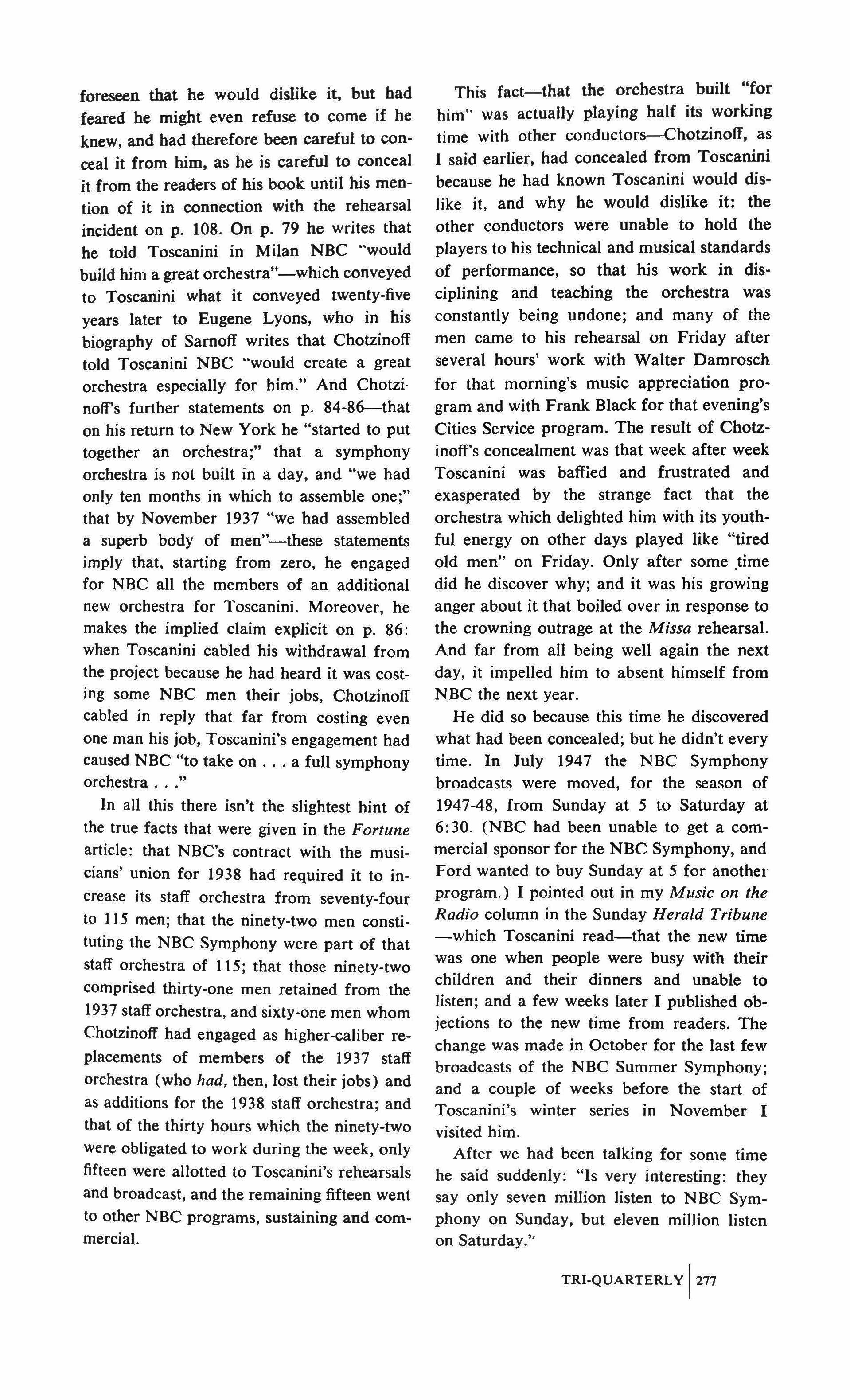 foreseen that he would dislike it. but bad feared he might even refuse to come if he knew, and had therefore been careful to conceal it from him, as he is careful to conceal it from the readers of his book until his mention of it in connection with the rehearsal incident on p. 108. On p. 79 he writes that he told Toscanini in Milan NBC "would build him a great orchestra"-which conveyed to Toscanini what it conveyed twenty-five years later to Eugene Lyons, who in his biography of Sarnoff writes that Chotzinoff told Toscanini NBC "would create a great orchestra especially for him." And Chotzineff's further statements on p. 84-86-that on his return to New York he "started to put together an orchestra;" that a symphony orchestra is not built in a day, and "we had only ten months in which to assemble one;" that by November 1937 "we had assembled a superb body of men"-these statements imply that, starting from zero, he engaged for NBC all the members of an additional new orchestra for Toscanini. Moreover, he makes the implied claim explicit on p. 86: when Toscanini cabled his withdrawal from the project because he had heard it was costing some NBC men their jobs, Chotzinoff cabled in reply that far from costing even one man his job, Toscanini's engagement had caused NBC "to take on a full symphony orchestra
