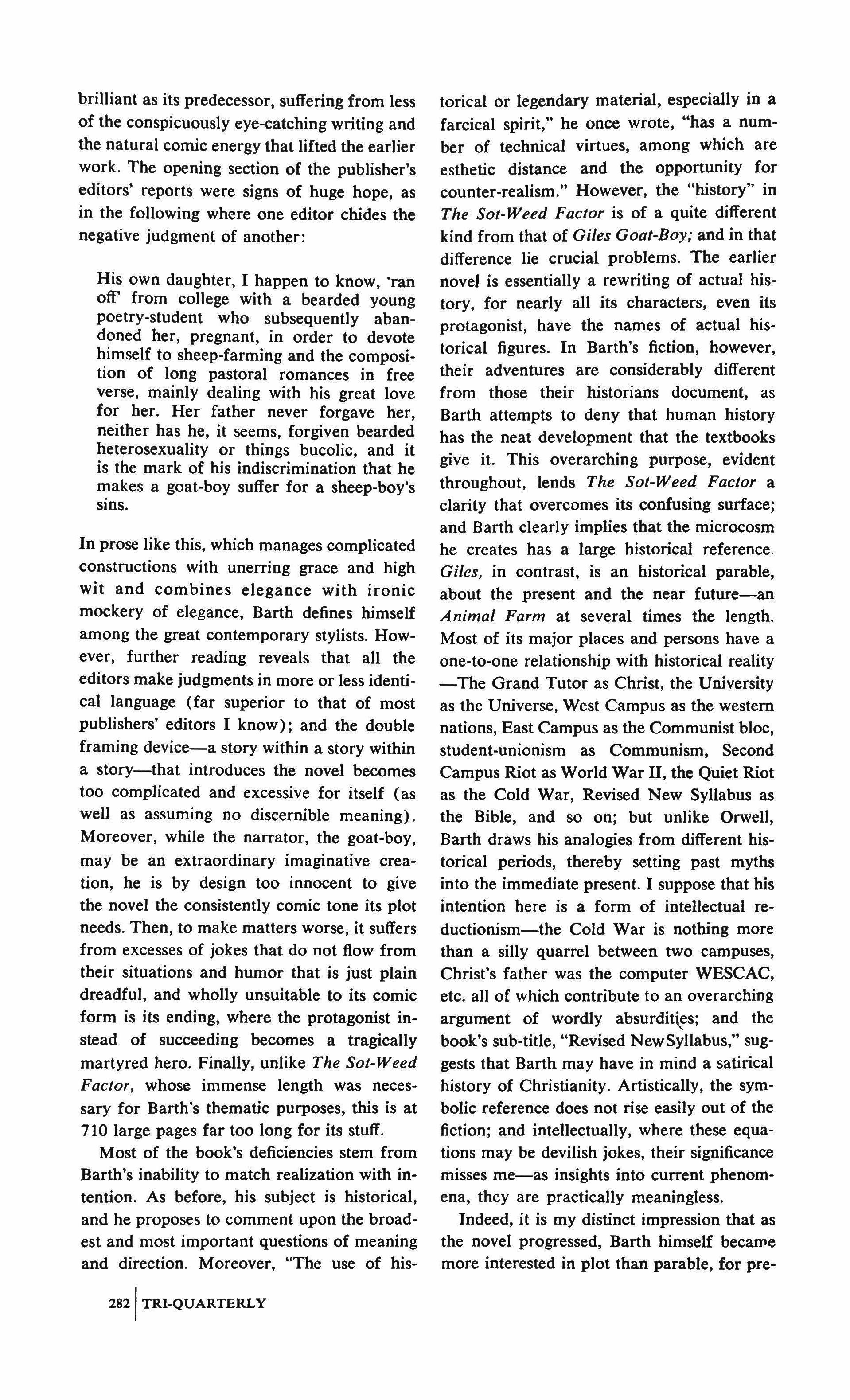 torical or legendary material, especially in a farcical spirit," he once wrote, "has a number of technical virtues, among which are esthetic distance and the opportunity for counter-realism." However, the "history" in The Sot-Weed Factor is of a quite different kind from that of Giles Goat-Boy; and in that difference lie crucial problems. The earlier novel is essentially a rewriting of actual history, for nearly all its characters, even its protagonist, have the names of actual historical figures. In Barth's fiction, however, their adventures are considerably different from those their historians document, as Barth attempts to deny that human history has the neat development that the textbooks give it. This overarching purpose, evident throughout, lends The Sot-Weed Factor a clarity that overcomes its confusing surface; and Barth clearly implies that the microcosm he creates has a large historical reference. Giles, in contrast, is an historical parable, about the present and the near future-an Animal Farm at several times the length. Most of its major places and persons have a one-to-one relationship with historical reality -The Grand Tutor as Christ, the University as the Universe, West Campus as the western nations, East Campus as the Communist bloc, student-unionism as Communism, Second Campus Riot as World War II, the Quiet Riot as the Cold War, Revised New Syllabus as the Bible, and so on; but unlike Orwell, Barth draws his analogies from different historical periods, thereby setting past myths into the immediate present. I suppose that his intention here is a form of intellectual reductionism-the Cold War is nothing more than a silly quarrel between two campuses, Christ's father was the computer WESCAC, etc. all of which contribute to an overarching argument of wordly absurdities; and the book's sub-title, "Revised NewSyllabus," suggests that Barth may have in mind a satirical history of Christianity. Artistically, the symbolic reference does not rise easily out of the fiction; and intellectually, where these equations may be devilish jokes, their significance misses me-as insights into current phenomena, they are practically meaningless.