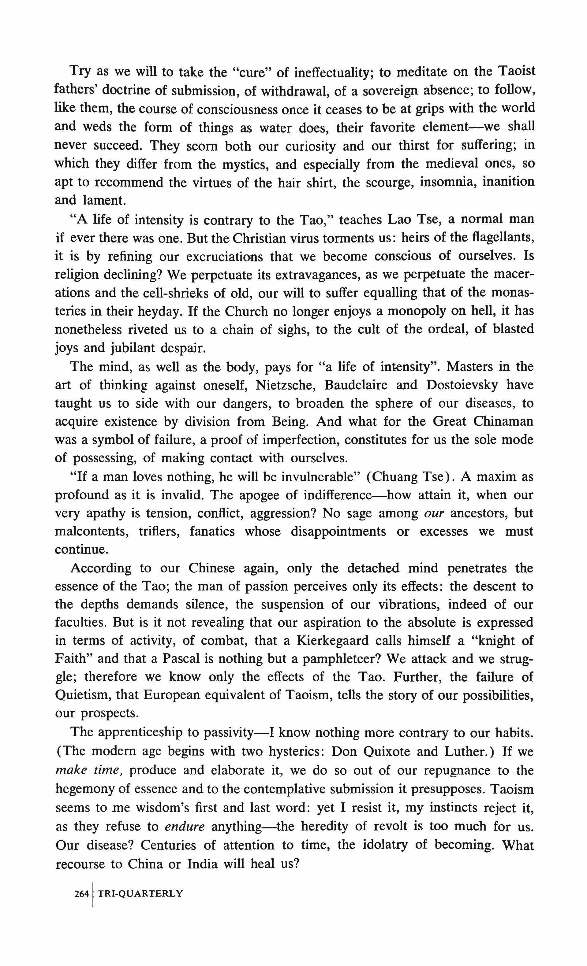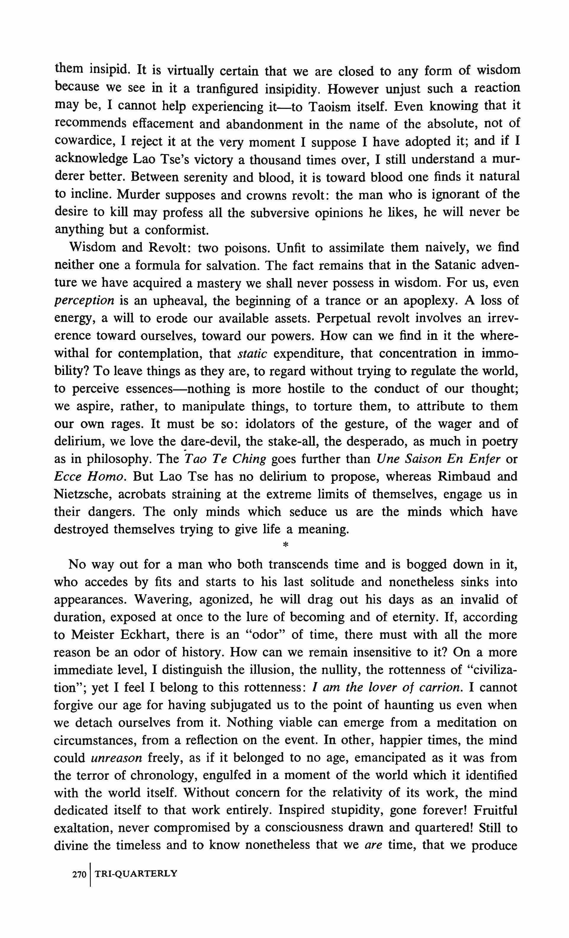 Wisdom and Revolt: two poisons. Unfit to assimilate them naively, we find neither one a formula for salvation. The fact remains that in the Satanic adventure we have acquired a mastery we shall never possess in wisdom. For us, even perception is an upheaval, the beginning of a trance or an apoplexy. A loss of energy, a will to erode our available assets. Perpetual revolt involves an irreverence toward ourselves, toward our powers. How can we find in it the wherewithal for contemplation, that static expenditure, that concentration in immobility? To leave things as they are, to regard without trying to regulate the world, to perceive essences-nothing is more hostile to the conduct of our thought; we aspire, rather, to manipulate things, to torture them, to attribute to them our own rages. It must be so: idolators of the gesture, of the wager and of delirium, we love the �are-devil, the stake-all, the desperado, as much in poetry as in philosophy. The Tao Te Ching goes further than Une Saison En Enier or Ecce Homo. But Lao Tse has no delirium to propose, whereas Rimbaud and Nietzsche, acrobats straining at the extreme limits of themselves, engage us in their dangers. The only minds which seduce us are the minds which have destroyed themselves trying to give life a meaning.