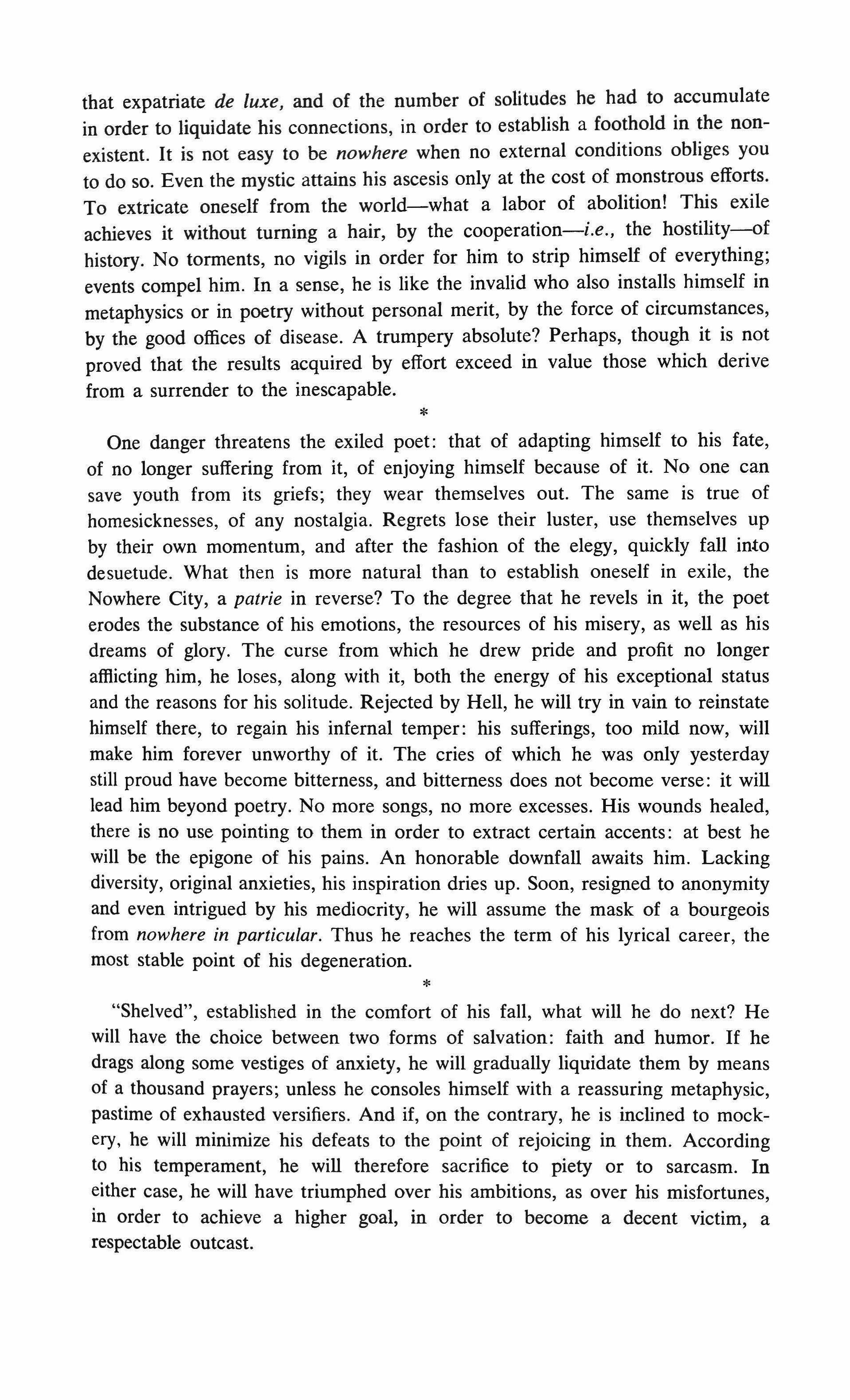 One danger threatens the exiled poet: that of adapting himself to his fate, of no longer suffering from it, of enjoying himself because of it. No one can save youth from its griefs; they wear themselves out. The same is true of homesicknesses, of any nostalgia. Regrets lose their luster, use themselves up by their own momentum, and after the fashion of the elegy, quickly fall into desuetude. What then is more natural than to establish oneself in exile, the Nowhere City, a patrie in reverse? To the degree that he revels in it, the poet erodes the substance of his emotions, the resources of his misery, as well as his dreams of glory. The curse from which he drew pride and profit no longer afflicting him, he loses, along with it, both the energy of his exceptional status and the reasons for his solitude. Rejected by Hell, he will try in vain to reinstate himself there, to regain his infernal temper: his sufferings, too mild now, will make him forever unworthy of it. The cries of which he was only yesterday still proud have become bitterness, and bitterness does not become verse: it will lead him beyond poetry. No more songs, no more excesses. His wounds healed, there is no use pointing to them in order to extract certain accents: at best he will be the epigone of his pains. An honorable downfall awaits him. Lacking diversity, original anxieties, his inspiration dries up. Soon, resigned to anonymity and even intrigued by his mediocrity, he will assume the mask of a bourgeois from nowhere in particular. Thus he reaches the term of his lyrical career, the most stable point of his degeneration.