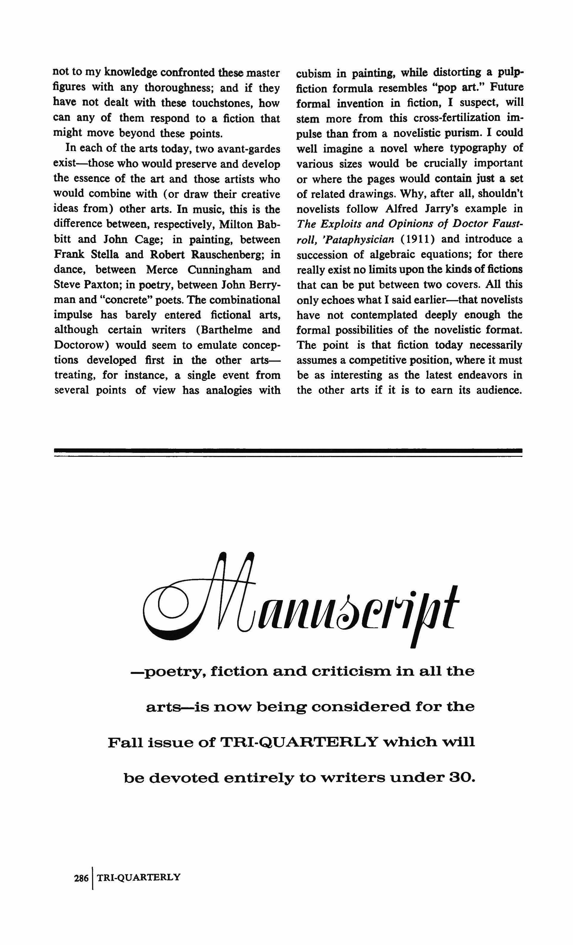 cubism in painting, while distorting a pulpfiction formula resembles "pop art." Future formal invention in fiction, I suspect, will stem more from this cross-fertilization impulse than from a novelistic purism. I could well imagine a novel where typography of various sizes would be crucially important or where the pages would contain just a set of related drawings. Why, after all, shouldn't novelists follow Alfred Jarry's example in The Exploits and Opinions of Doctor Faustroll, 'Pataphysician (1911) and introduce a succession of algebraic equations; for there really exist no limits upon the kinds of fictions that can be put between two covers. All this only echoes what I said earlier-that novelists have not contemplated deeply enough the formal possibilities of the novelistic format. The point is that fiction today necessarily assumes a competitive position, where it must be as interesting as the latest endeavors in the other arts if it is to earn its audience.