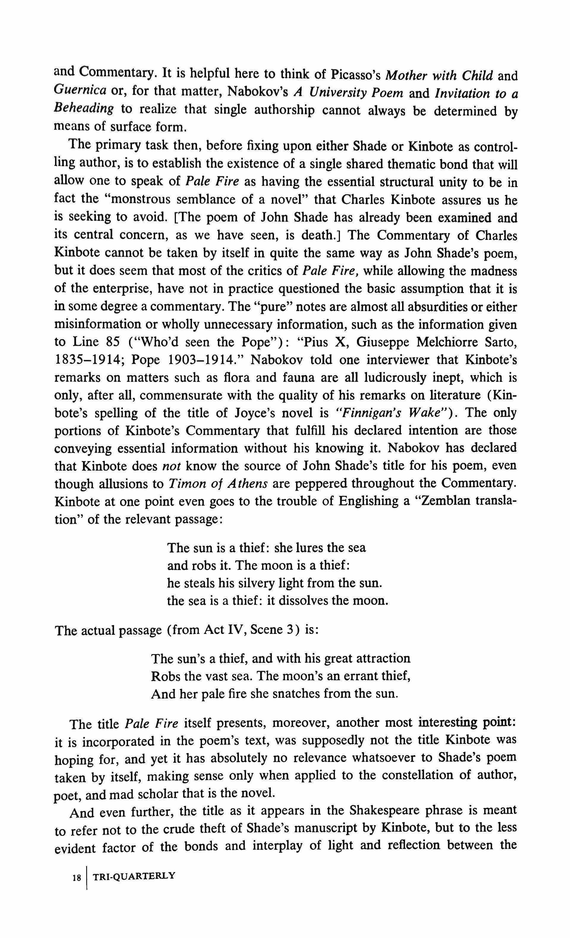 The primary task then, before fixing upon either Shade or Kinbote as controlling author, is to establish the existence of a single shared thematic bond that will allow one to speak of Pale Fire as having the essential structural unity to be in fact the "monstrous semblance of a novel" that Charles Kinbote assures us he is seeking to avoid. [The poem of John Shade has already been examined and its central concern, as we have seen, is death.] The Commentary of Charles Kinbote cannot be taken by itself in quite the same way as John Shade's poem, but it does seem that most of the critics of Pale Fire, while allowing the madness of the enterprise, have not in practice questioned the basic assumption that it is in some degree a commentary. The "pure" notes are almost all absurdities or either misinformation or wholly unnecessary information, such as the information given to Line 85 ("Who'd seen the Pope"): "Pius X, Giuseppe Melchiorre Sarto, 1835-1914; Pope 1903-1914." Nabokov told one interviewer that Kinbote's remarks on matters such as flora and fauna are all ludicrously inept, which is only, after all, commensurate with the quality of his remarks on literature (Kinbote's spelling of the title of Joyce's novel is "Finnigan's Wake"). The only portions of Kinbote's Commentary that fulfill his declared intention are those conveying essential information without his knowing it. Nabokov has declared that Kinbote does not know the source of John Shade's title for his poem, even though allusions to Timon of Athens are peppered throughout the Commentary. Kinbote at one point even goes to the trouble of Englishing a "Zemblan translation" of the relevant passage: