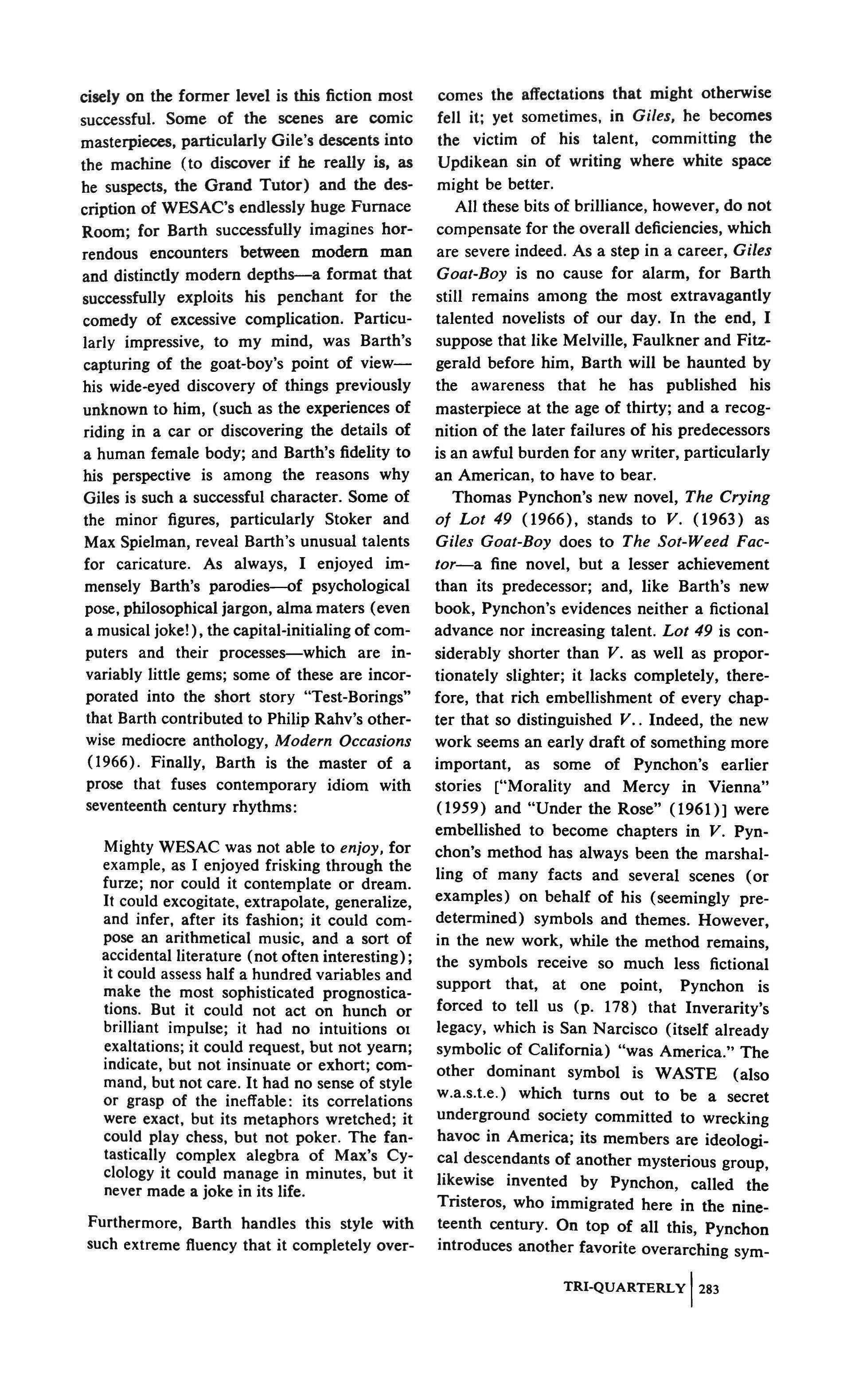 Thomas Pynchon's new novel, The Crying of Lot 49 (1966), stands to V. (1963) as Giles Goat-Boy does to The Sot-Weed Factor-a fine novel, but a lesser achievement than its predecessor; and, like Barth's new book, Pynchon's evidences neither a fictional advance nor increasing talent. Lot 49 is considerably shorter than V. as well as proportionately slighter; it lacks completely, therefore, that rich embellishment of every chapter that so distinguished V.. Indeed, the new work seems an early draft of something more important, as some of Pynchon's earlier stories ["Morality and Mercy in Vienna" (1959) and "Under the Rose" (1961)] were embellished to become chapters in V. Pynchon's method has always been the marshalling of many facts and several scenes (or examples) on behalf of his (seemingly predetermined) symbols and themes. However, in the new work, while the method remains, the symbols receive so much less fictional support that, at one point, Pynchon is forced to tell us (p. 178) that Inverarity's legacy, which is San Narcisco (itself already symbolic of California) "was America." The other dominant symbol is WASTE (also w.a.s.t.e.) which turns out to be a secret underground society committed to wrecking havoc in America; its members are ideological descendants of another mysterious group, likewise invented by Pynchon, called the Tristeros, who immigrated here in the nineteenth century. On top of all this, Pynchon introduces another favorite overarching syrnTRI-QUARTERLy 1283
