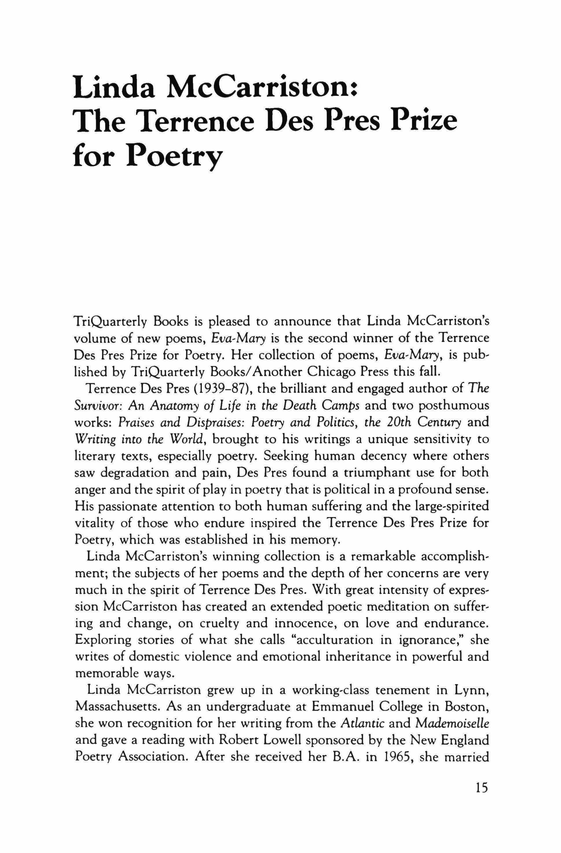 TriQuarterly Books is pleased to announce that Linda McCarriston's volume of new poems, Eva-Mary is the second winner of the Terrence Des Pres Prize for Poetry. Her collection of poems, Eva-Mary, is published by TriQuarterly Books/Another Chicago Press this fall.