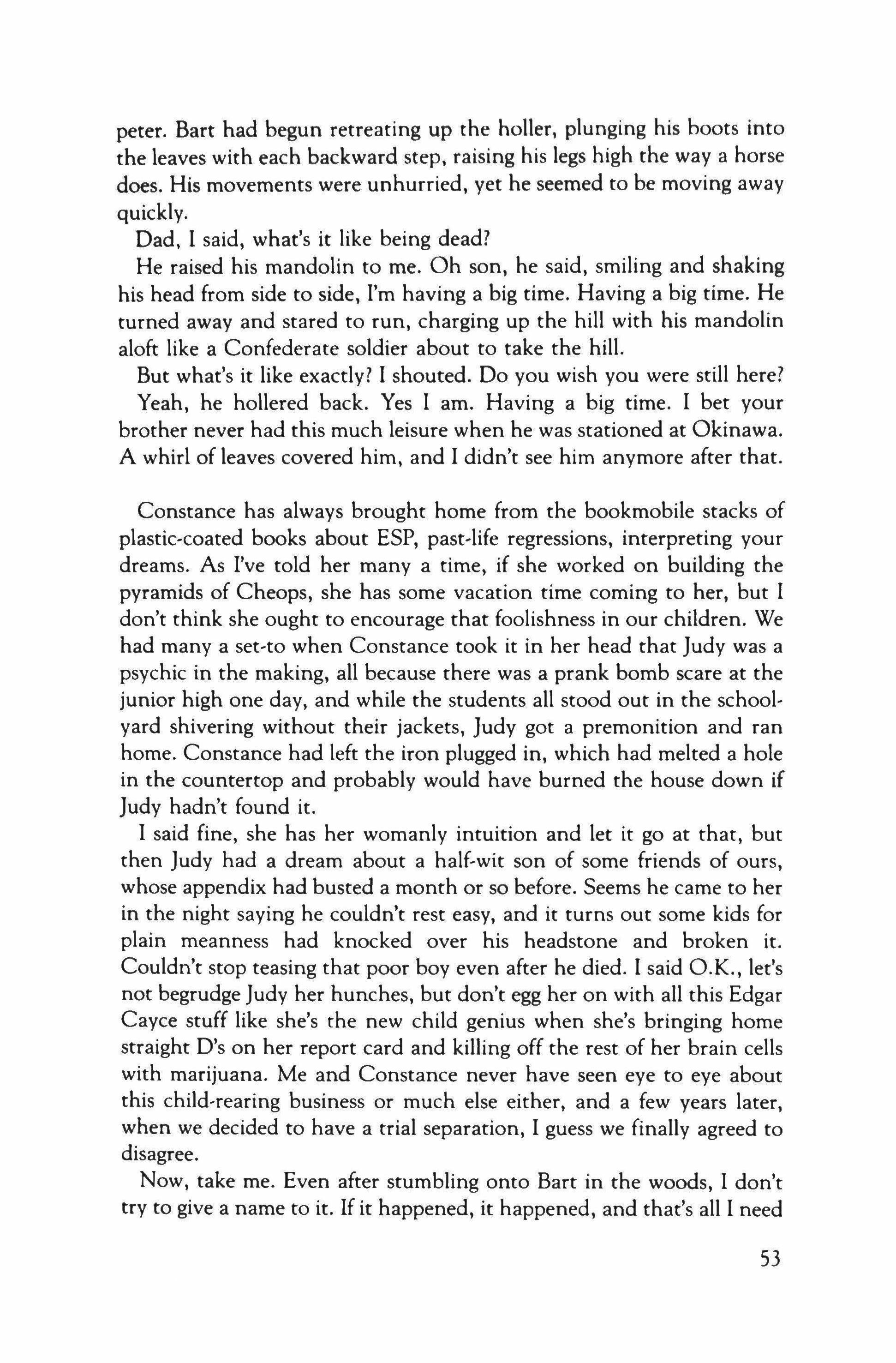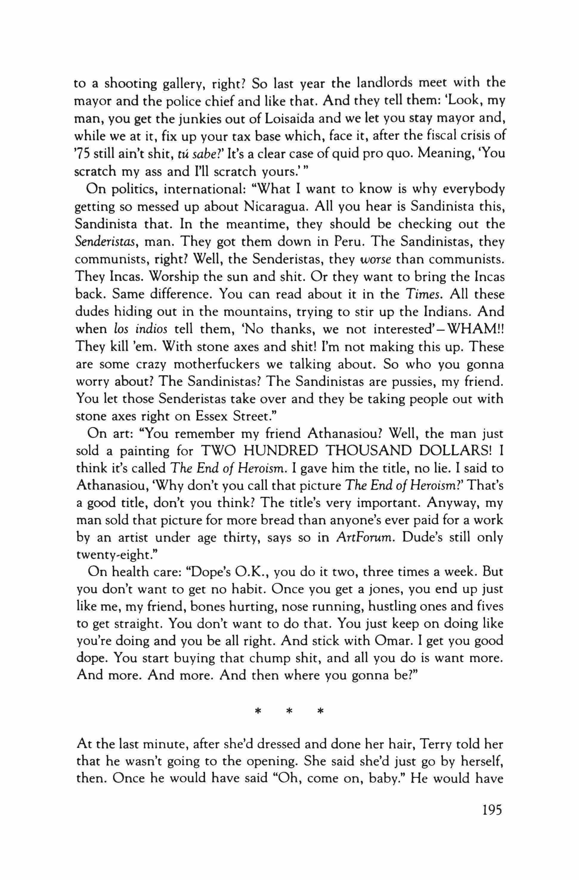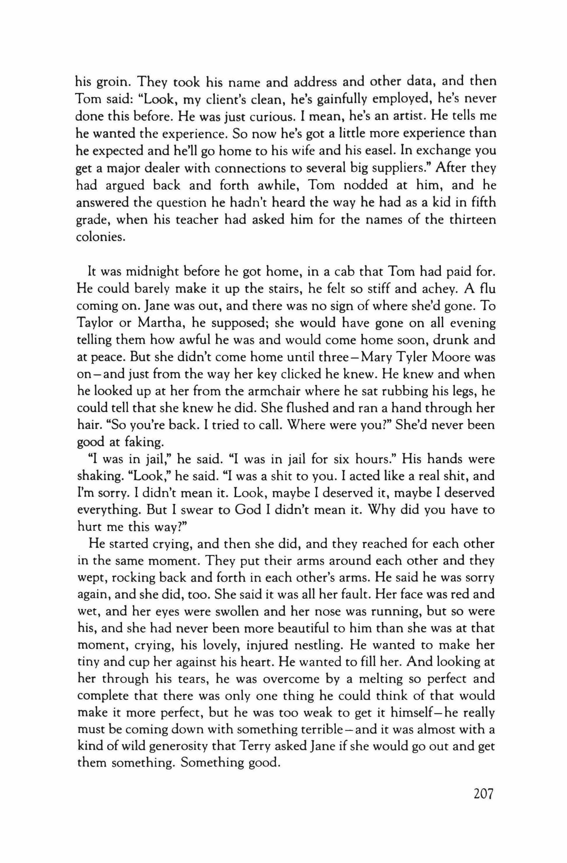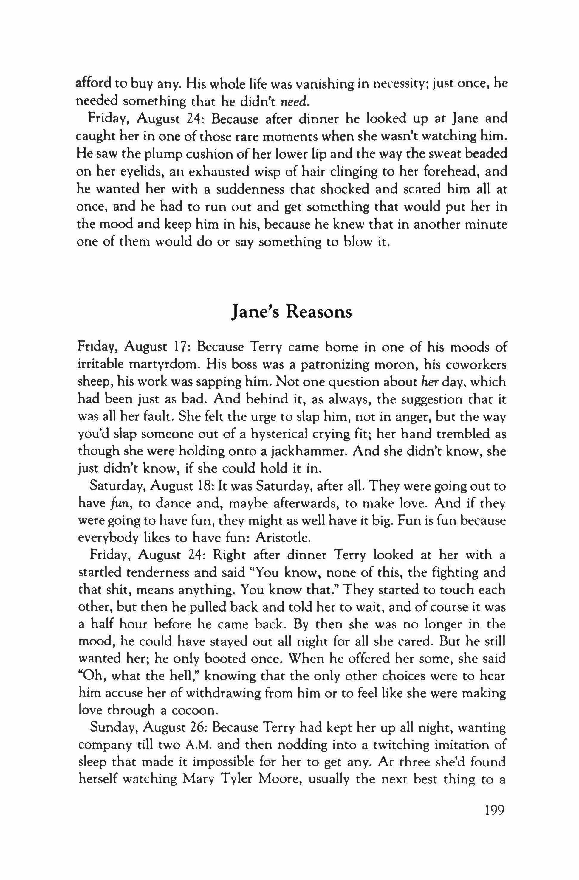 We stood there gazing out-you, the pro, silently studying The vast technical coloration, I, in a sudden plight Of libido, maniacally loosening my tie. It was, I guess, The Boodle's. Or else the far reaches of scarlet seascape. Or you, my love. I yearned. And led you back to Mrs. Trumpet'sAnd disaster! - where the bed broke down.