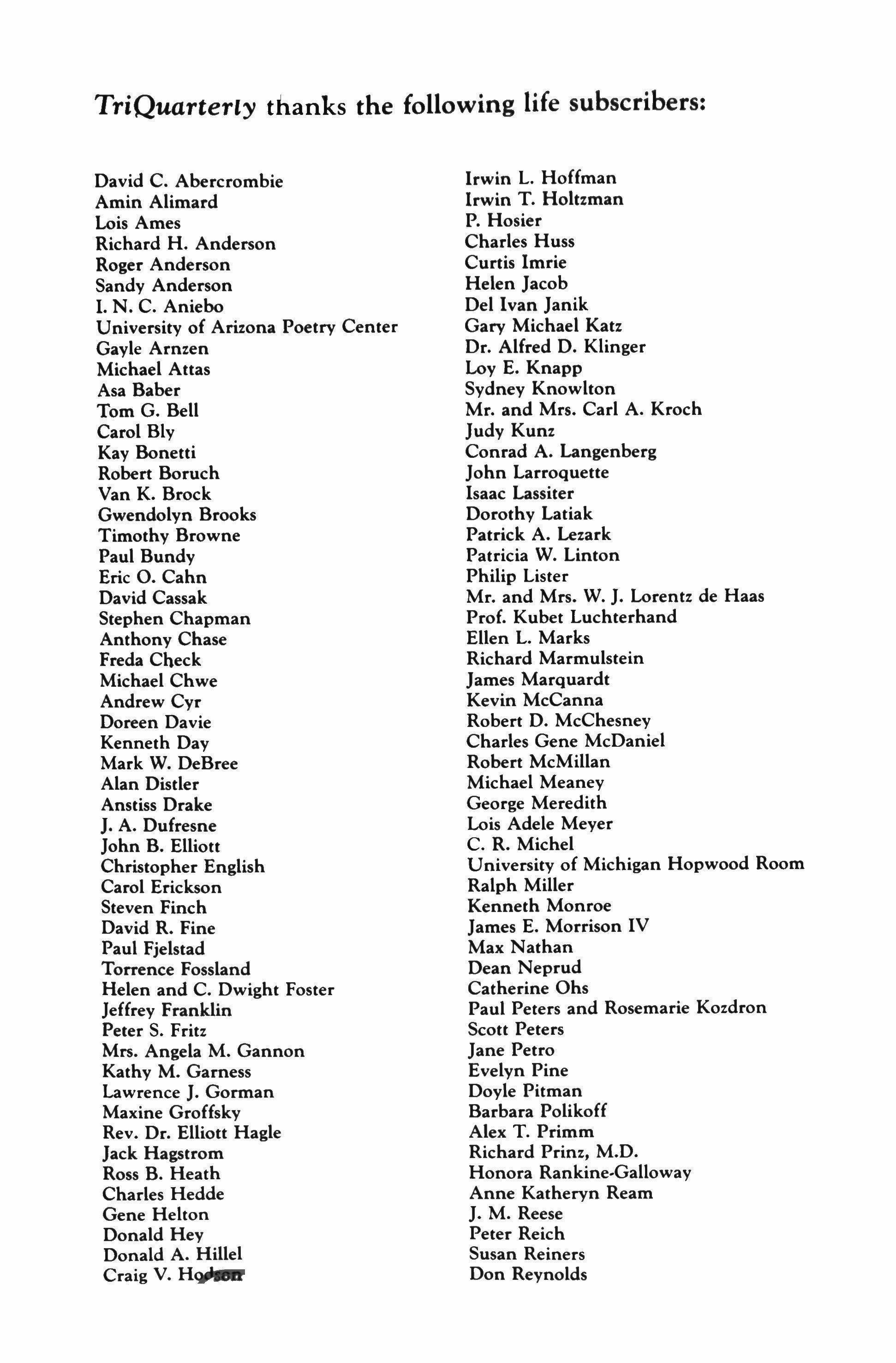 Publication of TriQuarterly is made possible in part by the donors of gifts and grants to the magazine. For their recent and continuing support, we are very pleased to thank the Illinois Arts Council, the John D. and Catherine T. MacArthur Foundation, the National Endowment for the Arts and the Witter Bvnner Foundation for Poetry, Inc.