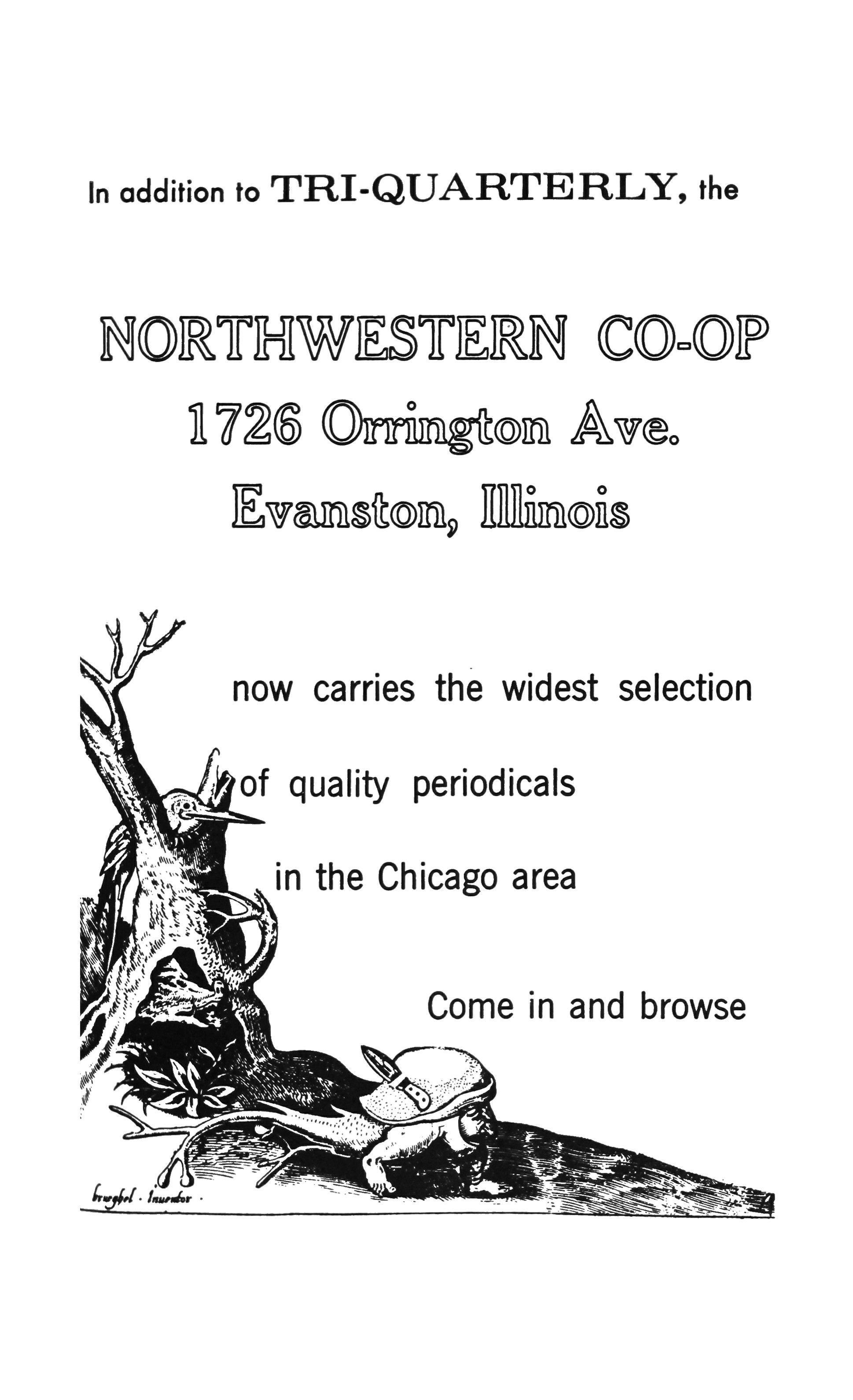 EDITOR: Charles Newman. MANAGI'NG EDITOR: William A. Henkin, Jr. SECRETARY: Valerie Nelson. ART DIRECtORS: Lauretta Akkeron, Anne Long. ADVISORY EDITOR: Marcia Lee Masters Schmid. DESIGN CONSULTANT: Lawrence Levy. BUSINESS: Suzanne Kurman, SUBSCRIPIIONS AND ADVERTISING: Peggy Balles. CIRCULATION: Barbara Urbanczyk. PHOTOGRAPHY: Gabor Ujvary. ASSOCIATES: C. Colton Johnson, Joel Pondelik, Mary Kinzie. The Trl-Quarterly is a national journal of arts, letters and opinion, published in the fall, winter and spring at Northwestern University, Evanston, Illinois. Subscription rates: $4.00 yearly within the United States; $4.25 Canada and Mexico, $4.75 Foreign. Single copies will be sold for $1.50. Contributions, correspondence and subscriptions should be addressed to Tri-Quarterly, University Hall lOi, Northwestern University, Evanston, Illinois. Unsolicited manuscripts are welcome, but will not be returned unless accompanied by a self-addressed stamped envelope. Copyright © 1967 by Northwestern University Press. All rights reserved. The views expressed In this magazine are to be attributed to the writers, not the editors or sponsors.