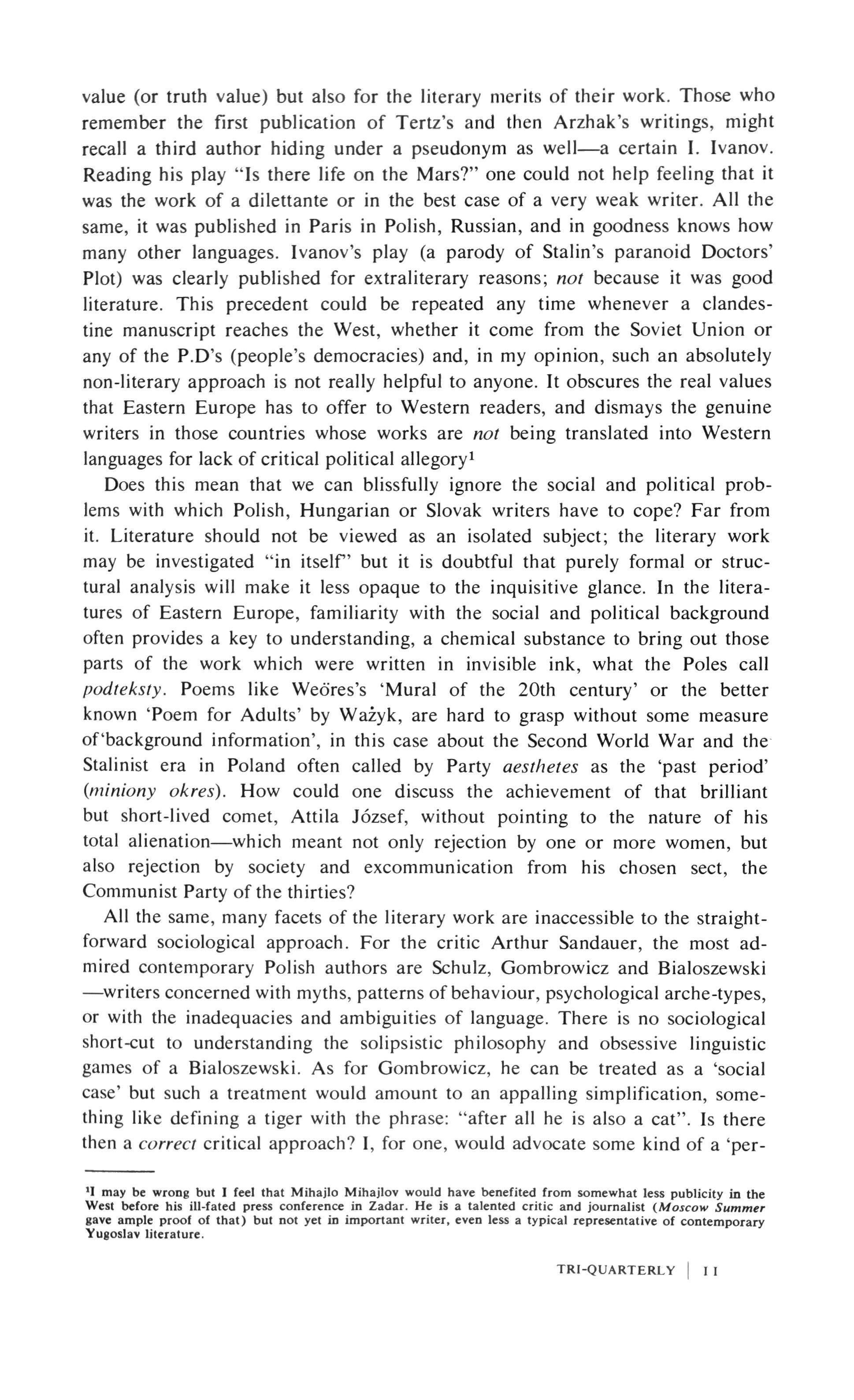 value (or truth value) but also for the literary merits of their work. Those who remember the first publication of Tertz's and then Arzhak's writings, might recall a third author hiding under a pseudonym as well a certain I. Ivanov. Reading his play "Is there life on the Mars?" one could not help feeling that it was the work of a dilettante or in the best case of a very weak writer. All the same, it was published in Paris in Polish, Russian, and in goodness knows how many other languages. Ivanov's play (a parody of Stalin's paranoid Doctors' Plot) was clearly published for extraliterary reasons; not because it was good literature. This precedent could be repeated any time whenever a clandestine manuscript reaches the West, whether it come from the Soviet Union or any of the P.D's (people's democracies) and, in my opinion, such an absolutely non-literary approach is not really helpful to anyone. It obscures the real values that Eastern Europe has to offer to Western readers, and dismays the genuine writers in those countries whose works are not being translated into Western languages for lack of critical political allegory!