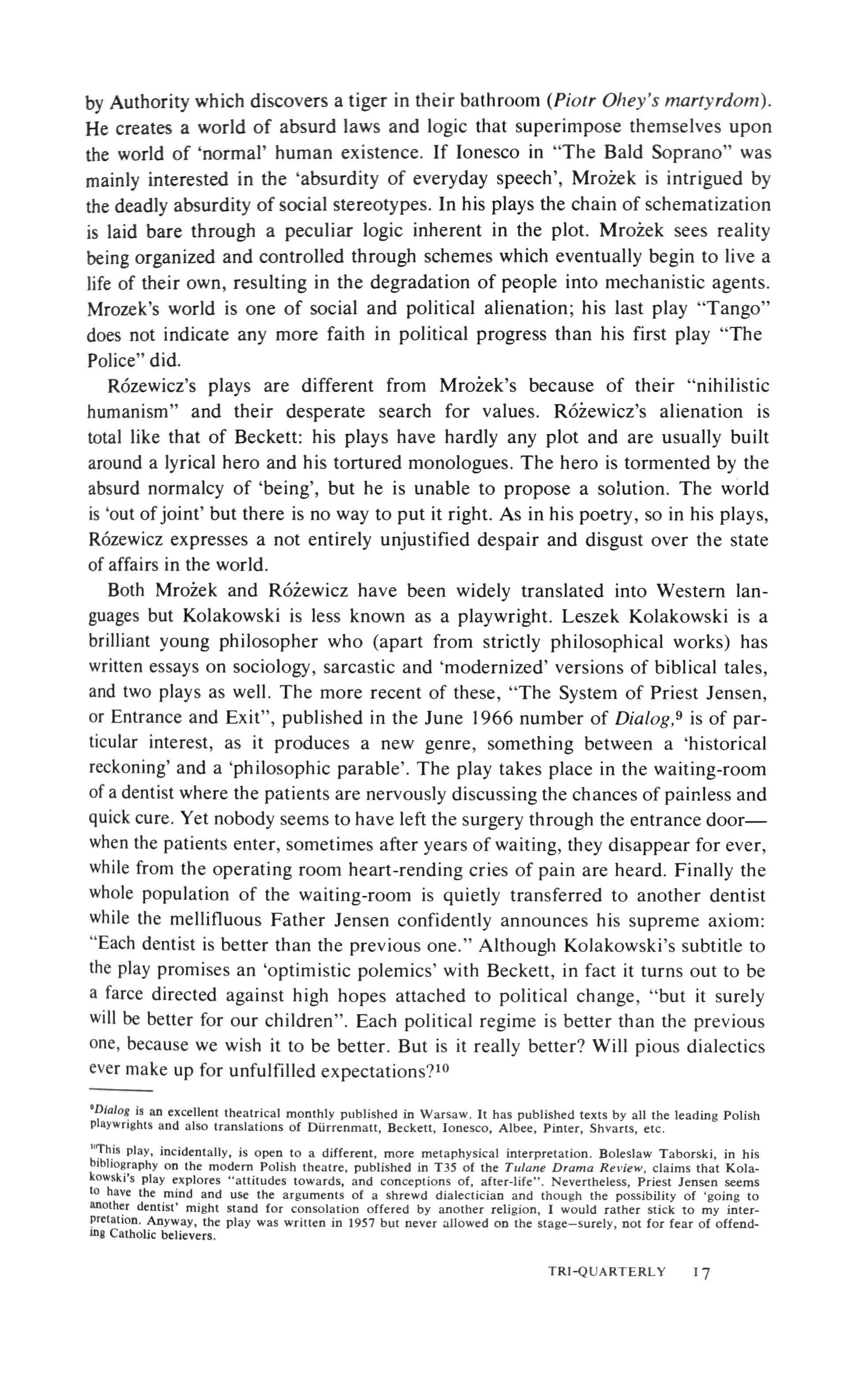 In editing this number of the Tri-Quarterly I was partial to such trends manifest in East European literature which in one way or another link up with modern trends in the rest of Europe. I have sought contributions on writers and poets who, even if they did not belong to the then 'Avantgarde' movements, were precursors to the literature of the nineteen-fifties and -sixties (Witkiewicz, Gombrowicz, Attila Josef) and writings by or about such authors who while seeking for new means of expression, have already established themselves in their respective countries as important continuators of the critical and demythologizing tradition of Western Europe (Dery, Hay, Andrzejewski). I consciously ignored literature which bases its appeal on local, narrowly nationalistic or sectarian interests; and while I believed that the most challenging writers, poets and thinkers of Central and Eastern Europe should be represented in this number, it was not always possible to present their best or most mature work, or discuss the books which brought them the greatest acclaim. Copyright problems, political and other obstacles arose; in one case a contributor living in an Eastern European country had to back out of his earlier commitment, whether under official pressure or not, is hard to say. This number does not pretend to offer a complete picture of aLL interesting trends and major writers in Eastern Europe, selectiveness inevitably meant exclusion of some obvious names, and the reluctant omission of valuable material which seemed to have less relevance to the central preoccupations of contemporary European literature.