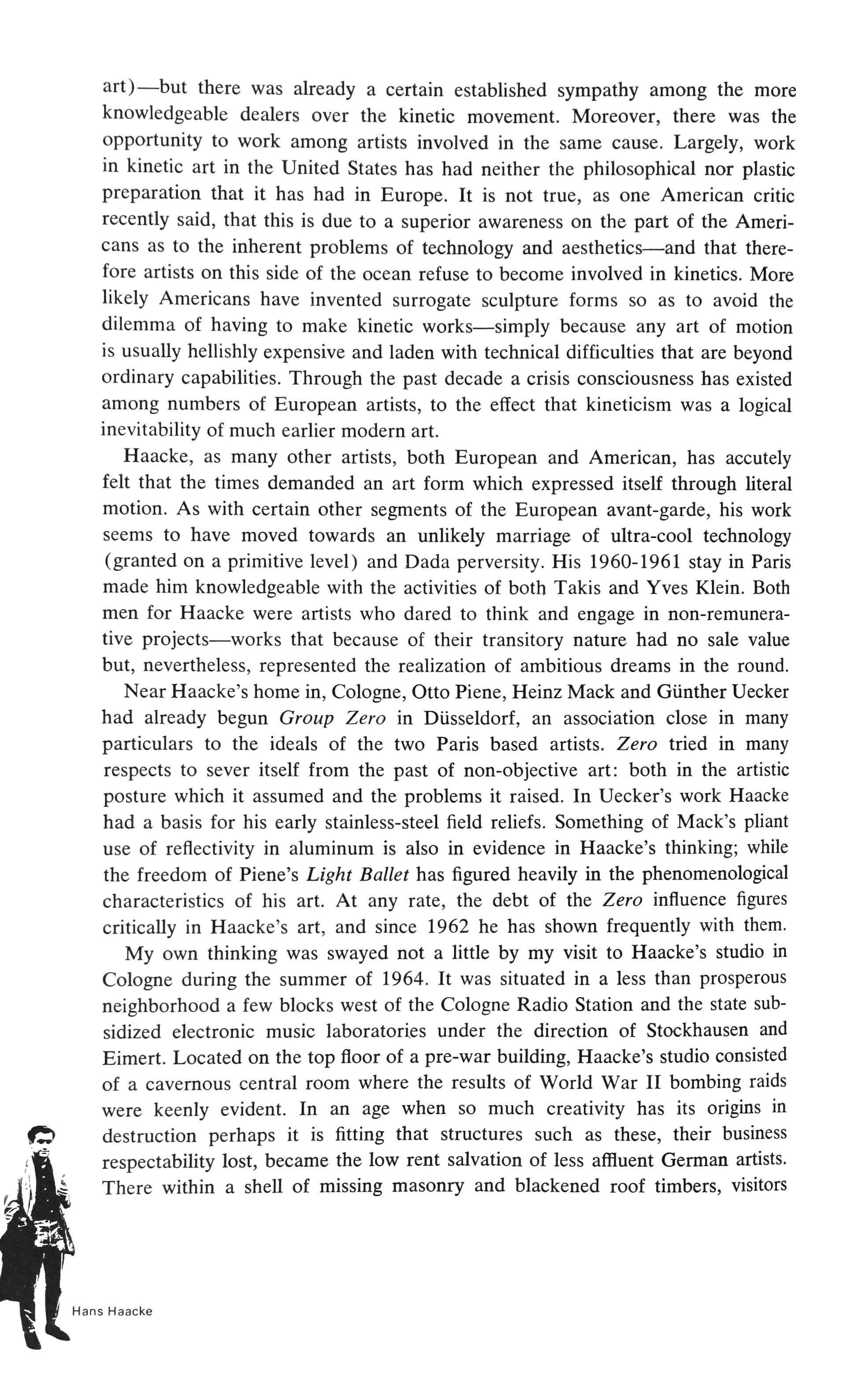 During the spring of 1966 Haacke felt that a prime opportunity for such a monumental undertaking was at hand. A "Zero on the Sea" festival, all expenses paid, was to be sponsored at Scheveningen, Holland, by the local tourist agency. In a letter just before the trip Haacke wrote in great excitement of some of his proposed undertakings out on the Scheveningen pier.
